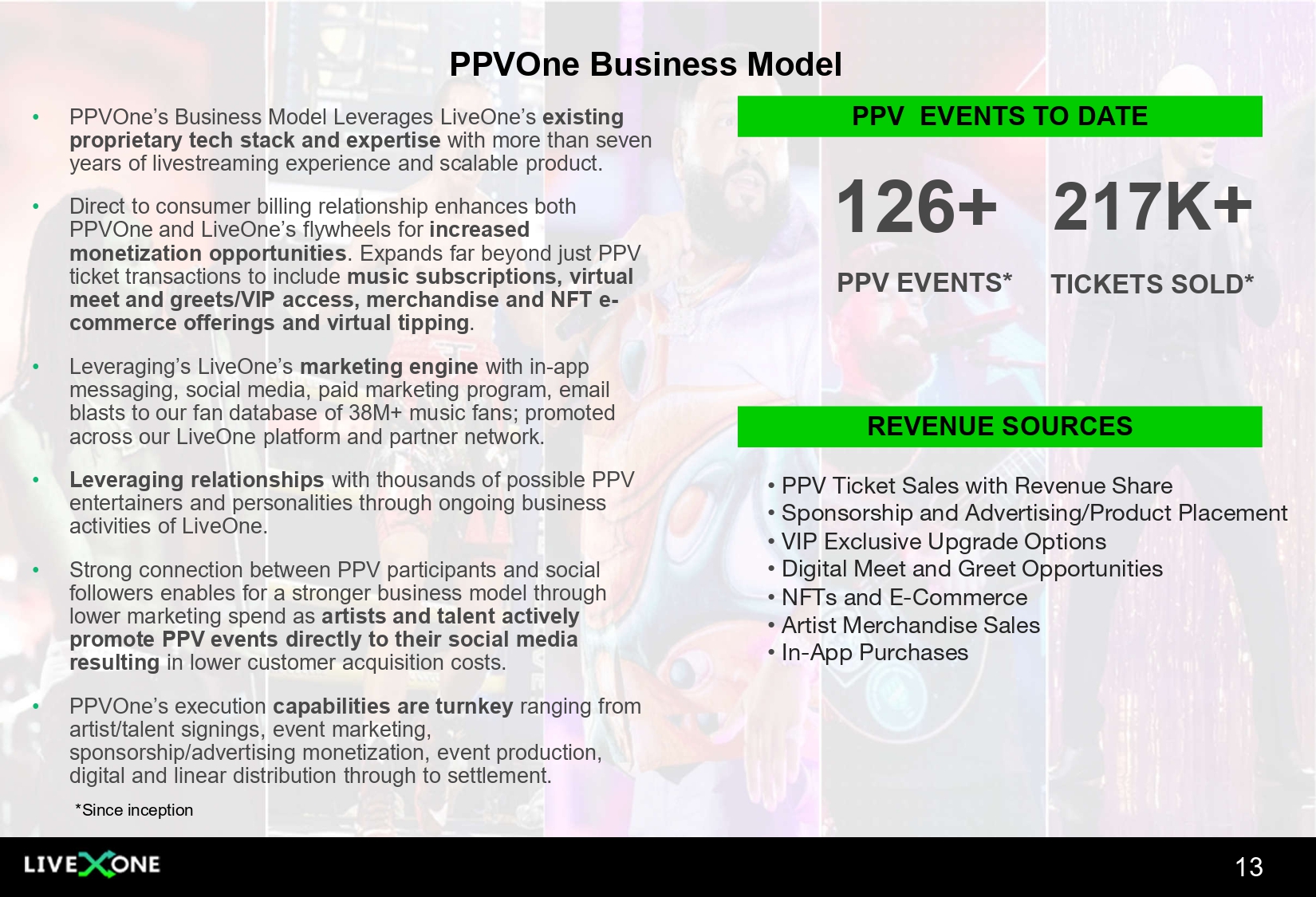 PPVOne Business Model 126+ PPV EVENTS* 217K + TICKETS SOLD* PPV EVENTS TO DATE REVENUE SOURCES • PPV Ticket Sales with Revenue Share • Sponsorship and Advertising/Product Placement • VIP Exclusive Upgrade Options • Digital Meet and Greet Opportunities • NFTs and E - Commerce • Artist Merchandise Sales • In - App Purchases 13 • PPVOne’s Business Model Leverages LiveOne’s existing proprietary tech stack and expertise with more than seven years of livestreaming experience and scalable product. • Direct to consumer billing relationship enhances both PPVOne and LiveOne’s flywheels for increased monetization opportunities . Expands far beyond just PPV ticket transactions to include music subscriptions, virtual meet and greets/VIP access, merchandise and NFT e - commerce offerings and virtual tipping . • Leveraging’s LiveOne’s marketing engine with in - app messaging, social media, paid marketing program, email blasts to our fan database of 38M+ music fans; promoted across our LiveOne platform and partner network. • Leveraging relationships with thousands of possible PPV entertainers and personalities through ongoing business activities of LiveOne. • Strong connection between PPV participants and social followers enables for a stronger business model through lower marketing spend as artists and talent actively promote PPV events directly to their social media resulting in lower customer acquisition costs. • PPVOne’s execution capabilities are turnkey ranging from artist/talent signings, event marketing, sponsorship/advertising monetization, event production, digital and linear distribution through to settlement. *Since inception