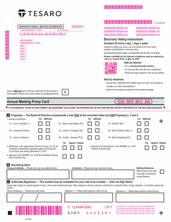 Using a black ink pen, mark your votes with an X as shown in this example. Please do not write outside the designated areas. X 021AFB 9 3 D V + Annual Meeting Proxy Card . Authorized Signatures — This section must be completed for your vote to be counted. — Date and Sign Below C Please sign exactly as name(s) appears hereon. Joint owners should each sign. When signing as attorney, executor, administrator, corporate officer, trustee, guardian, or custodian, please give full title. Signature 1 — Please keep signature within the box. Signature 2 — Please keep signature within the box. Date (mm/dd/yyyy) — Please print date below. + Change of Address — Please print your new address below. Comments — Please print your comments below. B Non-Voting Items A Proposals — The Board of Directors recommends a vote FOR all the nominees listed and FOR Proposals 2, 3 and 4. For Against Abstain 2. Ratification of the appointment of Ernst & Young, LLP as the Company’s independent registered public accounting firm for the fiscal year ending December 31, 2015 Meeting Attendance Mark the box to the right if you plan to attend the Annual Meeting. 01 - Leon O. Moulder, Jr. 04 - Lawrence M. Alleva 07 - Garry A. Nicholson 02 - Mary Lynne Hedley, Ph.D. 05 - James O. Armitage, M.D. 08 - Arnold L. Oronsky, Ph.D. 03 - David M. Mott 06 - Earl M. (Duke) Collier, Jr. 1. Election of Directors: For Withhold For Withhold For Withhold IMPORTANT ANNUAL MEETING INFORMATION 09 - Beth Seidenberg, M.D. For Against Abstain 3. Approval of the amendment to the TESARO, Inc. 2012 Omnibus Incentive Plan 4. Approval of the TESARO, Inc. 2015 Non-Employee Director Stock Incentive Plan MMMMMMMMMMMM MMMMMMMMMMMMMMM 000000000.000000 ext 000000000.000000 ext 000000000.000000 ext 000000000.000000 ext 000000000.000000 ext 000000000.000000 ext 000004 MR A SAMPLE DESIGNATION (IF ANY) ADD 1 ADD 2 ADD 3 ADD 4 ADD 5 ADD 6 ENDORSEMENT_LINE______________ SACKPACK_____________ 1234 5678 9012 345 MMMMMMM 2 3 4 5 3 8 1 MR A SAMPLE (THIS AREA IS SET UP TO ACCOMMODATE 140 CHARACTERS) MR A SAMPLE AND MR A SAMPLE AND MR A SAMPLE AND MR A SAMPLE AND MR A SAMPLE AND MR A SAMPLE AND MR A SAMPLE AND MR A SAMPLE AND MMMMMMMMM C 1234567890 J N T C123456789 qIF YOU HAVE NOT VOTED VIA THE INTERNET OR TELEPHONE, FOLD ALONG THE PERFORATION, DETACH AND RETURN THE BOTTOM PORTION IN THE ENCLOSED ENVELOPE.q Electronic Voting Instructions Available 24 hours a day, 7 days a week! Instead of mailing your proxy, you may choose one of the voting methods outlined below to vote your proxy. VALIDATION DETAILS ARE LOCATED BELOW IN THE TITLE BAR. Proxies submitted by the Internet or telephone must be received by 1:00 a.m., Central Time, on May 14, 2015. Vote by Internet • Go to www.investorvote.com/tsro • Or scan the QR code with your smartphone • Follow the steps outlined on the secure website Vote by telephone • Call toll free 1-800-652-VOTE (8683) within the USA, US territories & Canada on a touch tone telephone • Follow the instructions provided by the recorded message |
