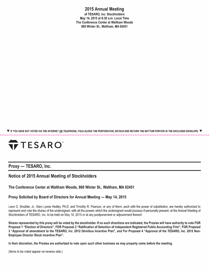 . Notice of 2015 Annual Meeting of Stockholders The Conference Center at Waltham Woods, 860 Winter St., Waltham, MA 02451 Proxy Solicited by Board of Directors for Annual Meeting — May 14, 2015 Leon O. Moulder, Jr., Mary Lynne Hedley, Ph.D. and Timothy R. Pearson, or any of them, each with the power of substitution, are hereby authorized to represent and vote the shares of the undersigned, with all the powers which the undersigned would possess if personally present, at the Annual Meeting of Stockholders of TESARO, Inc. to be held on May 14, 2015 or at any postponement or adjournment thereof. Shares represented by this proxy will be voted by the stockholder. If no such directions are indicated, the Proxies will have authority to vote FOR Proposal 1 “Election of Directors”, FOR Proposal 2 “Ratification of Selection of Independent Registered Public Accounting Firm”, FOR Proposal 3 “Approval of amendment to the TESARO, Inc. 2012 Omnibus Incentive Plan”, and For Proposal 4 “Approval of the TESARO, Inc. 2015 Non- Employee Director Stock Incentive Plan”. In their discretion, the Proxies are authorized to vote upon such other business as may properly come before the meeting. (Items to be voted appear on reverse side.) Proxy — TESARO, Inc. 2015 Annual Meeting of TESARO, Inc. Stockholders May 14, 2015 at 8:30 a.m. Local Time The Conference Center at Waltham Woods 860 Winter St., Waltham, MA 02451 qIF YOU HAVE NOT VOTED VIA THE INTERNET OR TELEPHONE, FOLD ALONG THE PERFORATION, DETACH AND RETURN THE BOTTOM PORTION IN THE ENCLOSED ENVELOPE.q |