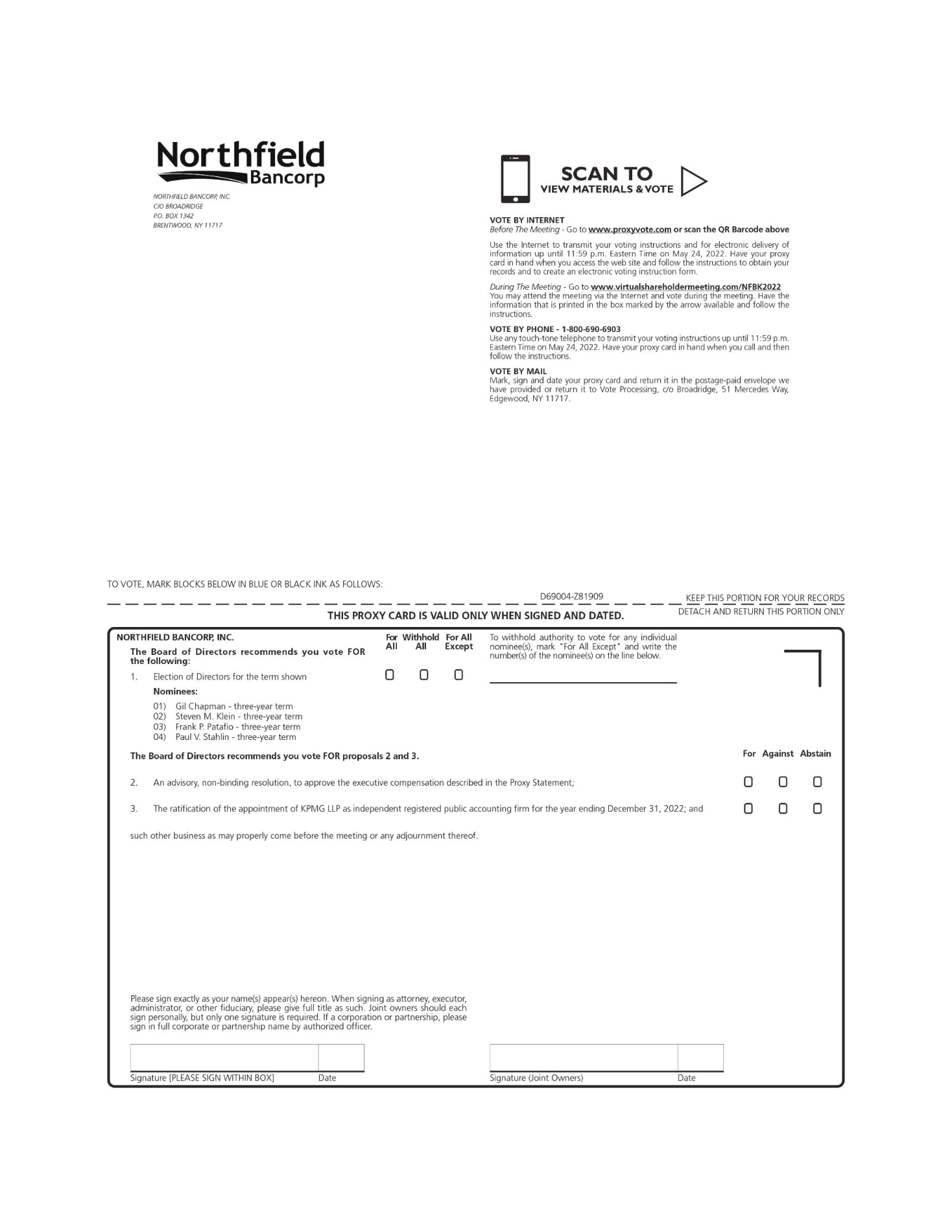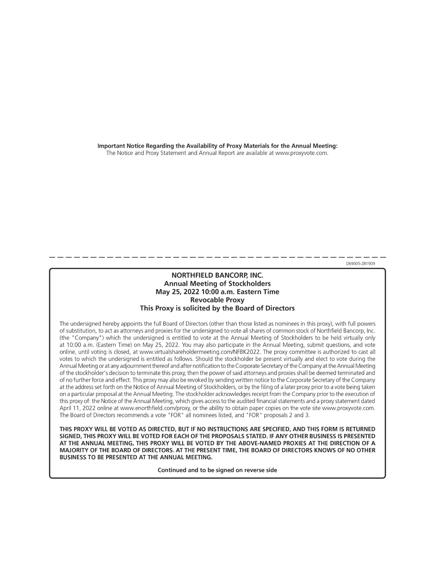 Aon also provided consultation to the Committee in the granting of equity awards under the Northfield Bancorp, Inc. 2019 Equity Incentive Plan (the “2019 EIP”) approved by the Bancorp’s stockholders on May 22, 2019 and commenced the annual market update of executive compensation for 2022.