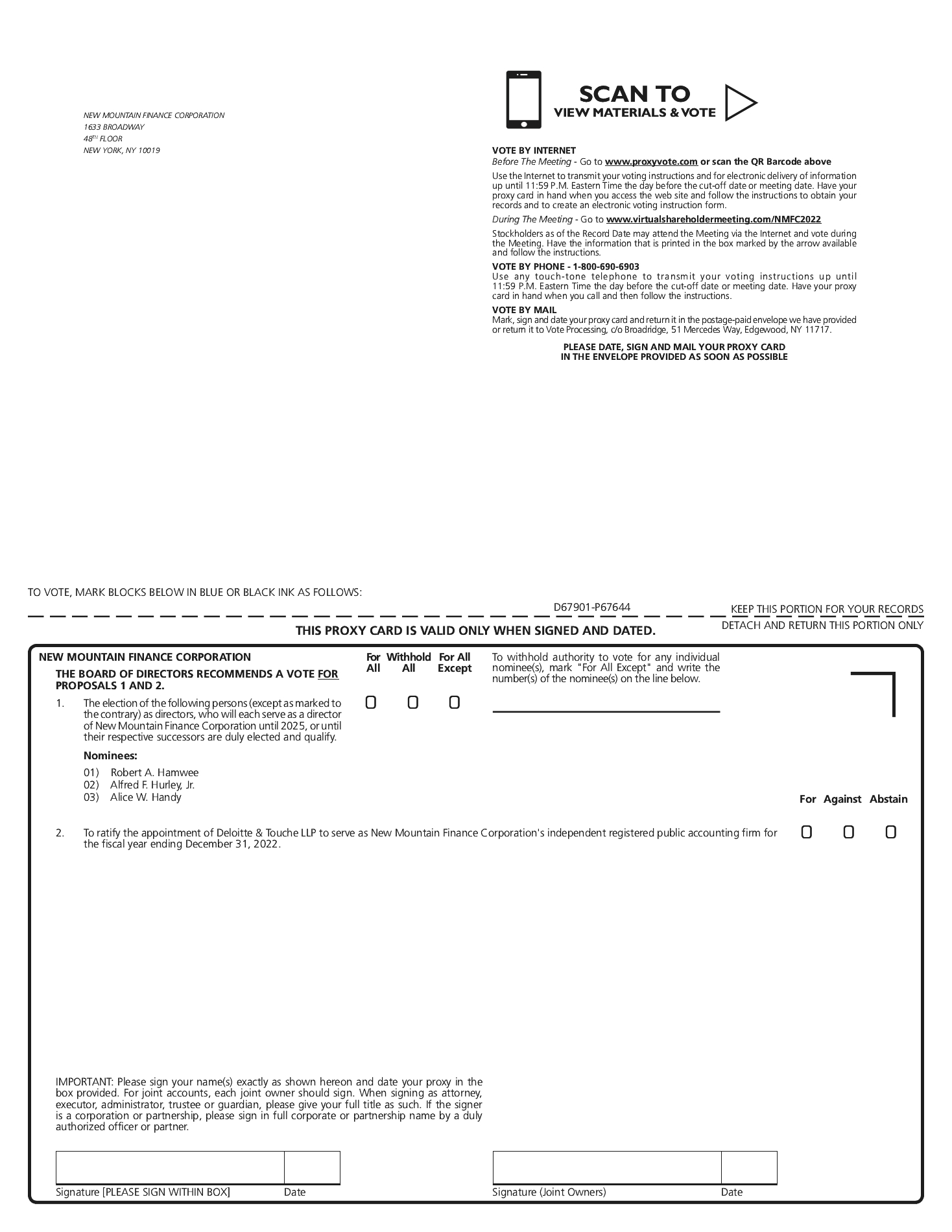 Pursuant to Amendment No. 1, the base management fee is calculated at an annual rate of 1.4% of the Company's gross assets, which equals the Company's total assets on the Consolidated Statements of Assets and Liabilities, less cash and cash equivalents. Prior to Amendment No. 1, pursuant to the Investment Management Agreement, the base management fee was calculated at an annual rate of 1.75% of the Company's gross assets, which equaled the Company's total assets on the Consolidated Statements of Assets and Liabilities, less (i) the borrowings under the New Mountain Finance SPV Funding, L.L.C. Loan and Security Agreement, as amended and restated, dated October 27, 2010 (the “SLF Credit Facility”) and (ii) cash and cash equivalents. The base management fee is payable quarterly in arrears, and is calculated based on the average value of the Company's gross assets, which equals the Company's total assets, as determined in accordance with GAAP, less cash and cash equivalents at the end of each of the two most recently completed calendar quarters, and appropriately adjusted on a pro rata basis for any equity capital raises or repurchases during the current calendar quarter. The Company has not invested, and currently is not invested, in derivatives. To the extent the Company invests in derivatives in the future, the Company will use the actual value of the derivatives, as reported on the Consolidated Statements of Assets and Liabilities, for purposes of calculating its base management fee.