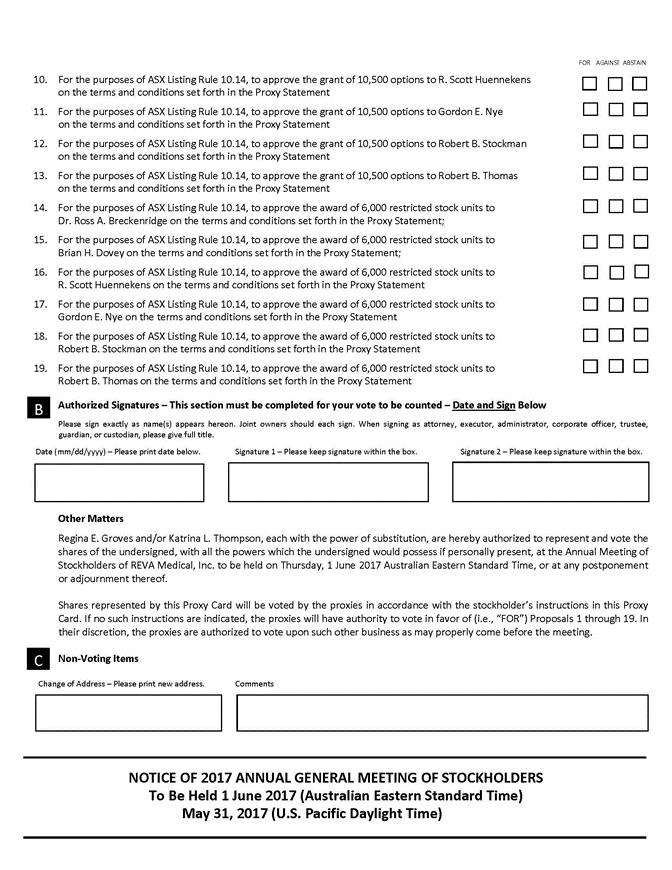 FOR AGAINST ABSTAIN 10. For the purposes of ASX Listing Rule 10.14, to approve the grant of 10,500 options to R. Scott Huennekens on the terms and conditions set forth in the Proxy Statement 11. For the purposes of ASX Listing Rule 10.14, to approve the grant of 10,500 options to Gordon E. Nye on the terms and conditions set forth in the Proxy Statement 12. For the purposes of ASX Listing Rule 10.14, to approve the grant of 10,500 options to Robert B. Stockman on the terms and conditions set forth in the Proxy Statement 13. For the purposes of ASX Listing Rule 10.14, to approve the grant of 10,500 options to Robert B. Thomas on the terms and conditions set forth in the Proxy Statement 14. For the purposes of ASX Listing Rule 10.14, to approve the award of 6,000 restricted stock units to Dr. Ross A. Breckenridge on the terms and conditions set forth in the Proxy Statement; 15. For the purposes of ASX Listing Rule 10.14, to approve the award of 6,000 restricted stock units to Brian H. Dovey on the terms and conditions set forth in the Proxy Statement; 16. For the purposes of ASX Listing Rule 10.14, to approve the award of 6,000 restricted stock units to R. Scott Huennekens on the terms and conditions set forth in the Proxy Statement 17. For the purposes of ASX Listing Rule 10.14, to approve the award of 6,000 restricted stock units to Gordon E. Nye on the terms and conditions set forth in the Proxy Statement 18. For the purposes of ASX Listing Rule 10.14, to approve the award of 6,000 restricted stock units to Robert B. Stockman on the terms and conditions set forth in the Proxy Statement 19. For the purposes of ASX Listing Rule 10.14, to approve the award of 6,000 restricted stock units to Robert B. Thomas on the terms and conditions set forth in the Proxy Statement B Authorized Signatures – This section must be completed for your vote to be counted – Date and Sign Below Please sign exactly as name(s) appears hereon. Joint owners should each sign. When signing as attorney, executor, administrator, corporate officer, trustee, guardian, or custodian, please give full title. Date (mm/dd/yyyy) – Please print date below. Signature 1 – Please keep signature within the box. Signature 2 – Please keep signature within the box. Other Matters Regina E. Groves and/or Katrina L. Thompson, each with the power of substitution, are hereby authorized to represent and vote the shares of the undersigned, with all the powers which the undersigned would possess if personally present, at the Annual Meeting of Stockholders of REVA Medical, Inc. to be held on Thursday, 1 June 2017 Australian Eastern Standard Time, or at any postponement or adjournment thereof. Shares represented by this Proxy Card will be voted by the proxies in accordance with the stockholder’s instructions in this Proxy Card. If no such instructions are indicated, the proxies will have authority to vote in favor of (i.e., “FOR”) Proposals 1 through 19. In their discretion, the proxies are authorized to vote upon such other business as may properly come before the meeting. Non-Voting Items Change of Address – Please print new address. Comments NOTICE OF 2017 ANNUAL GENERAL MEETING OF STOCKHOLDERS To Be Held 1 June 2017 (Australian Eastern Standard Time) May 31, 2017 (U.S. Pacific Daylight Time)