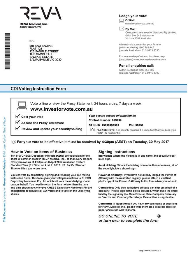 SRN/HIN: I9999999999 RVA MR SAM SAMPLE FLAT 123 123 SAMPLE STREET THE SAMPLE HILL SAMPLE ESTATE SAMPLEVILLE VIC 3030 Lodge your vote: By Mail: Computershare Investor Services Pty Limited GPO Box 242 Melbourne Victoria 3001 Australia Alternatively you can fax your form to (within Australia) 1800 783 447 (outside Australia) +61 3 9473 2555 For Intermediary Online subscribers only (custodians) www.intermediaryonline.com For all enquiries call: (within Australia) 1300 850 505 (outside Australia) +61 3 9415 4000 CDI Voting Instruction Form . PLEASE NOTE: For security reasons it is important that you keep your SRN/HIN confidential. . . For your vote to be effective it must be received by 4:30pm (AEST) on Tuesday, 30 May 2017 How to Vote on Items of Business Ten (10) CHESS Depositary Interests (CDIs) are equivalent to one share of common stock in REVA Medical, Inc., so that every 10 (ten) CDIs you own as at 4:30pm on 8 April 2017 Australian Eastern Standard Time (11:30pm on April 7, 2017 U.S. Pacific Standard Time) entitles you to one vote. You can vote by completing, signing and returning your CDI Voting Instruction Form. This form gives your voting instructions to CHESS Depositary Nominees Pty Ltd, which will vote the underlying shares on your behalf. You need to return the form no later than the time and date shown above to give CHESS Depositary Nominees Pty Ltd enough time to tabulate all CDI votes and to vote on the underlying shares. Signing Instructions Individual: Where the holding is in one name, the securityholder must sign. Joint Holding: Where the holding is in more than one name, all of the securityholders should sign. Power of Attorney: If you have not already lodged the Power of Attorney with the Australian registry, please attach a certified photocopy of the Power of Attorney to this form when you return it. Companies: Only duly authorised officer/s can sign on behalf of a company. Please sign in the boxes provided, which state the office held by the signatory (i.e. Sole Director, Sole Company Secretary or Director and Company Secretary). Delete titles as applicable. Comments & Questions: If you have any comments or questions for REVA Medical, Inc., please write them on a separate sheet of paper and return with this form. GO ONLINE TO VOTE . or turn over to complete the form www.investorvote.com.au Vote online or view the Proxy Statement, 24 hours a day, 7 days a week: Cast your vote Access the Proxy Statement Your secure access information is: . Control Number: 999999 PIN: 99999 Review and update your securityholding www.investorvote.com.au .Online: Samples/000001/000002/i12 *M00000112Q02* I 9999999999 I ND
