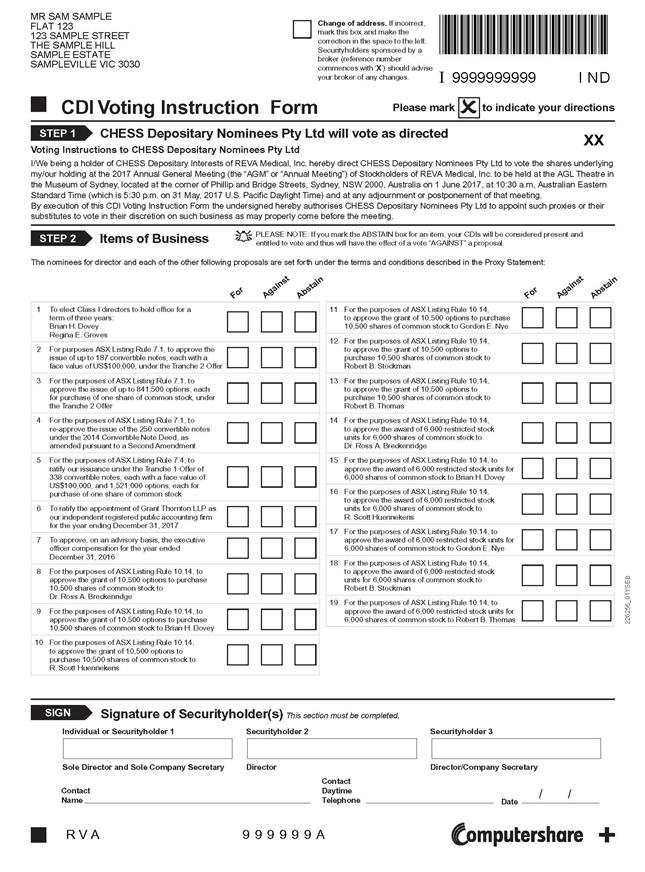 MR SAM SAMPLE FLAT 123 123 SAMPLE STREET THE SAMPLE HILL SAMPLE ESTATE SAMPLEVILLE VIC 3030 R V A 9 9 9 9 9 9 A XX SIGN Signature of Securityholder(s) This section must be completed. Individual or Securityholder 1 Sole Director and Sole Company Secretary Securityholder 2 Director Securityholder 3 Director/Company Secretary Contact Name Contact Daytime Telephone Date / / Please mark to indicate your directions STEP 2 Items of Business PLEASE NOTE: If you mark the ABSTAIN box for an item, your CDIs will be considered present and entitled to vote and thus will have the effect of a vote “AGAINST” a proposal. 1 To elect Class I directors to hold office for a term of three years: Brian H. Dovey Regina E. Groves 2 For purposes ASX Listing Rule 7.1, to approve the issue of up to 187 convertible notes, each with a face value of US$100,000, under the Tranche 2 Offer 3 For the purposes of ASX Listing Rule 7.1, to approve the issue of up to 841,500 options, each for purchase of one share of common stock, under the Tranche 2 Offer 4 For the purposes of ASX Listing Rule 7.1, to re-approve the issue of the 250 convertible notes under the 2014 Convertible Note Deed, as amended pursuant to a Second Amendment 5 For the purposes of ASX Listing Rule 7.4, to ratify our issuance under the Tranche 1 Offer of 338 convertible notes, each with a face value of US$100,000, and 1,521,000 options, each for purchase of one share of common stock 6 To ratify the appointment of Grant Thornton LLP as our independent registered public accounting firm for the year ending December 31, 2017 7 To approve, on an advisory basis, the executive officer compensation for the year ended December 31, 2016 8 For the purposes of ASX Listing Rule 10.14, to approve the grant of 10,500 options to purchase 10,500 shares of common stock to Dr. Ross A. Breckenridge 9 For the purposes of ASX Listing Rule 10.14, to approve the grant of 10,500 options to purchase 10,500 shares of common stock to Brian H. Dovey 10 For the purposes of ASX Listing Rule 10.14, to approve the grant of 10,500 options to purchase 10,500 shares of common stock to R. Scott Huennekens 11 For the purposes of ASX Listing Rule 10.14, to approve the grant of 10,500 options to purchase 10,500 shares of common stock to Gordon E. Nye 12 For the purposes of ASX Listing Rule 10.14, to approve the grant of 10,500 options to purchase 10,500 shares of common stock to Robert B. Stockman 13 For the purposes of ASX Listing Rule 10.14, to approve the grant of 10,500 options to purchase 10,500 shares of common stock to Robert B. Thomas 14 For the purposes of ASX Listing Rule 10.14, to approve the award of 6,000 restricted stock units for 6,000 shares of common stock to Dr. Ross A. Breckenridge 15 For the purposes of ASX Listing Rule 10.14, to approve the award of 6,000 restricted stock units for 6,000 shares of common stock to Brian H. Dovey 16 For the purposes of ASX Listing Rule 10.14, to approve the award of 6,000 restricted stock units for 6,000 shares of common stock to R. Scott Huennekens 17 For the purposes of ASX Listing Rule 10.14, to approve the award of 6,000 restricted stock units for 6,000 shares of common stock to Gordon E. Nye 18 For the purposes of ASX Listing Rule 10.14, to approve the award of 6,000 restricted stock units for 6,000 shares of common stock to Robert B. Stockman 19 For the purposes of ASX Listing Rule 10.14, to approve the award of 6,000 restricted stock units for 6,000 shares of common stock to Robert B. Thomas For Against Abstain For Against Abstain CDI Voting Instruction Form Voting Instructions to CHESS Depositary Nominees Pty Ltd I/We being a holder of CHESS Depositary Interests of REVA Medical, Inc. hereby direct CHESS Depositary Nominees Pty Ltd to vote the shares underlying my/our holding at the 2017 Annual General Meeting (the “AGM” or “Annual Meeting”) of Stockholders of REVA Medical, Inc. to be held at the AGL Theatre in the Museum of Sydney, located at the corner of Phillip and Bridge Streets, Sydney, NSW 2000, Australia on 1 June 2017, at 10:30 a.m, Australian Eastern Standard Time (which is 5:30 p.m. on 31 May, 2017 U.S. Pacific Daylight Time) and at any adjournment or postponement of that meeting. By execution of this CDI Voting Instruction Form the undersigned hereby authorises CHESS Depositary Nominees Pty Ltd to appoint such proxies or their substitutes to vote in their discretion on such business as may properly come before the meeting. STEP 1 CHESS Depositary Nominees Pty Ltd will vote as directed Change of address. If incorrect, mark this box and make the correction in the space to the left. Securityholders sponsored by a broker (reference number commences with ‘X’) should advise your broker of any changes. 226256_01YSEB The nominees for director and each of the other following proposals are set forth under the terms and conditions described in the Proxy Statement: