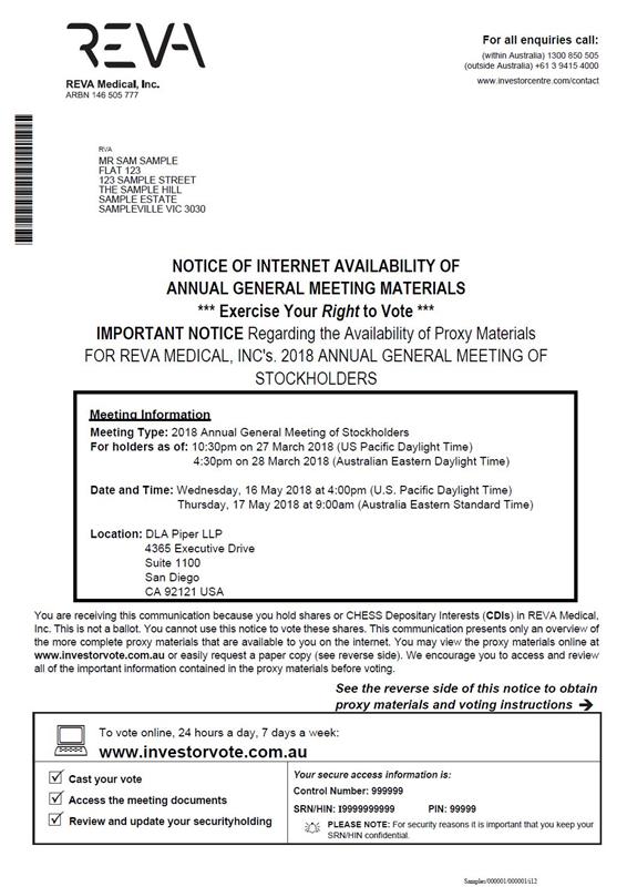 REVA REVA Medical, Inc. ARBN 146 505 777 SRN/HIN: I9999999999 See the reverse side of this notice to obtain proxy materials and voting instructions www.investorvote.com.au To vote online, 24 hours a day, 7 days a week: : Cast your vote Your secure access information is: Control Number: 999999 PIN: 99999 Access the meeting documents Review and update your security holding For all enquiries call: (within Australia) 1300 850 505 (outside Australia) +61 3 9415 4000 NOTICE OF INTERNET AVAILABILITY OF ANNUAL GENERAL MEETING MATERIALS *** Exercise Your Right to Vote *** IMPORTANT NOTICE Regarding the Availability of Proxy Materials FOR REVA MEDICAL, INC's. 2018 ANNUAL GENERAL MEETING OF STOCKHOLDERS PLEASE NOTE: For security reasons it is important that you keep your SRN/HIN confidential. A You are receiving this communication because you hold shares or CHESS Depositary Interests (CDIs) in REVA Medical, Inc. This is not a ballot. You cannot use this notice to vote these shares. This communication presents only an overview of the more complete proxy materials that are available to you on the internet. You may view the proxy materials online at www.investorvote.com.au or easily request a paper copy (see reverse side). We encourage you to access and review all of the important information contained in the proxy materials before voting. è Meeting Type: 2018 Annual General Meeting of Stockholders For holders as of: 10:30pm on 27 March 2018 (US Pacific Daylight Time) 4:30pm on 28 March 2018 (Australian Eastern Daylight Time) Date and Time: Wednesday, 16 May 2018 at 4:00pm (U.S. Pacific Daylight Time) Thursday, 17 May 2018 at 9:00am (Australia Eastern Standard Time) Location: DLA Piper LLP 4365 Executive Drive Suite 1100 San Diego CA 92121 USA Meeting Information www.investorcentre.com/contact RVA MR SAM SAMPLE FLAT 123 123 SAMPLE STREET THE SAMPLE HILL SAMPLE ESTATE SAMPLEVILLE VIC 3030 Samples/000001/000001/i12 *S00000112Q01*