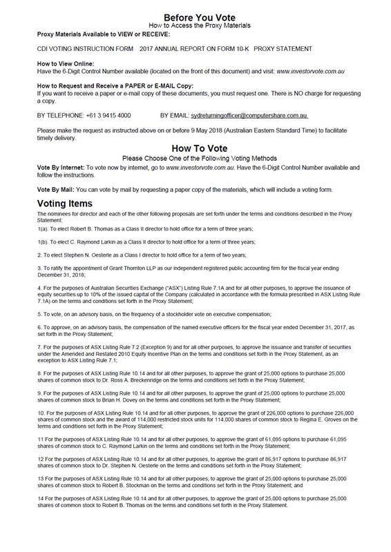 1(a). To elect Robert B. Thomas as a Class II director to hold office for a term of three years; 1(b). To elect C. Raymond Larkin as a Class II director to hold office for a term of three years; 2. To elect Stephen N. Oesterle as a Class I director to hold office for a term of two years; 3. To ratify the appointment of Grant Thornton LLP as our independent registered public accounting firm for the fiscal year ending December 31, 2018; 4. For the purposes of Australian Securities Exchange (“ASX”) Listing Rule 7.1A and for all other purposes, to approve the issuance of equity securities up to 10% of the issued capital of the Company (calculated in accordance with the formula prescribed in ASX Listing Rule 7.1A) on the terms and conditions set forth in the Proxy Statement; 5. To vote, on an advisory basis, on the frequency of a stockholder vote on executive compensation; 6. To approve, on an advisory basis, the compensation of the named executive officers for the fiscal year ended December 31, 2017, as set forth in the Proxy Statement; 7. For the purposes of ASX Listing Rule 7.2 (Exception 9) and for all other purposes, to approve the issuance and transfer of securities under the Amended and Restated 2010 Equity Incentive Plan on the terms and conditions set forth in the Proxy Statement, as an exception to ASX Listing Rule 7.1; 8. For the purposes of ASX Listing Rule 10.14 and for all other purposes, to approve the grant of 25,000 options to purchase 25,000 shares of common stock to Dr. Ross A. Breckenridge on the terms and conditions set forth in the Proxy Statement; 9. For the purposes of ASX Listing Rule 10.14 and for all other purposes, to approve the grant of 25,000 options to purchase 25,000 shares of common stock to Brian H. Dovey on the terms and conditions set forth in the Proxy Statement; 10. For the purposes of ASX Listing Rule 10.14 and for all other purposes, to approve the grant of 226,000 options to purchase 226,000 shares of common stock and the award of 114,000 restricted stock units for 114,000 shares of common stock to Regina E. Groves on the terms and conditions set forth in the Proxy Statement; 11 For the purposes of ASX Listing Rule 10.14 and for all other purposes, to approve the grant of 61,095 options to purchase 61,095 shares of common stock to C. Raymond Larkin on the terms and conditions set forth in the Proxy Statement; 12 For the purposes of ASX Listing Rule 10.14 and for all other purposes, to approve the grant of 86,917 options to purchase 86,917 shares of common stock to Dr. Stephen N. Oesterle on the terms and conditions set forth in the Proxy Statement;13 For the purposes of ASX Listing Rule 10.14 and for all other purposes, to approve the grant of 25,000 options to purchase 25,000 shares of common stock to Robert B. Stockman on the terms and conditions set forth in the Proxy Statement; and 14 For the purposes of ASX Listing Rule 10.14 and for all other purposes, to approve the grant of 25,000 options to purchase 25,000 shares of common stock to Robert B. Thomas on the terms and conditions set forth in the Proxy Statement. Before You Vote How to Access the Proxy Materials Proxy Materials Available to VIEW or RECEIVE: CDI VOTING INSTRUCTION FORM 2017 ANNUAL REPORT ON FORM 10-K PROXY STATEMENT How to View Online: Have the 6-Digit Control Number available (located on the front of this document) and visit: www.investorvote.com.au How to Request and Receive a PAPER or E-MAIL Copy: If you want to receive a paper or e-mail copy of these documents, you must request one. There is NO charge for requesting a copy. BY TELEPHONE: +61 3 9415 4000 BY EMAIL: sydreturningofficer@computershare.com.au Please make the request as instructed above on or before 9 May 2018 (Australian Eastern Standard Time) to facilitate timely delivery. How To Vote Please Choose One of the Following Voting Methods Voting Items Vote By Internet: To vote now by internet, go to www.investorvote.com.au. Have the 6-Digit Control Number available and follow the instructions.Vote By Mail: You can vote by mail by requesting a paper copy of the materials, which will include a voting form. The nominees for director and each of the other following proposals are set forth under the terms and conditions described in the Proxy Statement: