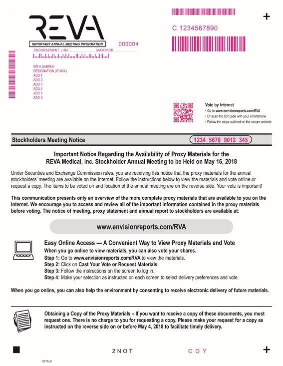 NNNNNNNNNNNN Vote by Internet • Go to www.envisionreports.com/RVA • Or scan the QR code with your smartphone • Follow the steps outlined on the secure website Stockholders Meeting Notice + IMPORTANT ANNUAL MEETING INFORMATION 1234 5678 9012 345 NNNNNNNNNNNNNNNC1234567890000004MR A SAMPLE DESIGNATION (IF ANY) ADD 1 ADD 2 ADD 3 ADD 4 ADD 5 ADD 6 ENDORSEMENT_LINE______________ SACKPACK_____________ Important Notice Regarding the Availability of Proxy Materials for the REVA Medical, Inc. Stockholder Annual Meeting to be Held on May 16, 2018 Under Securities and Exchange Commission rules, you are receiving this notice that the proxy materials for the annual stockholders’ meeting are available on the Internet. Follow the instructions below to view the materials and vote online or request a copy. The items to be voted on and location of the annual meeting are on the reverse side. Your vote is important! This communication presents only an overview of the more complete proxy materials that are available to you on the Internet. We encourage you to access and review all of the important information contained in the proxy materials before voting. The notice of meeting, proxy statement and annual report to stockholders are available at: When you go online to view materials, you can also vote your shares. Step 1: Go to www.envisionreports.com/RVA to view the materials. Step 2: Click on Cast Your Vote or Request Materials. Step 3: Follow the instructions on the screen to log in. Step 4: Make your selection as instructed on each screen to select delivery preferences and vote. www.envisionreports.com/RVA Easy Online Access — A Convenient Way to View Proxy Materials and Vote When you go online, you can also help the environment by consenting to receive electronic delivery of future materials. Obtaining a Copy of the Proxy Materials – If you want to receive a copy of these documents, you must request one. There is no charge to you for requesting a copy. Please make your request for a copy as instructed on the reverse side on or before May 4, 2018 to facilitate timely delivery. 2NOT COY + 02TALC