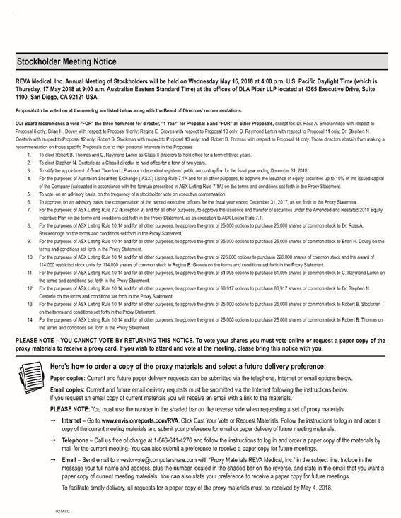 Stockholder Meeting Notice REVA Medical, Inc. Annual Meeting of Stockholders will be held on Wednesday May 16, 2018 at 4:00 p.m. U.S. Pacific Daylight Time (which is Thursday, 17 May 2018 at 9:00 a.m. Australian Eastern Standard Time) at the offices of DLA Piper LLP located at 4365 Executive Drive, Suite 1100, San Diego, CA 92121 USA. Proposals to be voted on at the meeting are listed below along with the Board of Directors’ recommendations. Our Board recommends a vote “FOR” the three nominees for director, “1 Year” for Proposal 5 and “FOR” all other Proposals, except for: Dr. Ross A. Breckenridge with respect to Proposal 8 only; Brian H. Dovey with respect to Proposal 9 only; Regina E. Groves with respect to Proposal 10 only; C. Raymond Larkin with respect to Proposal 11 only; Dr. Stephen N. Oesterle with respect to Proposal 12 only; Robert B. Stockman with respect to Proposal 13 only; and, Robert B. Thomas with respect to Proposal 14 only. Those directors abstain from making a recommendation on those specific Proposals due to their personal interests in the Proposals: 1. To elect Robert B. Thomas and C. Raymond Larkin as Class II directors to hold office for a term of three years. 2. To elect Stephen N. Oesterle as a Class I director to hold office for a term of two years. 3. To ratify the appointment of Grant Thornton LLP as our independent registered public accounting firm for the fiscal year ending December 31, 2018. 4. For the purposes of Australian Securities Exchange (“ASX”) Listing Rule 7.1A and for all other purposes, to approve the issuance of equity securities up to 10% of the issued capital of the Company (calculated in accordance with the formula prescribed in ASX Listing Rule 7.1A) on the terms and conditions set forth in the Proxy Statement. 5. To vote, on an advisory basis, on the frequency of a stockholder vote on executive compensation. 6. To approve, on an advisory basis, the compensation of the named executive officers for the fiscal year ended December 31, 2017, as set forth in the Proxy Statement. 7. For the purposes of ASX Listing Rule 7.2 (Exception 9) and for all other purposes, to approve the issuance and transfer of securities under the Amended and Restated 2010 Equity Incentive Plan on the terms and conditions set forth in the Proxy Statement, as an exception to ASX Listing Rule 7.1. 8. For the purposes of ASX Listing Rule 10.14 and for all other purposes, to approve the grant of 25,000 options to purchase 25,000 shares of common stock to Dr. Ross A. Breckenridge on the terms and conditions set forth in the Proxy Statement. 9. For the purposes of ASX Listing Rule 10.14 and for all other purposes, to approve the grant of 25,000 options to purchase 25,000 shares of common stock to Brian H. Dovey on the terms and conditions set forth in the Proxy Statement. 10. For the purposes of ASX Listing Rule 10.14 and for all other purposes, to approve the grant of 226,000 options to purchase 226,000 shares of common stock and the award of 114,000 restricted stock units for 114,000 shares of common stock to Regina E. Groves on the terms and conditions set forth in the Proxy Statement. 11. For the purposes of ASX Listing Rule 10.14 and for all other purposes, to approve the grant of 61,095 options to purchase 61,095 shares of common stock to C. Raymond Larkin on the terms and conditions set forth in the Proxy Statement. 12. For the purposes of ASX Listing Rule 10.14 and for all other purposes, to approve the grant of 86,917 options to purchase 86,917 shares of common stock to Dr. Stephen N. Oesterle on the terms and conditions set forth in the Proxy Statement. 13. For the purposes of ASX Listing Rule 10.14 and for all other purposes, to approve the grant of 25,000 options to purchase 25,000 shares of common stock to Robert B. Stockman on the terms and conditions set forth in the Proxy Statement. 14. For the purposes of ASX Listing Rule 10.14 and for all other purposes, to approve the grant of 25,000 options to purchase 25,000 shares of common stock to Robert B. Thomas on the terms and conditions set forth in the Proxy Statement. PLEASE NOTE – YOU CANNOT VOTE BY RETURNING THIS NOTICE. To vote your shares you must vote online or request a paper copy of the proxy materials to receive a proxy card. If you wish to attend and vote at the meeting, please bring this notice with you. Here’s how to order a copy of the proxy materials and select a future delivery preference: Paper copies: Current and future paper delivery requests can be submitted via the telephone, Internet or email options below. Email copies: Current and future email delivery requests must be submitted via the Internet following the instructions below. If you request an email copy of current materials you will receive an email with a link to the materials. PLEASE NOTE: You must use the number in the shaded bar on the reverse side when requesting a set of proxy materials. • Internet – Go to www.envisionreports.com/RVA. Click Cast Your Vote or Request Materials. Follow the instructions to log in and order a copy of the current meeting materials and submit your preference for email or paper delivery of future meeting materials. • Telephone – Call us free of charge at 1-866-641-4276 and follow the instructions to log in and order a paper copy of the materials by mail for the current meeting. You can also submit a preference to receive a paper copy for future meetings. • Email – Send email to investorvote@computershare.com with “Proxy Materials REVA Medical, Inc.” in the subject line. Include in the message your full name and address, plus the number located in the shaded bar on the reverse, and state in the email that you want a paper copy of current meeting materials. You can also state your preference to receive a paper copy for future meetings. To facilitate timely delivery, all requests for a paper copy of the proxy materials must be received by May 4, 2018. 02TALC
