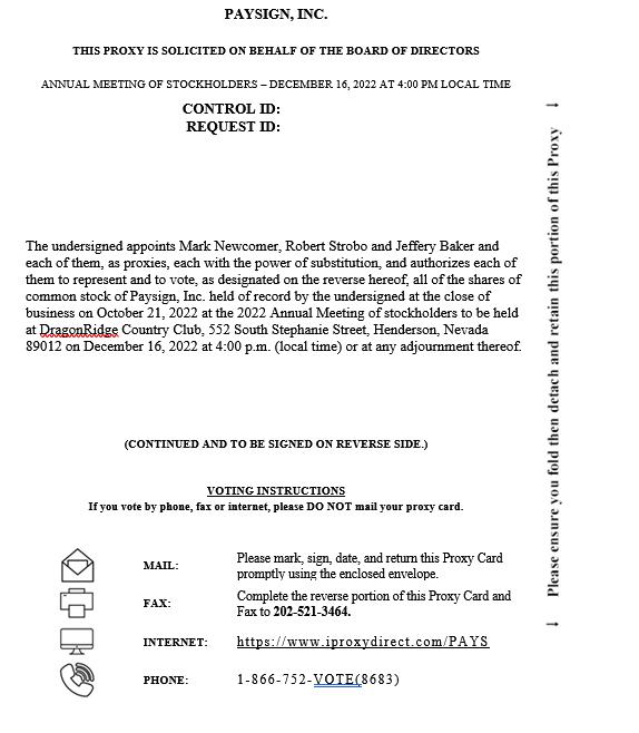 These proxy materials, together with our annual report to stockholders for our 2021 fiscal year, are first being made available to Paysign, Inc. stockholders online on November 1, 2022, at www.iproxydirect.com/PAYS and at www.paysign.com. The Notice of Internet Availability of Proxy Materials is first being mailed to certain stockholders on or about November 4, 2022. For ease of voting, stockholders are encouraged to vote using the Internet. We encourage you to access and review all of the important information in the proxy materials before voting.