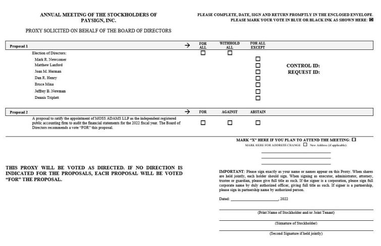 You may view and also download our proxy materials, including our Form 10-K for the year ended December 31, 2021, which is our Annual Report for 2021, and the Notice by accessing www.iproxydirect.com/PAYS and on our website at www.paysign.com.
