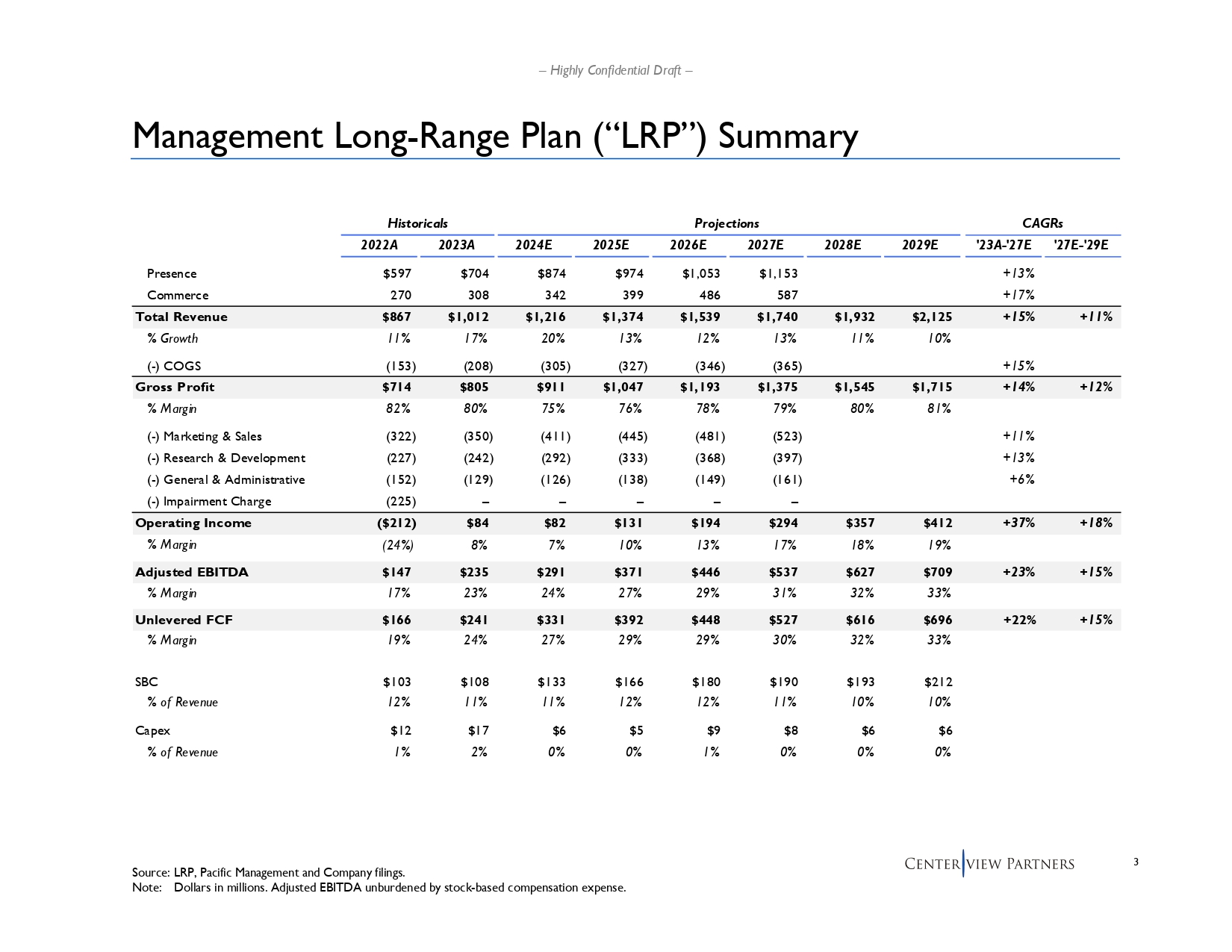 3 – H ighl y Confident ia l Draf t – Management Long - Range Plan (“LRP”) Summary 2022A 2023A 2024E 2025E 2026E 2027E 2028E 2029E ’23A - ’27E ’27E - ’29E Presence $597 $704 $874 $974 $1,053 $1,153 +13% Commerce 270 308 342 399 486 587 +17% Total Revenue $867 $1,012 $1,216 $1,374 $1,539 $1,740 $1,932 $2,125 +15% +11% % Growth 11% 17% 20% 13% 12% 13% 11% 10% ( - ) C O G S (153) (208) (305) (327) (346) (365) +15% Gross Profit $714 $805 $911 $1,047 $1,193 $1,375 $1,545 $1,715 +14% +12% % Margin 82% 80% 75% 76% 78% 79% 80% 81% ( - ) M a rke t i n g & S a l e s (322) (350) (411) (445) (481) (523) +11% ( - ) R e s e a r c h & D e v e l o p m e n t (227) (242) (292) (333) (368) (397) +13% ( - ) G e n e r a l & A d m i n i s t r a t i v e (152) (129) (126) (138) (149) (161) +6% ( - ) I m p a i rm e n t C h a r g e (225) – – – – – Operating Income ($212) $84 $82 $131 $194 $294 $357 $412 +37% +18% % Margin (24%) 8% 7% 10% 13% 17% 18% 19% Adjusted EBITDA $147 $235 $291 $371 $446 $537 $627 $709 +23% +15% % Margin 17% 23% 24% 27% 29% 31% 32% 33% Unlevered FCF $166 $241 $331 $392 $448 $527 $616 $696 +22% +15% % Margin 19% 24% 27% 29% 29% 30% 32% 33% SBC $103 $108 $133 $166 $180 $190 $193 $212 % o f R e v e nu e 12% 11% 11% 12% 12% 11% 10% 10% Capex $12 $17 $6 $5 $9 $8 $6 $6 % o f R e v e nu e 1% 2% 0% 0% 1% 0% 0% 0% Historicals P r o j e c tio n s C A G R s Source: LRP, Pacific Management and Company filings. Note: Dollars in millions. Adjusted EBITDA unburdened by stock - based compensation expense.
