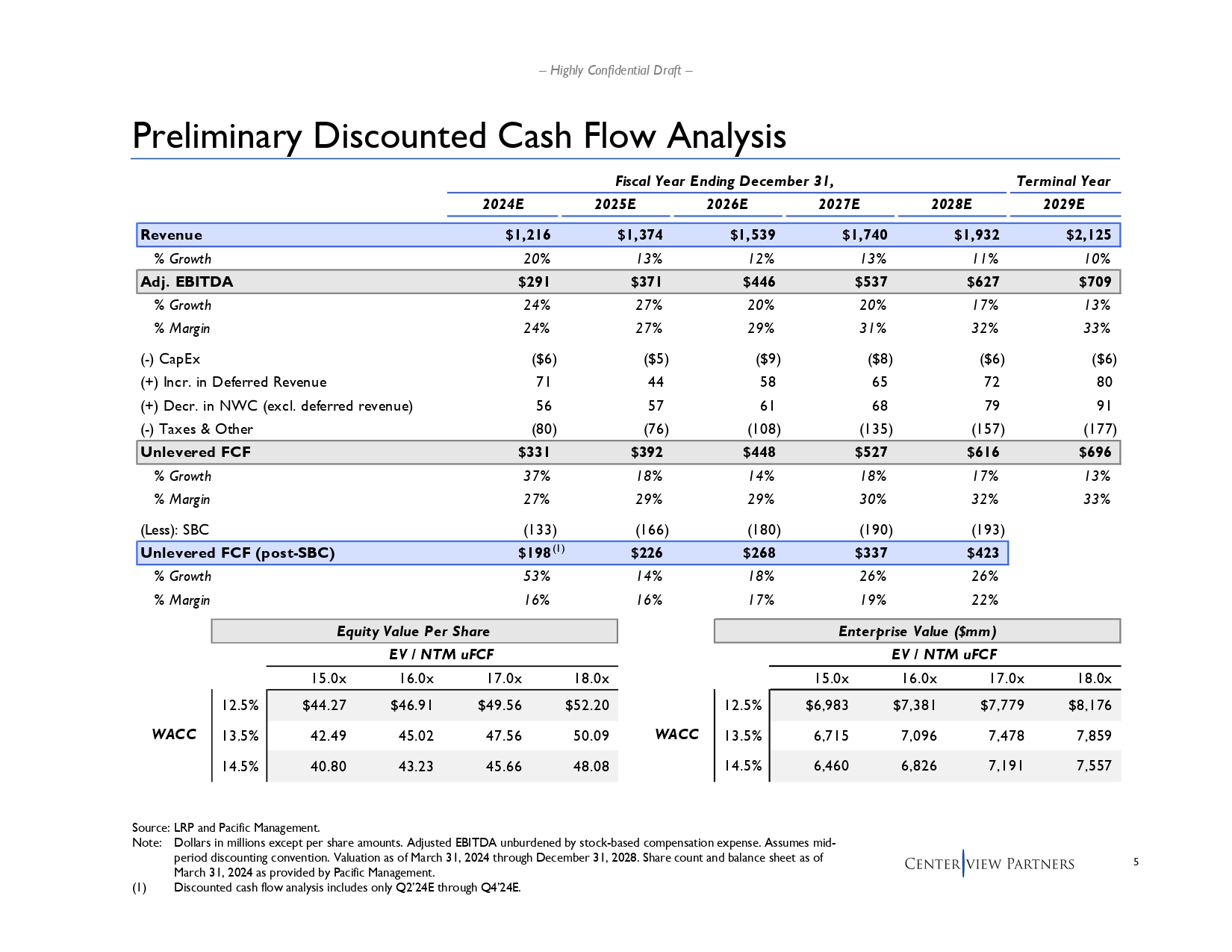 4 – H ighl y Confident ia l Draf t – Preliminary Indicative Valuation Summary Methodology Relevant Metrics Implied Share Price Range (1) 12 . 50 % - 14 . 50 % W A C C ; 1 5 . 0 x - 1 8 . 0 x N T M u F C F M u l t i p l e L o w : 5 / 4 / 23 High: 4/11/24 Analyst Price Targets 52 - W ee k T r ad i n g R a n g e Discounted Cash Flow Selected Public Trading Comparables $ 40 . 80 $ 37 . 00 $ 26 . 22 $ 2 8 . 00 $ 5 2 . 20 $4 3 . 90 $ 37 . 7 9 $ 45 . 00 L o w : W o l fe (2 / 29 / 24 ) (3) High: JMP (3/18/24) Source: LRP, Pacific Management, Wall Street research, Company filings and FactSet as of April 23, 2024. Note: Balance sheet and share count as of March 31, 2024 as provided by Pacific Management. (1) Implied share price ranges rounded to the nearest $0.05, except 52 - week trading range. (2) NTM uFCF calculated based on time - weighted average of FY24E uFCF of $331 and FY25E uFCF of $392. (3) Reflects low end of Wolfe’s $28.00 - $50.00 price target range. Fo r Referenc e Only 17 . 0 x - 20 . 0 x N T M u F C F o f $ 34 6 (2)