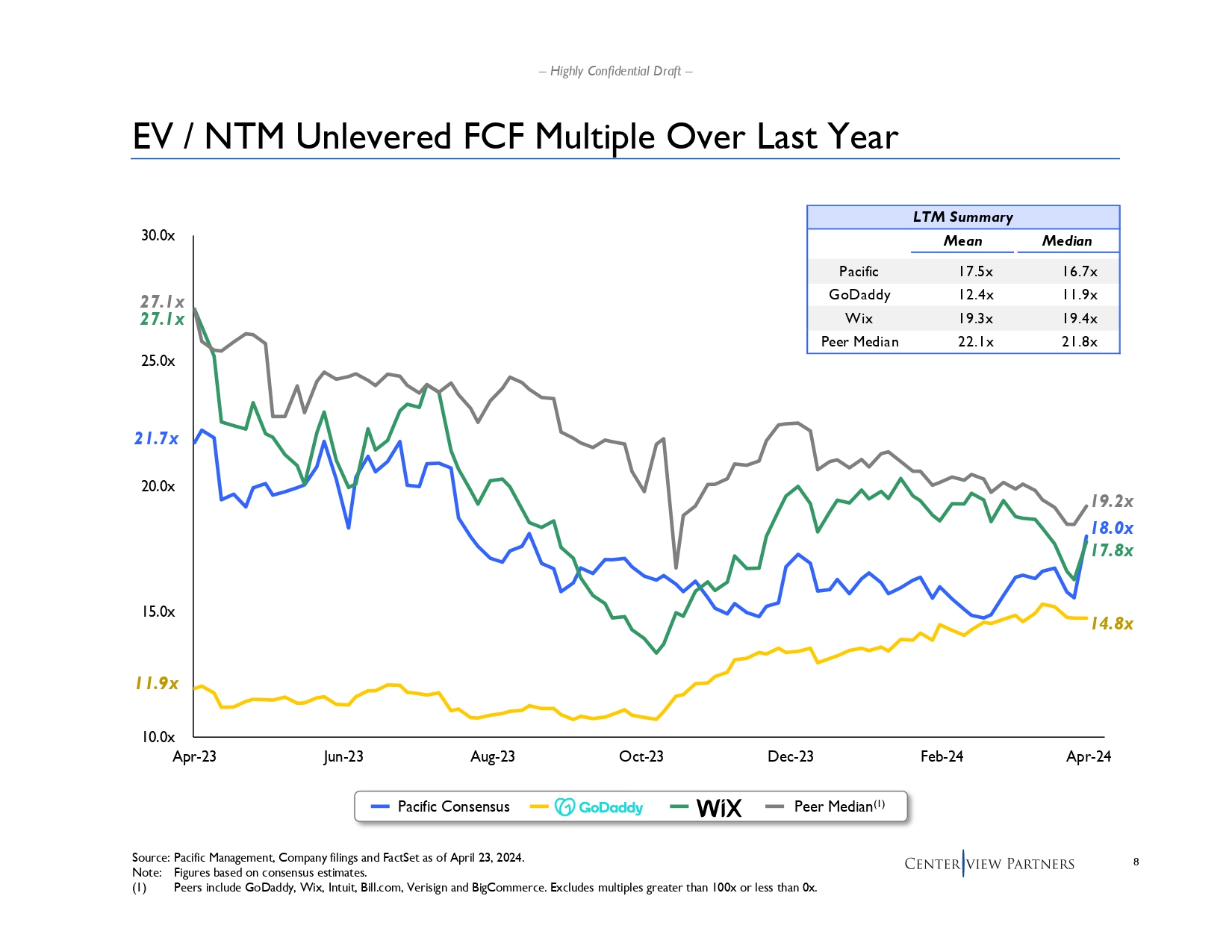 7 – H ighl y Confident ia l Draf t – Selecte d Publi c Tradin g Comparable s Bill.com Wix Pacific (M g m t. ) Intuit Pacific (Cons. ) Big Com m e r c e Ver i Si g n GoDa d d y 16% 13% 13% 12% 12% 9% 7% 7% Source: LRP, Pacific Management and FactSet as of April 23, 2024. Note: Medians exclude Pacific figures. Gross profit and adjusted EBITDA unburdened by stock - based compensation expense. Pacific balance sheet and share count as of March 31, 2024 as provided by Pacific Management. Pacific NTM metrics calculated as proportional average of FY24E and FY25E figures. (1) Reflects ’24 - ’25E revenue growth + NTM uFCF margin. R e v . G r o w t h NTM Margin NTM EV Multiple 2024E - 2025E UFCF UFCF 62% 34% 32% 28% VeriSign Intuit GoDaddy Pacific (Mgmt.) Pacific (Cons.) Bill.com W i x Big Com m e r c e Intuit Big Com m e r c e 31.1x 29.1x VeriSign Bill.com Pacific (Cons. ) Wix Pacific (Mgmt. ) GoDaddy 19.9x 18.5x 18.0x 17.8x 16.7x 14.8x Adj. EBITDA Bill.com In t u i t Big Commerce Wix Pacific (Co n s. ) Pacific ( M gmt. ) Ver i Si g n Go D a d d y 28.1x 26.5x 25.6x 20.0x 18.7x 18.6x 16.0x 15.8x G r oss P r ofit Bill.com In t u i t Big Com m e r c e Pacific (Cons. ) Pacific (Mgmt. ) W i x GoDa d d y VeriSign 85% 82% 78% 77% 76% 69% 63% n.a. Margin 76% 41% 30% 25% 69% 47% 39% 41% 26% 25% 38% 24% 16% 40% 23% 20% 36% 6% 6% 15% Adj . EBITDA Rule of… (1)