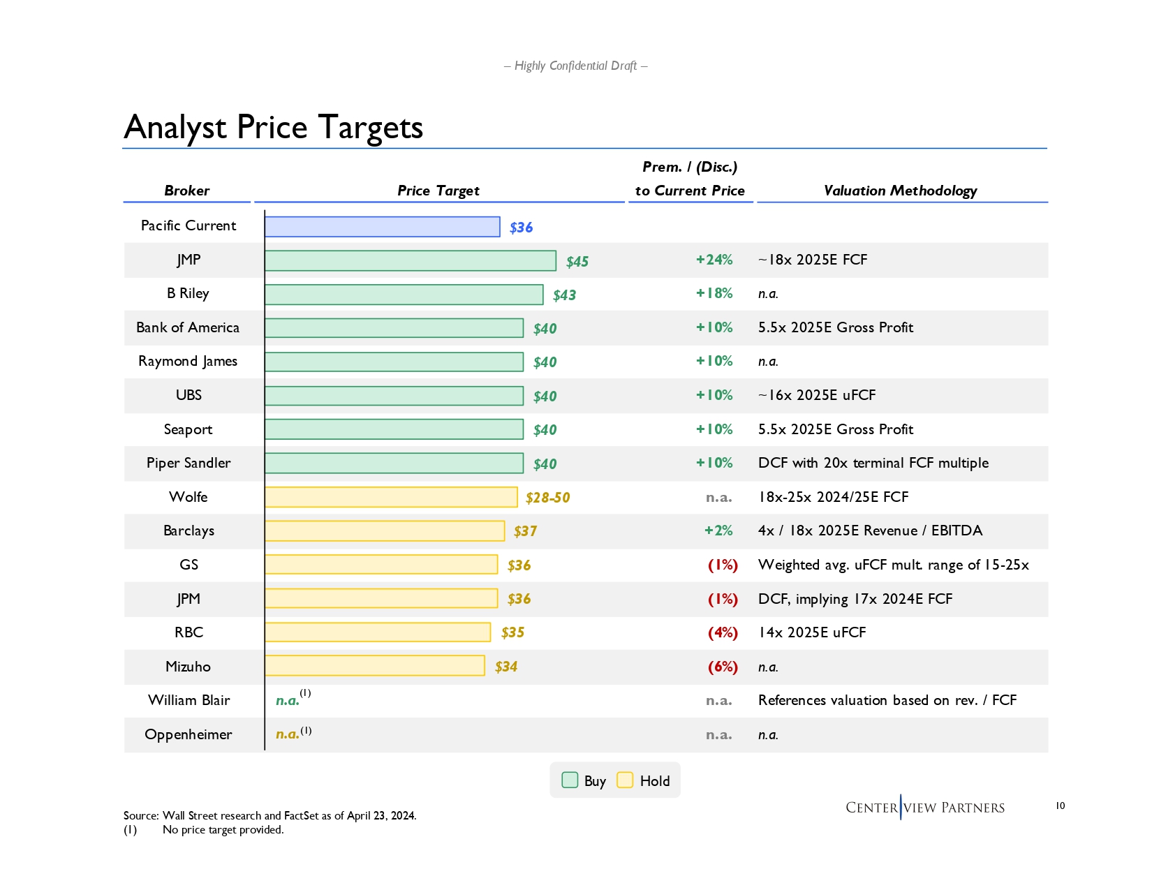 10 – H ighl y Confident ia l Draf t – Analys t Pric e Target s Pr e m . / ( D i s c . ) B r o k e r P r i c e T a r g e t t o C u rr e n t P r i c e V a l u a t i o n M e t h o d o l o g y Pacific Current $ 36 JMP $45 +24% ~18x 2025E FCF B Riley $43 +18% n.a. B an k o f A m e r i c a $40 +10% 5.5x 2025E Gross Profit Raymond James $40 +10% n.a. UBS $40 +10% ~16x 2025E uFCF Seaport $40 +10% 5.5x 2025E Gross Profit Piper Sandler $40 +10% DCF with 20x terminal FCF multiple Wolfe $28 - 50 n.a. 18x - 25x 2024/25E FCF Barclays $37 +2% 4 x / 18 x 2025 E R e v e nu e / E BI T D A GS $36 (1%) W e i g h te d a v g . u FC F m u l t . r a n g e o f 15 - 25x JPM $36 (1%) DCF, implying 17x 2024E FCF RBC $35 (4%) 14x 2025E uFCF Mizuho $34 (6%) n.a. William Blair n.a. (1) n.a. R e fe re n c e s v a l u a t i o n b a s e d o n r e v . / FC F Oppenheimer n.a. (1) n.a. n.a. Buy H old Source: Wall Street research and FactSet as of April 23, 2024. (1) N o price target pr o v ided.