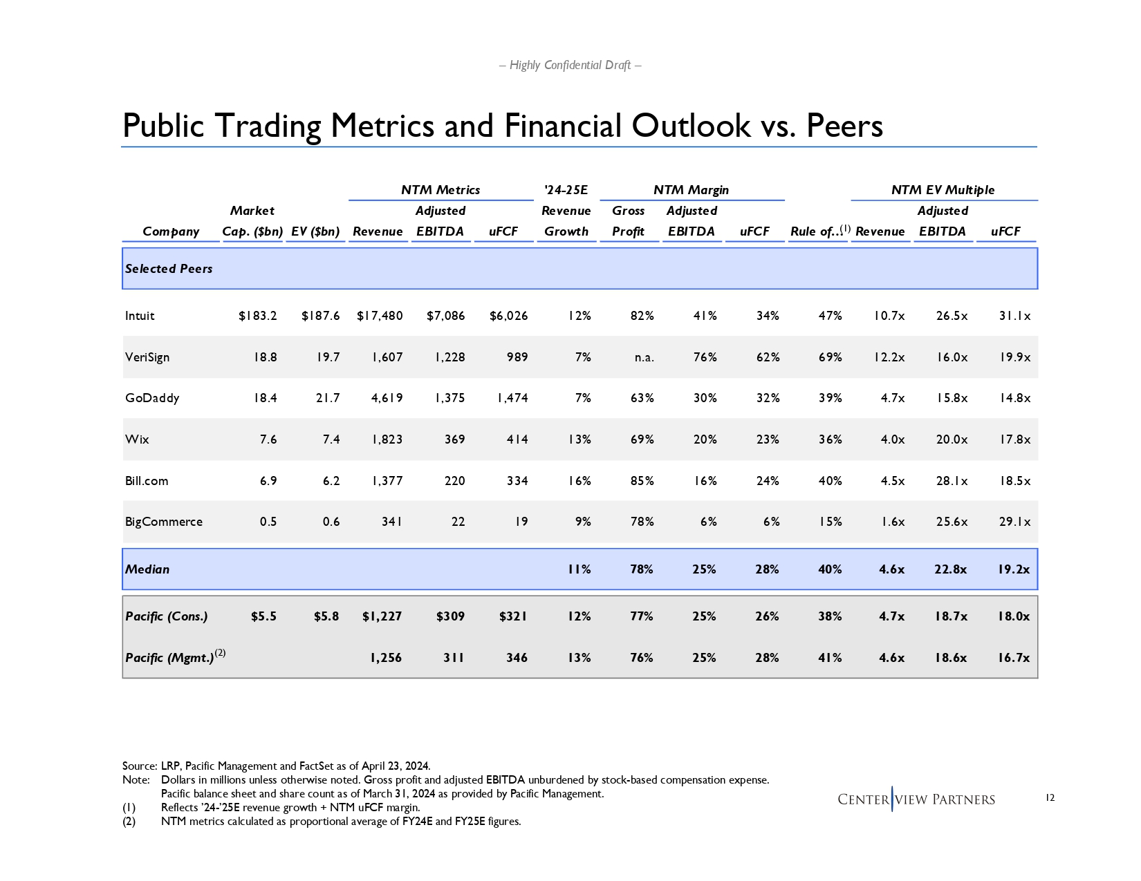 12 – H ighl y Confident ia l Draf t – Public Trading Metrics and Financia l Outloo k vs. Peers Source: LRP, Pacific Management and FactSet as of April 23, 2024. Note: Dollars in millions unless otherwise noted. Gross profit and adjusted EBITDA unburdened by stock - based compensation expense. Pacific balance sheet and share count as of March 31, 2024 as provided by Pacific Management. (1) (2) Reflects ’24 - ’25E revenue growth + NTM uFCF margin. NTM metrics calculated as proportional average of FY24E and FY25E figures. Selected Peers Intuit $183.2 $187.6 $17,480 $7,086 $6,026 12% 82% 41% 34% 47% 10.7x 26.5x 31.1x VeriSign 18.8 19.7 1,607 1,228 989 7% n.a. 76% 62% 69% 12.2x 16.0x 19.9x GoDaddy 18.4 21.7 4,619 1,375 1,474 7% 63% 30% 32% 39% 4.7x 15.8x 14.8x Wix 7.6 7.4 1,823 369 414 13% 69% 20% 23% 36% 4.0x 20.0x 17.8x Bill.com 6.9 6.2 1,377 220 334 16% 85% 16% 24% 40% 4.5x 28.1x 18.5x BigCommerce 0.5 0.6 341 22 19 9% 78% 6% 6% 15% 1.6x 25.6x 29.1x Median 11% 78% 25% 28% 40% 4.6x 22.8x 19.2x Pacific (Cons.) $5.5 $5.8 $1,227 $309 $321 12% 77% 25% 26% 38% 4.7x 18.7x 18.0x Pacific (Mgmt.) (2) 1,256 311 346 13% 76% 25% 28% 41% 4.6x 18.6x 16.7x NTM Metrics ’24 - 25E N T M M a r g in NTM EV Multiple Market Adjusted Revenue Gross Adjusted Adjusted Company Cap. ($bn) E V ( $ b n ) Revenue EBITDA uFCF Growth Profit EBITDA uFCF Rule of… (1) Revenue EBITDA uFCF