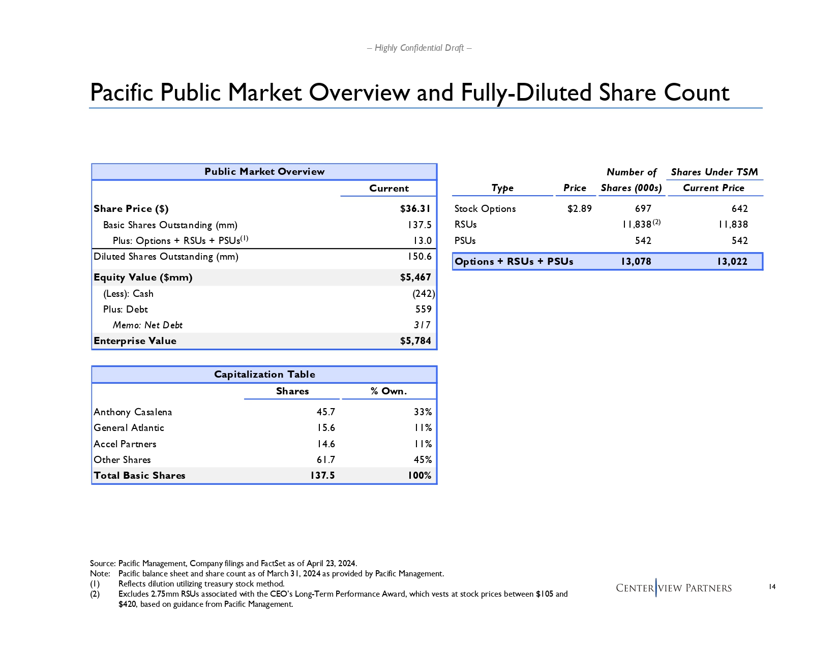 13 – H ighl y Confident ia l Draf t – Publi c Floa t Ove r Las t 2 Year s % Owne r s hip (Q1’22 v s . Cur r ent) Source: Pacific Management, Company filings and FactSet as of April 23, 2024. Note: Pacific share count as of March 31, 2024 as provided by Pacific Management. Publi c Float Insiders Founde r / CEO Pacific 34% 33% 35% 45% 30% G A & Accel 22% G A & Accel Q 1 ’22 Current ~90 % o f voting shar e owne d by CEO, G A an d Accel Value of Public Float ($bn) Wix 4% 4% 5% 96% 91% Q 1 ’22 Current 1% 5% 5% 95% 94% Q 1 ’22 Current GoDaddy ~ 5 % owne d by Starboar d Ca p i tal VeriSign Intuit 1% 1% 99% 99% Q 1 ’22 Current 3% 3% 97% 97% Q 1 ’22 Current Bill.com BigCommerce 7% 5% 93% 95% Q 1 ’22 Current 9% 10% 12% 5% 78% 85% Q 1 ’22 Current ~ $ 1.3 ~ $ 2.2 ~ $ 5.7 ~ $ 6.8 ~ $ 14.0 ~ $ 17.5 ~ $ 24.2 ~ $ 18.5 ~ $ 131.2 ~ $ 171.6 ~ $ 21.9 ~ $ 6.1 ~ $ 1.2 ~ $ 0.4