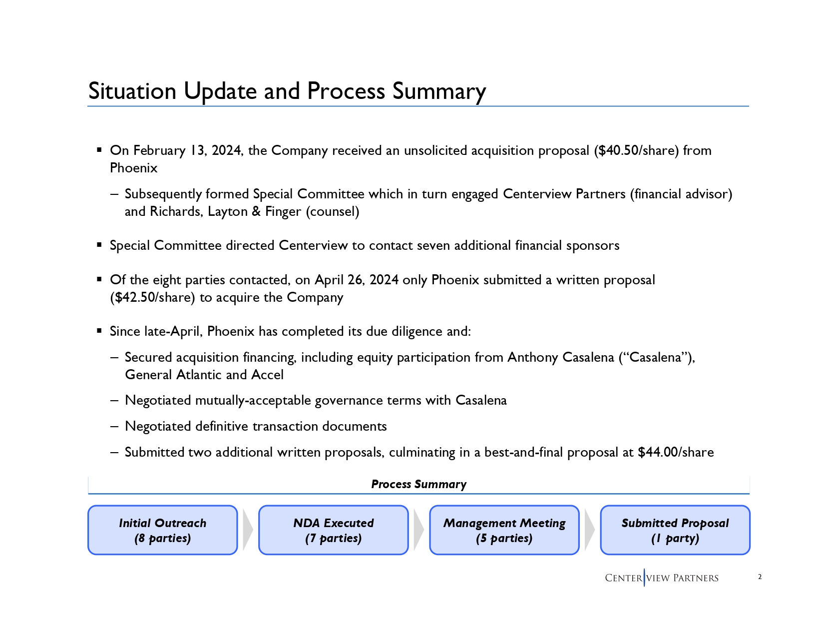 ▪ On February 13, 2024, the Company received an unsolicited acquisition proposal ($40.50/share) from Phoenix – Subsequently formed Special Committee which in turn engaged Centerview Partners (financial advisor) and Richards, Layton & Finger (counsel) ▪ Special Committee directed Centerview to contact seven additional financial sponsors ▪ Of the eight parties contacted, on April 26, 2024 only Phoenix submitted a written proposal ($42.50/share) to acquire the Company ▪ Since late - April, Phoenix has completed its due diligence and: – Secured acquisition financing, including equity participation from Anthony Casalena (“Casalena”), General Atlantic and Accel – Negotiated mutually - acceptable governance terms with Casalena – Negotiated definitive transaction documents – Submitted two additional written proposals, culminating in a best - and - final proposal at $44.00/share Process Summary Situation Update and Process Summary Initial Outreach (8 parties) NDA Executed (7 parties) Management Meeting (5 parties) Submitted Proposal (1 party) 2