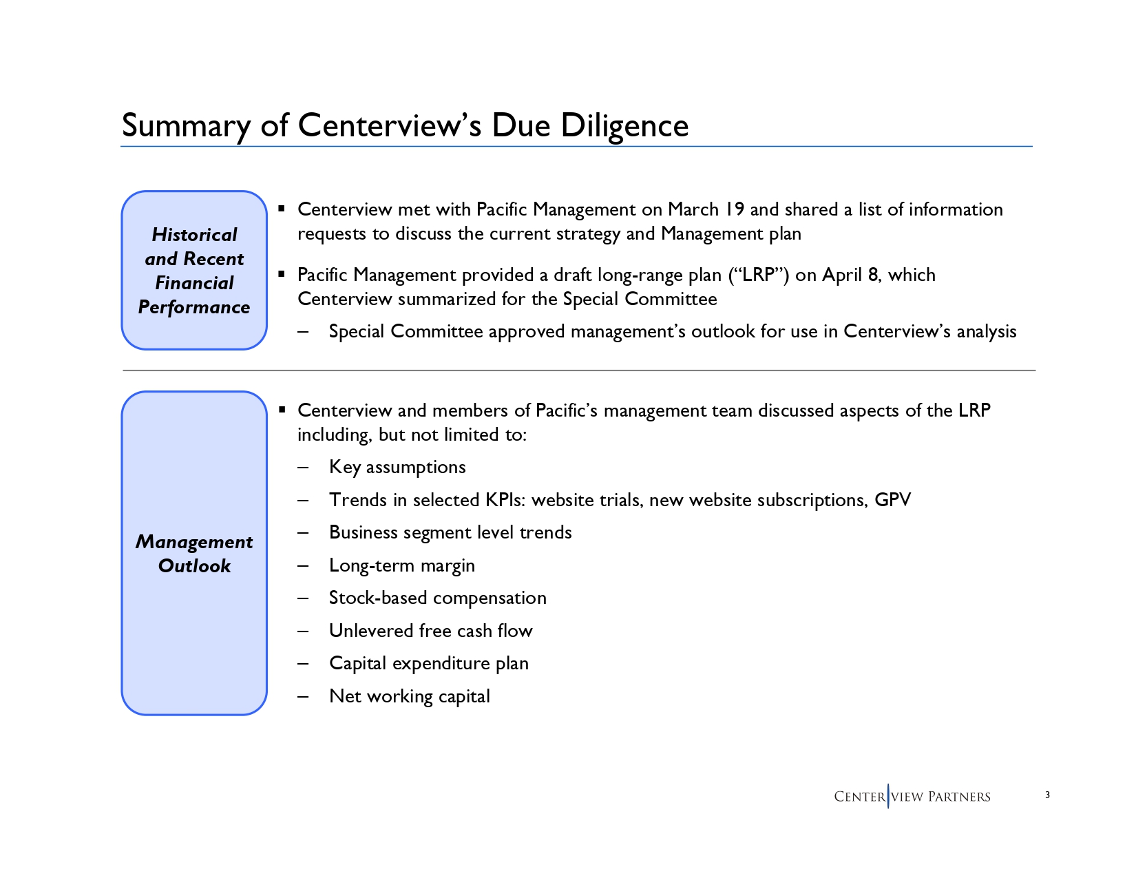 Disclaimer 1 This presentation has been prepared by Centerview Partners LLC (“Centerview”) for use solely by the Board of Directors (the “Board”) of Pacific (“Pacific” or the “Company” ) in connection with its evaluation of a proposed strategic alternatives for Pacific and for no other purpose . The information contained herein is based upon information supplied by or on behalf of Pacific and publicly available information, and portions of the information contained herein may be based upon statements, estimates and forecasts provided by Pacific . Centerview has relied upon the accuracy and completeness of the foregoing information, and has not assumed any responsibility for any independent verification of such information or for any independent evaluation or appraisal of any of the assets or liabilities (contingent or otherwise) of Pacific or any other entity, or concerning the solvency or fair value of Pacific or any other entity . The financial analysis in this presentation is complex and is not necessarily susceptible to a partial analysis or summary description . In performing this financial analysis, Centerview has considered the results of its analysis as a whole and did not necessarily attribute a particular weight to any particular portion of the analysis considered . Furthermore, selecting any portion of Centerview’s analysis, without considering the analysis as a whole, would create an incomplete view of the process underlying its financial analysis . Centerview may have deemed various assumptions more or less probable than other assumptions, so the reference ranges resulting from any particular portion of the analysis described above should not be taken to be Centerview’s view of the actual value of Pacific . These materials and the information contained herein are confidential, were not prepared with a view toward public disclosure, and may not be disclosed publicly or made available to third parties without the prior written consent of Centerview . These materials and any other advice, written or oral, rendered by Centerview are intended solely for the benefit and use of the Board (in its capacity as such) in its consideration of the proposed transaction, and are not for the benefit of, and do not convey any rights or remedies for any holder of securities of Pacific or any other person . Centerview will not be responsible for and has not provided any tax, accounting, actuarial, legal or other specialist advice . These materials are not intended to provide the sole basis for evaluating the proposed transaction, and this presentation does not represent a fairness opinion, recommendation, valuation or opinion of any kind, and is necessarily incomplete and should be viewed solely in conjunction with the oral presentation provided by Centerview .