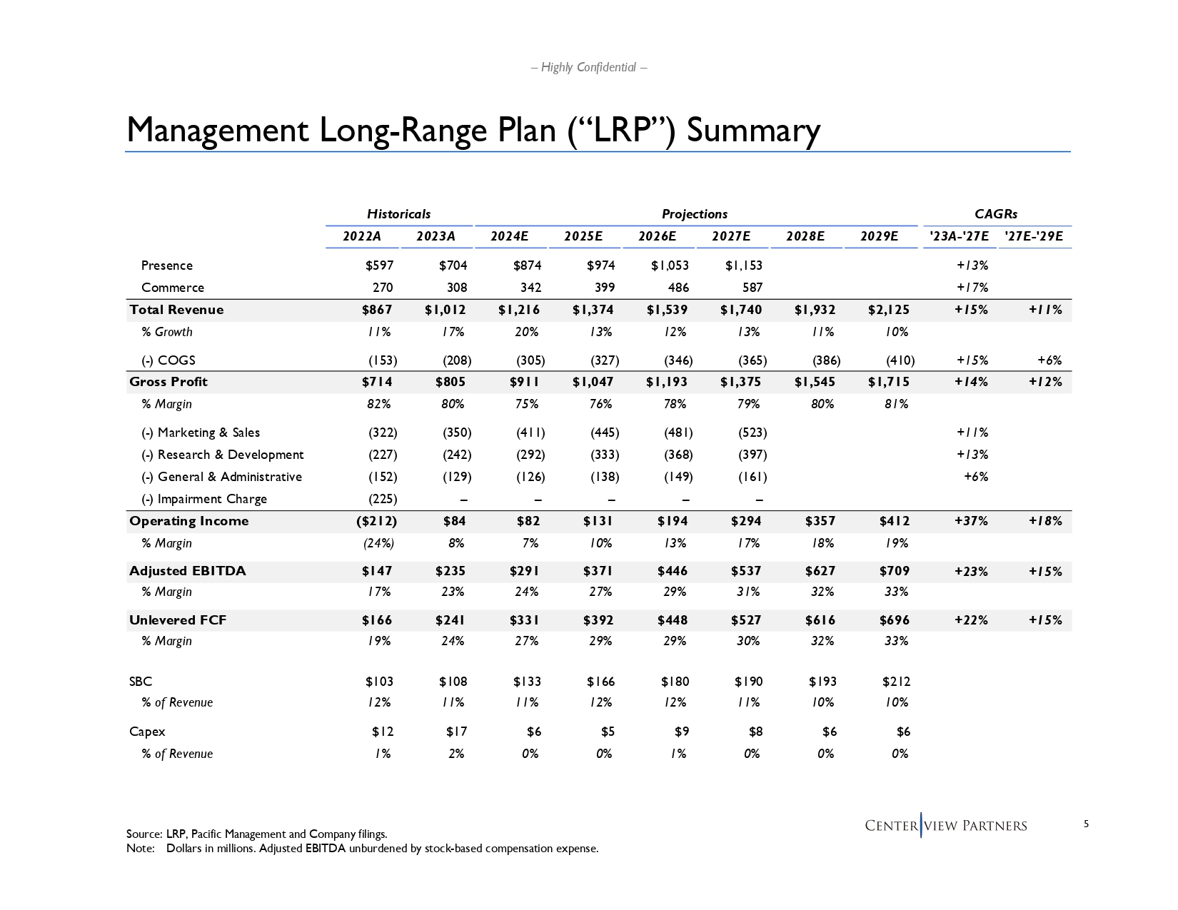 5 – Highly Confidential – Management Long-Range Plan (“LRP”) Summary Historicals Projections CAGRs 2022A 2023A 2024E 2025E 2026E 2027E 2028E 2029E ’23A-’27E ’27E-’29E Presence $597 $704 $874 $974 $1,053 $1,153 +13% Commerce 270 308 342 399 486 587 +17% Total Revenue $867 $1,012 $1,216 $1,374 $1,539 $1,740 $1,932 $2,125 +15% +11% % Growth 11% 17% 20% 13% 12% 13% 11% 10% (-) COGS (153) (208) (305) (327) (346) (365) (386) (410) +15% +6% Gross Profit $714 $805 $911 $1,047 $1,193 $1,375 $1,545 $1,715 +14% +12% % Margin 82% 80% 75% 76% 78% 79% 80% 81% (-) Marketing & Sales (322) (350) (411) (445) (481) (523) +11% (-) Research & Development (227) (242) (292) (333) (368) (397) +13% (-) General & Administrative (152) (129) (126) (138) (149) (161) +6% (-) Impairment Charge (225) – – – – – Operating Income ($212) $84 $82 $131 $194 $294 $357 $412 +37% +18% % Margin (24%) 8% 7% 10% 13% 17% 18% 19% Adjusted EBITDA $147 $235 $291 $371 $446 $537 $627 $709 +23% +15% % Margin 17% 23% 24% 27% 29% 31% 32% 33% Unlevered FCF $166 $241 $331 $392 $448 $527 $616 $696 +22% +15% % Margin 19% 24% 27% 29% 29% 30% 32% 33% SBC $103 $108 $133 $166 $180 $190 $193 $212 % of Revenue 12% 11% 11% 12% 12% 11% 10% 10% Capex $12 $17 $6 $5 $9 $8 $6 $6 % of Revenue 1% 2% 0% 0% 1% 0% 0% 0% Source: LRP, Pacific Management and Company filings. Note: Dollars in millions. Adjusted EBITDA unburdened by stock-based compensation expense.