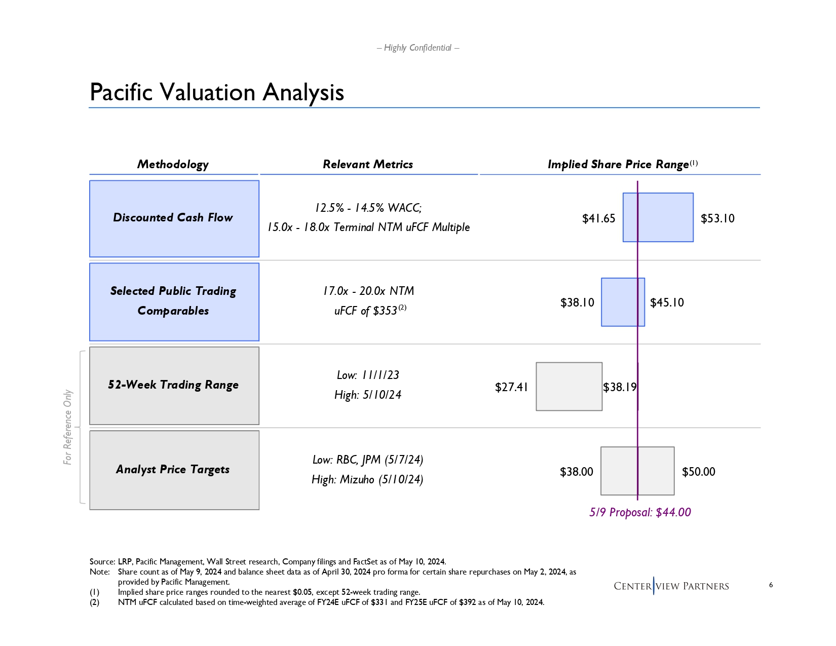 6 – Highly Confidential – Pacific Valuation Analysis Methodology Relevant Metrics Implied Share Price Range 12.5% - 14.5% WACC; 15.0x - 18.0x Terminal NTM uFCF Multiple 17.0x - 20.0x NTM uFCF of $353 Low: 11/1/23 High: 5/10/24 Low: RBC, JPM (5/7/24) High: Mizuho (5/10/24) Analyst Price Targets 52-Week Trading Range Discounted Cash Flow Selected Public Trading Comparables $41.65 $38.10 $27.41 $38.00 $53.10 $45.10 $38.19 $50.00 (1) Source: LRP, Pacific Management, Wall Street research, Company filings and FactSet as of May 10, 2024. Note: Share count as of May 9, 2024 and balance sheet data as of April 30, 2024 pro forma for certain share repurchases on May 2, 2024, as provided by Pacific Management. (1) Implied share price ranges rounded to the nearest $0.05, except 52-week trading range. (2) NTM uFCF calculated based on time-weighted average of FY24E uFCF of $331 and FY25E uFCF of $392 as of May 10, 2024. For Reference Only (2) 5/9 Proposal: $44.00