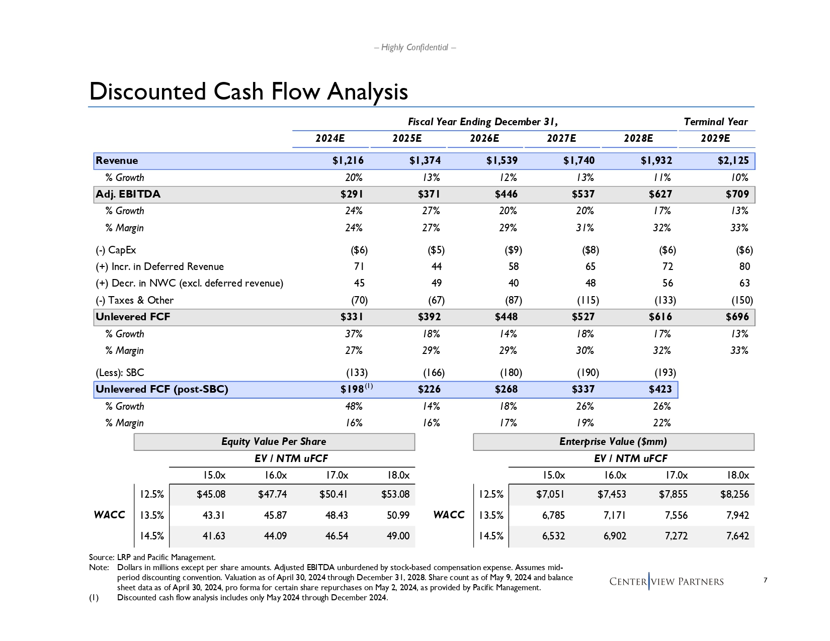 7 – Highly Confidential – Fiscal Year Ending December 31, Terminal Year 2024E 2025E 2026E 2027E 2028E 2029E Revenue $1,216 $1,374 $1,539 $1,740 $1,932 $2,125 % Growth 20% 13% 12% 13% 11% 10% Adj. EBITDA $291 $371 $446 $537 $627 $709 % Growth 24% 27% 20% 20% 17% 13% % Margin 24% 27% 29% 31% 32% 33% (-) CapEx ($6) ($5) ($9) ($8) ($6) ($6) (+) Incr. in Deferred Revenue 71 44 58 65 72 80 (+) Decr. in NWC (excl. deferred revenue) 45 49 40 48 56 63 (-) Taxes & Other (70) (67) (87) (115) (133) (150) Unlevered FCF $331 $392 $448 $527 $616 $696 % Growth 37% 18% 14% 18% 17% 13% % Margin 27% 29% 29% 30% 32% 33% (Less): SBC (133) (166) (180) (190) (193) Unlevered FCF (post-SBC) $198 $226 $268 $337 $423 % Growth 48% 14% 18% 26% 26% % Margin 16% 16% 17% 19% 22% Discounted Cash Flow Analysis Equity Value Per Share EV / NTM uFCF 15.0x 16.0x 17.0x 18.0x 12.5% $45.08 $47.74 $50.41 $53.08 13.5% 43.31 45.87 48.43 50.99 14.5% 41.63 44.09 46.54 49.00 WACC Enterprise Value ($mm) EV / NTM uFCF 15.0x 16.0x 17.0x 18.0x 12.5% $7,051 $7,453 $7,855 $8,256 13.5% 6,785 7,171 7,556 7,942 14.5% 6,532 6,902 7,272 7,642 WACC Source: LRP and Pacific Management. Note: Dollars in millions except per share amounts. Adjusted EBITDA unburdened by stock-based compensation expense. Assumes midperiod discounting convention. Valuation as of April 30, 2024 through December 31, 2028. Share count as of May 9, 2024 and balance sheet data as of April 30, 2024, pro forma for certain share repurchases on May 2, 2024, as provided by Pacific Management. (1) Discounted cash flow analysis includes only May 2024 through December 2024. (1)