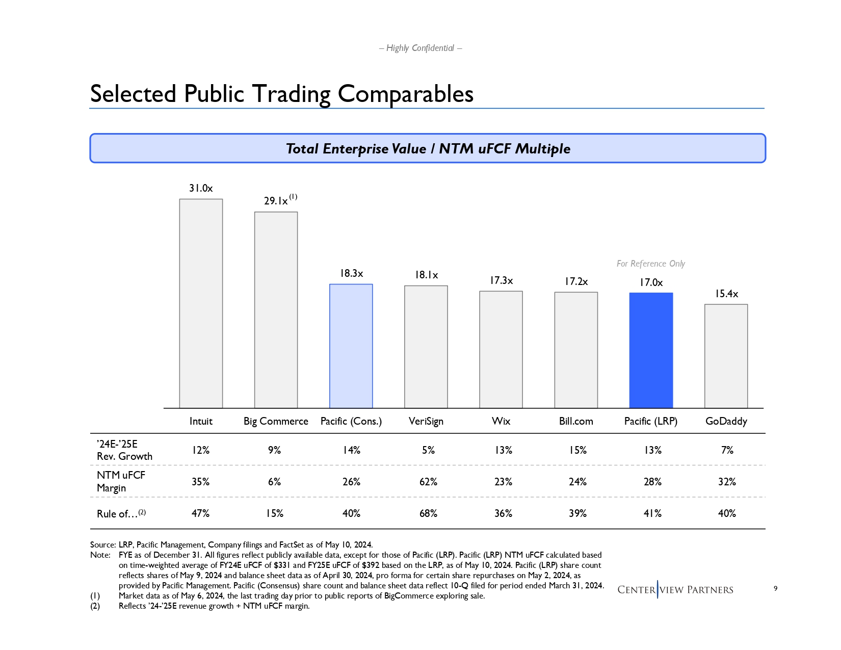 9 – Highly Confidential – Selected Public Trading Comparables Source: LRP, Pacific Management, Company filings and FactSet as of May 10, 2024. Note: FYE as of December 31. All figures reflect publicly available data, except for those of Pacific (LRP). Pacific (LRP) NTM uFCF calculated based on time-weighted average of FY24E uFCF of $331 and FY25E uFCF of $392 based on the LRP, as of May 10, 2024. Pacific (LRP) share count reflects shares of May 9, 2024 and balance sheet data as of April 30, 2024, pro forma for certain share repurchases on May 2, 2024, as provided by Pacific Management. Pacific (Consensus) share count and balance sheet data reflect 10-Q filed for period ended March 31, 2024. (1) Market data as of May 6, 2024, the last trading day prior to public reports of BigCommerce exploring sale. (2) Reflects ’24-’25E revenue growth + NTM uFCF margin. Total Enterprise Value / NTM uFCF Multiple ’24E-’25E Rev. Growth NTM uFCF Margin Rule of…(2) 31.0x 29.1x 18.3x 18.1x 17.3x 17.2x 17.0x 15.4x Intuit Big Commerce Pacific (Cons.) VeriSign Wix Bill.com Pacific (LRP) GoDaddy 12% 9% 14% 5% 13% 15% 13% 7% 35% 6% 26% 62% 23% 24% 28% 32% 47% 15% 40% 68% 36% 39% 41% 40% (1) For Reference Only