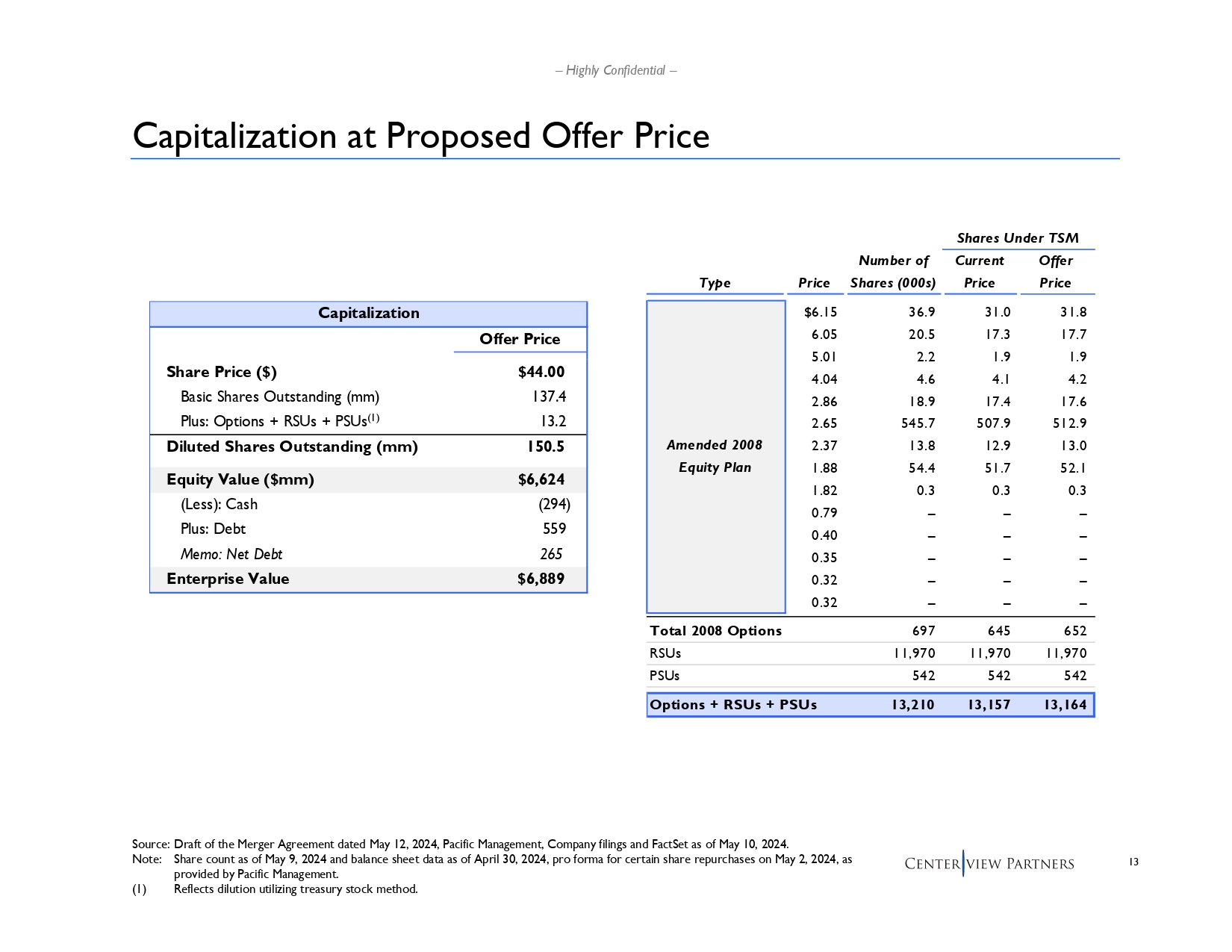 13 – Highly Confidential – Capitalization at Proposed Offer Price Source: Draft of the Merger Agreement dated May 12, 2024, Pacific Management, Company filings and FactSet as of May 10, 2024. Note: Share count as of May 9, 2024 and balance sheet data as of April 30, 2024, pro forma for certain share repurchases on May 2, 2024, as provided by Pacific Management. (1) Reflects dilution utilizing treasury stock method. Shares Under TSM Number of Current Offer Type Price Shares (000s) Price Price $6.15 36.9 31.0 31.8 6.05 20.5 17.3 17.7 5.01 2.2 1.9 1.9 4.04 4.6 4.1 4.2 2.86 18.9 17.4 17.6 2.65 545.7 507.9 512.9 2.37 13.8 12.9 13.0 1.88 54.4 51.7 52.1 1.82 0.3 0.3 0.3 0.79 – – – 0.40 – – – 0.35 – – – 0.32 – – – 0.32 – – – Total 2008 Options 697 645 652 RSUs 11,970 11,970 11,970 PSUs 542 542 542 Options + RSUs + PSUs 13,210 13,157 13,164 Amended 2008 Equity Plan (1) Capitalization Offer Price Share Price ($) $44.00 Basic Shares Outstanding (mm) 137.4 Plus: Options + RSUs + PSUs 13.2 Diluted Shares Outstanding (mm) 150.5 Equity Value ($mm) $6,624 (Less): Cash (294) Plus: Debt 559 Memo: Net Debt 265 Enterprise Value $6,889
