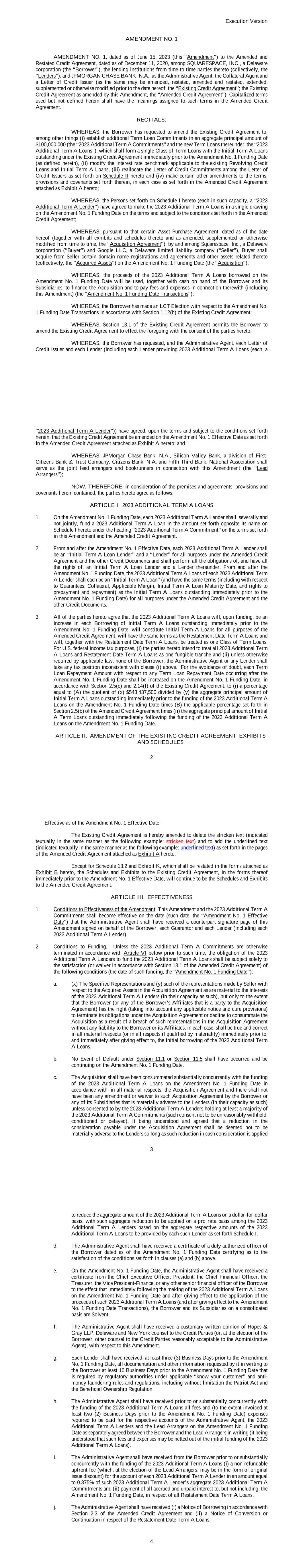 Execution Version AMENDMENT NO. 1 AMENDMENT NO. 1, dated as of June 15, 2023 (this “Amendment”) to the Amended and Restated Credit Agreement, dated as of December 11, 2020, among SQUARESPACE, INC., a Delaware corporation (the “Borrower”), the lending institutions from time to time parties thereto (collectively, the “Lenders”), and JPMORGAN CHASE BANK, N.A., as the Administrative Agent, the Collateral Agent and a Letter of Credit Issuer (as the same may be amended, restated, amended and restated, extended, supplemented or otherwise modified prior to the date hereof, the “Existing Credit Agreement”; the Existing Credit Agreement as amended by this Amendment, the “Amended Credit Agreement”). Capitalized terms used but not defined herein shall have the meanings assigned to such terms in the Amended Credit Agreement. RECITALS: WHEREAS, the Borrower has requested to amend the Existing Credit Agreement to, among other things (i) establish additional Term Loan Commitments in an aggregate principal amount of $100,000,000 (the “2023 Additional Term A Commitments” and the new Term Loans thereunder, the “2023 Additional Term A Loans”), which shall form a single Class of Term Loans with the Initial Term A Loans outstanding under the Existing Credit Agreement immediately prior to the Amendment No. 1 Funding Date (as defined herein), (ii) modify the interest rate benchmark applicable to the existing Revolving Credit Loans and Initial Term A Loans, (iii) reallocate the Letter of Credit Commitments among the Letter of Credit Issuers as set forth on Schedule II hereto and (iv) make certain other amendments to the terms, provisions and covenants set forth therein, in each case as set forth in the Amended Credit Agreement attached as Exhibit A hereto; WHEREAS, the Persons set forth on Schedule I hereto (each in such capacity, a “2023 Additional Term A Lender”) have agreed to make the 2023 Additional Term A Loans in a single drawing on the Amendment No. 1 Funding Date on the terms and subject to the conditions set forth in the Amended Credit Agreement; WHEREAS, pursuant to that certain Asset Purchase Agreement, dated as of the date hereof (together with all exhibits and schedules thereto and as amended, supplemented or otherwise modified from time to time, the “Acquisition Agreement”), by and among Squarespace, Inc., a Delaware corporation (“Buyer”) and Google LLC, a Delaware limited liability company (“Seller”), Buyer shall acquire from Seller certain domain name registrations and agreements and other assets related thereto (collectively, the “Acquired Assets”) on the Amendment No. 1 Funding Date (the “Acquisition”); WHEREAS, the proceeds of the 2023 Additional Term A Loans borrowed on the Amendment No. 1 Funding Date will be used, together with cash on hand of the Borrower and its Subsidiaries, to finance the Acquisition and to pay fees and expenses in connection therewith (including this Amendment) (the “Amendment No. 1 Funding Date Transactions”); WHEREAS, the Borrower has made an LCT Election with respect to the Amendment No. 1 Funding Date Transactions in accordance with Section 1.12(b) of the Existing Credit Agreement; WHEREAS, Section 13.1 of the Existing Credit Agreement permits the Borrower to amend the Existing Credit Agreement to effect the foregoing with the consent of the parties hereto; WHEREAS, the Borrower has requested, and the Administrative Agent, each Letter of Credit Issuer and each Lender (including each Lender providing 2023 Additional Term A Loans (each, a 2 “2023 Additional Term A Lender”)) have agreed, upon the terms and subject to the conditions set forth herein, that the Existing Credit Agreement be amended on the Amendment No. 1 Effective Date as set forth in the Amended Credit Agreement attached as Exhibit A hereto; and WHEREAS, JPMorgan Chase Bank, N.A., Silicon Valley Bank, a division of First- Citizens Bank & Trust Company, Citizens Bank, N.A. and Fifth Third Bank, National Association shall serve as the joint lead arrangers and bookrunners in connection with this Amendment (the “Lead Arrangers”); NOW, THEREFORE, in consideration of the premises and agreements, provisions and covenants herein contained, the parties hereto agree as follows: ARTICLE I. 2023 ADDITIONAL TERM A LOANS 1. On the Amendment No. 1 Funding Date, each 2023 Additional Term A Lender shall, severally and not jointly, fund a 2023 Additional Term A Loan in the amount set forth opposite its name on Schedule I hereto under the heading “2023 Additional Term A Commitment” on the terms set forth in this Amendment and the Amended Credit Agreement. 2. From and after the Amendment No. 1 Effective Date, each 2023 Additional Term A Lender shall be an “Initial Term A Loan Lender” and a “Lender” for all purposes under the Amended Credit Agreement and the other Credit Documents and shall perform all the obligations of, and have all the rights of, an Initial Term A Loan Lender and a Lender thereunder. From and after the Amendment No. 1 Funding Date, the 2023 Additional Term A Loans of each 2023 Additional Term A Lender shall each be an “Initial Term A Loan” (and have the same terms (including with respect to Guarantees, Collateral, Applicable Margin, Initial Term A Loan Maturity Date, and rights to prepayment and repayment) as the Initial Term A Loans outstanding immediately prior to the Amendment No. 1 Funding Date) for all purposes under the Amended Credit Agreement and the other Credit Documents. 3. All of the parties hereto agree that the 2023 Additional Term A Loans will, upon funding, be an increase in each Borrowing of Initial Term A Loans outstanding immediately prior to the Amendment No. 1 Funding Date, will constitute Initial Term A Loans for all purposes of the Amended Credit Agreement, will have the same terms as the Restatement Date Term A Loans and will, together with the Restatement Date Term A Loans, be treated as one Class of 