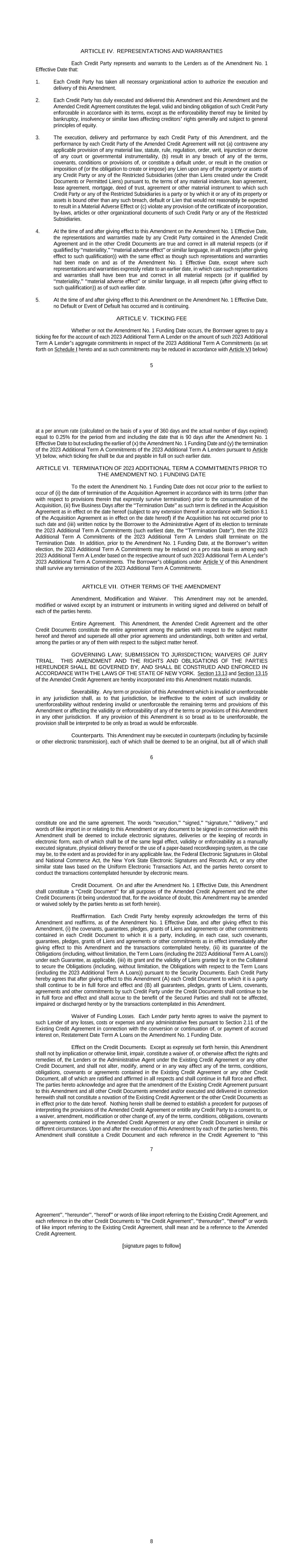 5 ARTICLE IV. REPRESENTATIONS AND WARRANTIES Each Credit Party represents and warrants to the Lenders as of the Amendment No. 1 Effective Date that: 1. Each Credit Party has taken all necessary organizational action to authorize the execution and delivery of this Amendment. 2. Each Credit Party has duly executed and delivered this Amendment and this Amendment and the Amended Credit Agreement constitutes the legal, valid and binding obligation of such Credit Party enforceable in accordance with its terms, except as the enforceability thereof may be limited by bankruptcy, insolvency or similar laws affecting creditors’ rights generally and subject to general principles of equity. 3. The execution, delivery and performance by each Credit Party of this Amendment, and the performance by each Credit Party of the Amended Credit Agreement will not (a) contravene any applicable provision of any material law, statute, rule, regulation, order, writ, injunction or decree of any court or governmental instrumentality, (b) result in any breach of any of the terms, covenants, conditions or provisions of, or constitute a default under, or result in the creation or imposition of (or the obligation to create or impose) any Lien upon any of the property or assets of any Credit Party or any of the Restricted Subsidiaries (other than Liens created under the Credit Documents or Permitted Liens) pursuant to, the terms of any material indenture, loan agreement, lease agreement, mortgage, deed of trust, agreement or other material instrument to which such Credit Party or any of the Restricted Subsidiaries is a party or by which it or any of its property or assets is bound other than any such breach, default or Lien that would not reasonably be expected to result in a Material Adverse Effect or (c) violate any provision of the certificate of incorporation, by-laws, articles or other organizational documents of such Credit Party or any of the Restricted Subsidiaries. 4. At the time of and after giving effect to this Amendment on the Amendment No. 1 Effective Date, the representations and warranties made by any Credit Party contained in the Amended Credit Agreement and in the other Credit Documents are true and correct in all material respects (or if qualified by “materiality,” “material adverse effect” or similar language, in all respects (after giving effect to such qualification)) with the same effect as though such representations and warranties had been made on and as of the Amendment No. 1 Effective Date, except where such representations and warranties expressly relate to an earlier date, in which case such representations and warranties shall have been true and correct in all material respects (or if qualified by “materiality,” “material adverse effect” or similar language, in all respects (after giving effect to such qualification)) as of such earlier date. 5. At the time of and after giving effect to this Amendment on the Amendment No. 1 Effective Date, no Default or Event of Default has occurred and is continuing. ARTICLE V. TICKING FEE Whether or not the Amendment No. 1 Funding Date occurs, the Borrower agrees to pay a ticking fee for the account of each 2023 Additional Term A Lender on the amount of such 2023 Additional Term A Lender’s aggregate commitments in respect of the 2023 Additional Term A Commitments (as set forth on Schedule I hereto and as such commitments may be reduced in accordance with Article VI below) 6 at a per annum rate (calculated on the basis of a year of 360 days and the actual number of days expired) equal to 0.25% for the period from and including the date that is 90 days after the Amendment No. 1 Effective Date to but excluding the earlier of (x) the Amendment No. 1 Funding Date and (y) the termination of the 2023 Additional Term A Commitments of the 2023 Additional Term A Lenders pursuant to Article VI below, which ticking fee shall be due and payable in full on such earlier date. ARTICLE VI. TERMINATION OF 2023 ADDITIONAL TERM A COMMITMENTS PRIOR TO THE AMENDMENT NO. 1 FUNDING DATE To the extent the Amendment No. 1 Funding Date does not occur prior to the earliest to occur of (i) the date of termination of the Acquisition Agreement in accordance with its terms (other than with respect to provisions therein that expressly survive termination) prior to the consummation of the Acquisition, (ii) five Business Days after the “Termination Date” as such term is defined in the Acquisition Agreement as in effect on the date hereof (subject to any extension thereof in accordance with Section 8.1 of the Acquisition Agreement as in effect on the date hereof) if the Acquisition has not occurred prior to such date and (iii) written notice by the Borrower to the Administrative Agent of its election to terminate the 2023 Additional Term A Commitments (such earliest date, the “Termination Date”), then the 2023 Additional Term A Commitments of the 2023 Additional Term A Lenders shall terminate on the Termination Date. In addition, prior to the Amendment No. 1 Funding Date, at the Borrower’s written election, the 2023 Additional Term A Commitments may be reduced on a pro rata basis as among each 2023 Additional Term A Lender based on the respective amount of such 2023 Additional Term A Lender’s 2023 Additional Term A Commitments. The Borrower’s obligations under Article V of this Amendment shall survive any termination of the 2023 Additional Term A Commitments. ARTICLE VII. OTHER TERMS OF THE AMENDMENT Amendment, Modification and Waiver. This Amendment may not be amended, modified or waived except by an instrument or instruments in writing signed and delivered on behalf of each of the parties hereto. Entire Agreement. This Amendment, the Amended Credit Agreement and the other Credit Documents constitute the entire agreement among the parties with respect to the subject matter hereof and thereof and supersede all other prior agreements and understandings, both w