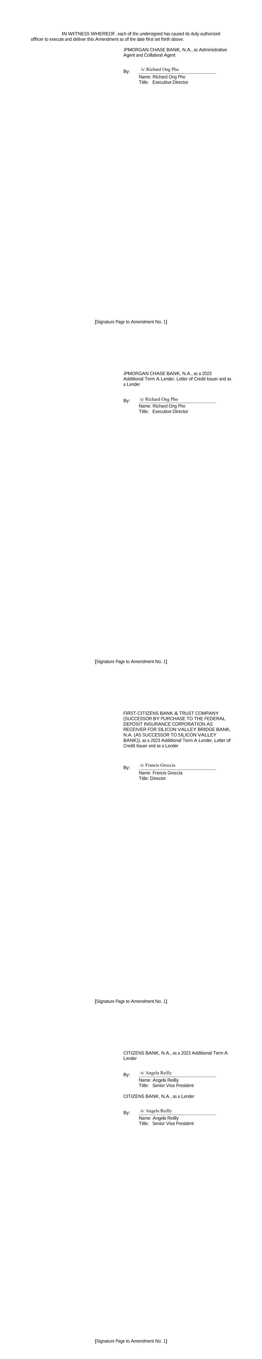 [Signature Page to Amendment No. 1] IN WITNESS WHEREOF, each of the undersigned has caused its duly authorized officer to execute and deliver this Amendment as of the date first set forth above. JPMORGAN CHASE BANK, N.A., as Administrative Agent and Collateral Agent By: Name: Richard Ong Pho Title: Executive Director /s/ Richard Ong Pho [Signature Page to Amendment No. 1] JPMORGAN CHASE BANK, N.A., as a 2023 Additional Term A Lender, Letter of Credit Issuer and as a Lender By: Name: Richard Ong Pho Title: Executive Director /s/ Richard Ong Pho [Signature Page to Amendment No. 1] FIRST-CITIZENS BANK & TRUST COMPANY (SUCCESSOR BY PURCHASE TO THE FEDERAL DEPOSIT INSURANCE CORPORATION AS RECEIVER FOR SILICON VALLEY BRIDGE BANK, N.A. (AS SUCCESSOR TO SILICON VALLEY BANK)), as a 2023 Additional Term A Lender, Letter of Credit Issuer and as a Lender By: Name: Francis Groccia Title: Director /s/ Francis Groccia [Signature Page to Amendment No. 1] CITIZENS BANK, N.A., as a 2023 Additional Term A Lender By: Name: Angela Reilly Title: Senior Vice President CITIZENS BANK, N.A., as a Lender By: Name: Angela Reilly Title: Senior Vice President /s/ Angela Reilly /s/ Angela Reilly