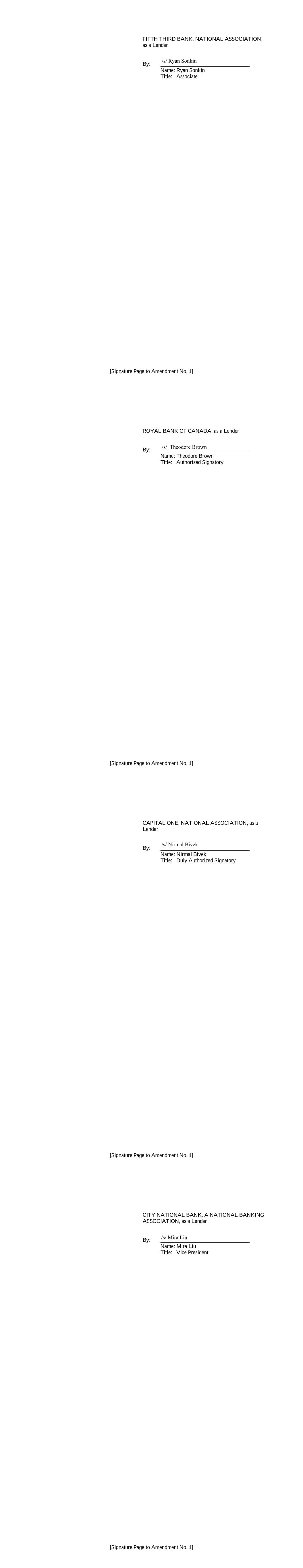 [Signature Page to Amendment No. 1] FIFTH THIRD BANK, NATIONAL ASSOCIATION, as a Lender By: Name: Ryan Sonkin Title: Associate /s/ Ryan Sonkin [Signature Page to Amendment No. 1] ROYAL BANK OF CANADA, as a Lender By: Name: Theodore Brown Title: Authorized Signatory /s/ Theodore Brown [Signature Page to Amendment No. 1] CAPITAL ONE, NATIONAL ASSOCIATION, as a Lender By: Name: Nirmal Bivek Title: Duly Authorized Signatory /s/ Nirmal Bivek [Signature Page to Amendment No. 1] CITY NATIONAL BANK, A NATIONAL BANKING ASSOCIATION, as a Lender By: Name: Mira Liu Title: Vice President /s/ Mira Liu