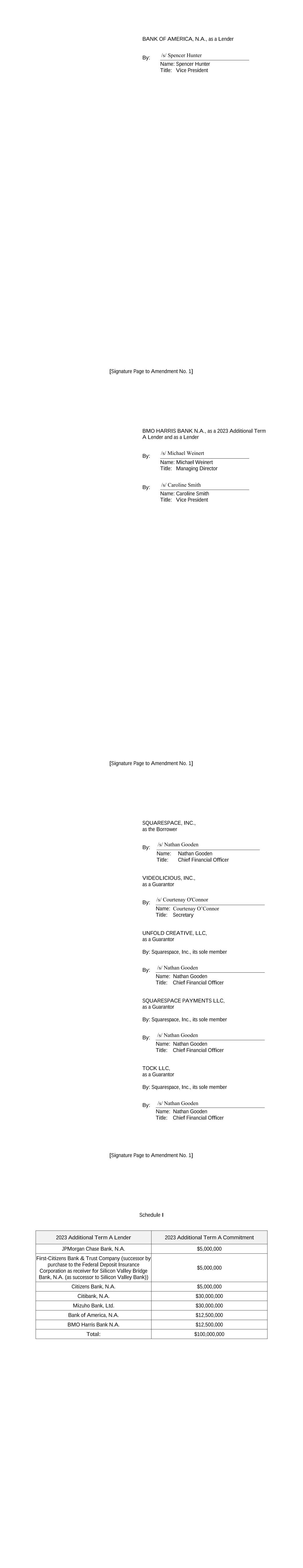 [Signature Page to Amendment No. 1] BANK OF AMERICA, N.A., as a Lender By: Name: Spencer Hunter Title: Vice President /s/ Spencer Hunter [Signature Page to Amendment No. 1] BMO HARRIS BANK N.A., as a 2023 Additional Term A Lender and as a Lender By: Name: Michael Weinert Title: Managing Director By: Name: Caroline Smith Title: Vice President /s/ Michael Weinert /s/ Caroline Smith [Signature Page to Amendment No. 1] SQUARESPACE, INC., as the Borrower By: Name: Nathan Gooden Title: Chief Financial Officer VIDEOLICIOUS, INC., as a Guarantor By: Name: Courtenay O’Connor Title: Secretary UNFOLD CREATIVE, LLC, as a Guarantor By: Squarespace, Inc., its sole member By: Name: Nathan Gooden Title: Chief Financial Officer SQUARESPACE PAYMENTS LLC, as a Guarantor By: Squarespace, Inc., its sole member By: Name: Nathan Gooden Title: Chief Financial Officer TOCK LLC, as a Guarantor By: Squarespace, Inc., its sole member By: Name: Nathan Gooden Title: Chief Financial Officer /s/ Nathan Gooden /s/ Nathan Gooden /s/ Nathan Gooden /s/ Nathan Gooden /s/ Courtenay O'Connor Schedule I 2023 Additional Term A Lender 2023 Additional Term A Commitment JPMorgan Chase Bank, N.A. $5,000,000 First-Citizens Bank & Trust Company (successor by purchase to the Federal Deposit Insurance Corporation as receiver for Silicon Valley Bridge Bank, N.A. (as successor to Silicon Valley Bank)) $5,000,000 Citizens Bank, N.A. $5,000,000 Citibank, N.A. $30,000,000 Mizuho Bank, Ltd. $30,000,000 Bank of America, N.A. $12,500,000 BMO Harris Bank N.A. $12,500,000 Total: $100,000,000