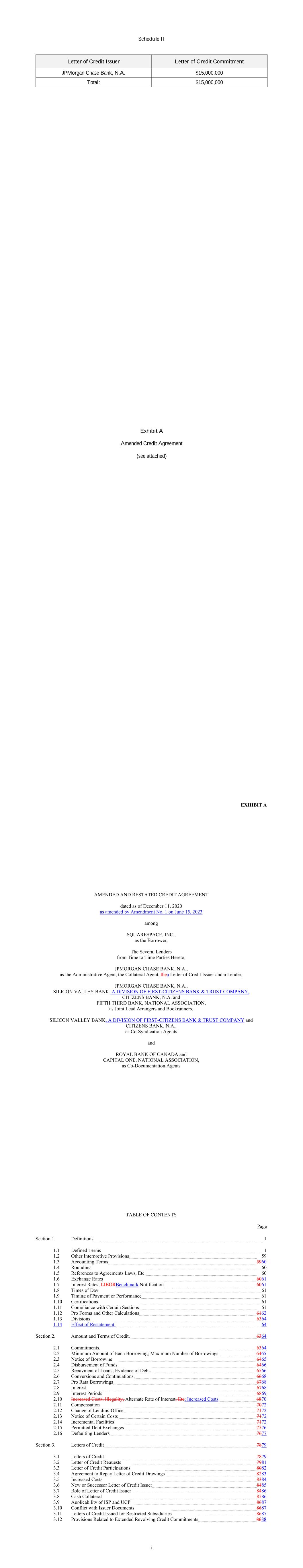 Schedule II Letter of Credit Issuer Letter of Credit Commitment JPMorgan Chase Bank, N.A. $15,000,000 Total: $15,000,000 Exhibit A Amended Credit Agreement (see attached) ACTIVE/106009473.2 EXHIBIT AAMENDED AND RESTATED CREDIT AGREEMENTdated as of December 11, 2020as amended by Amendment No. 1 on June 15, 2023amongSQUARESPACE, INC.,as the Borrower,The Several Lendersfrom Time to Time Parties Hereto,JPMORGAN CHASE BANK, N.A.,as the Administrative Agent, the Collateral Agent, thea Letter of Credit Issuer and a Lender,JPMORGAN CHASE BANK, N.A.,SILICON VALLEY BANK, A DIVISION OF FIRST-CITIZENS BANK & TRUST COMPANY,CITIZENS BANK, N.A. andFIFTH THIRD BANK, NATIONAL ASSOCIATION,as Joint Lead Arrangers and Bookrunners,SILICON VALLEY BANK, A DIVISION OF FIRST-CITIZENS BANK & TRUST COMPANY andCITIZENS BANK, N.A.,as Co-Syndication AgentsandROYAL BANK OF CANADA andCAPITAL ONE, NATIONAL ASSOCIATION,as Co-Documentation Agents TABLE OF CONTENTS PageSection 1. Definitions 11.1 Defined Terms 11.2 Other Interpretive Provisions 591.3 Accounting Terms 59601.4 Rounding 601.5 References to Agreements Laws, Etc. 601.6 Exchange Rates 60611.7 Interest Rates; LIBORBenchmark Notification 60611.8 Times of Day 611.9 Timing of Payment or Performance 611.10 Certifications 611.11 Compliance with Certain Sections 611.12 Pro Forma and Other Calculations 61621.13 Divisions 63641.14 Effect of Restatement. 64Section 2. Amount and Terms of Credit. 63642.1 Commitments. 63642.2 Minimum Amount of Each Borrowing; Maximum Number of Borrowings 64652.3 Notice of Borrowing 64652.4 Disbursement of Funds. 64662.5 Repayment of Loans; Evidence of Debt. 65662.6 Conversions and Continuations. 66682.7 Pro Rata Borrowings 67682.8 Interest. 67682.9 Interest Periods 68692.10 Increased Costs, Illegality, Alternate Rate of Interest, Etc; Increased Costs. 68702.11 Compensation 70722.12 Change of Lending Office 71722.13 Notice of Certain Costs 71722.14 Incremental Facilities 71722.15 Permitted Debt Exchanges 75762.16 Defaulting Lenders 7677Section 3. Letters of Credit 78793.1 Letters of Credit 78793.2 Letter of Credit Requests 79813.3 Letter of Credit Participations 80823.4 Agreement to Repay Letter of Credit Drawings 82833.5 Increased Costs 83843.6 New or Successor Letter of Credit Issuer 84853.7 Role of Letter of Credit Issuer 84863.8 Cash Collateral 85863.9 Applicability of ISP and UCP 86873.10 Conflict with Issuer Documents 86873.11 Letters of Credit Issued for Restricted Subsidiaries 86873.12 Provisions Related to Extended Revolving Credit Commitments 8688i