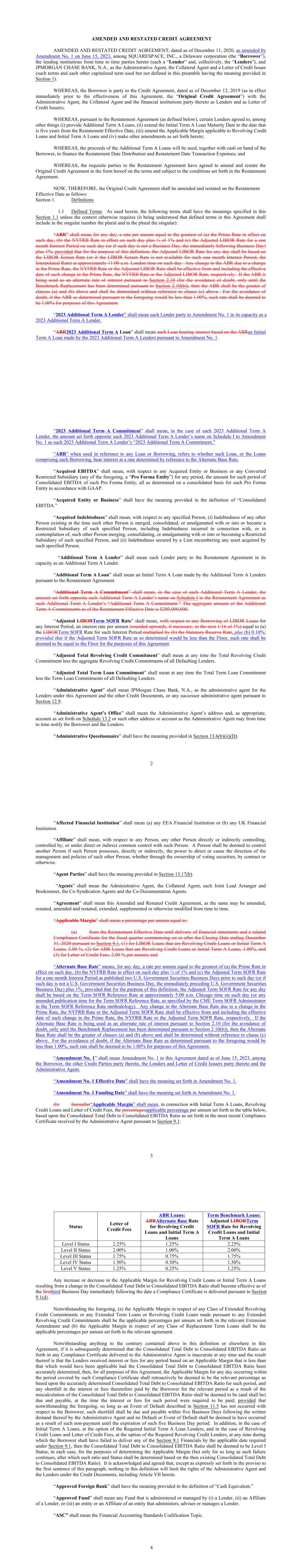 ACTIVE/106009473.2 AMENDED AND RESTATED CREDIT AGREEMENTAMENDED AND RESTATED CREDIT AGREEMENT, dated as of December 11, 2020, as amended byAmendment No. 1 on June 15, 2023, among SQUARESPACE, INC., a Delaware corporation (the “Borrower”),the lending institutions from time to time parties hereto (each a “Lender” and, collectively, the “Lenders”), andJPMORGAN CHASE BANK, N.A., as the Administrative Agent, the Collateral Agent and a Letter of Credit Issuer(such terms and each other capitalized term used but not defined in this preamble having the meaning provided inSection 1).WHEREAS, the Borrower is party to the Credit Agreement, dated as of December 12, 2019 (as in effectimmediately prior to the effectiveness of this Agreement, the “Original Credit Agreement”) with theAdministrative Agent, the Collateral Agent and the financial institutions party thereto as Lenders and as Letter ofCredit Issuers;WHEREAS, pursuant to the Restatement Agreement (as defined below), certain Lenders agreed to, amongother things (i) provide Additional Term A Loans, (ii) extend the Initial Term A Loan Maturity Date to the date thatis five years from the Restatement Effective Date, (iii) amend the Applicable Margin applicable to Revolving CreditLoans and Initial Term A Loans and (iv) make other amendments as set forth herein;WHEREAS, the proceeds of the Additional Term A Loans will be used, together with cash on hand of theBorrower, to finance the Restatement Date Distribution and Restatement Date Transaction Expenses; andWHEREAS, the requisite parties to the Restatement Agreement have agreed to amend and restate theOriginal Credit Agreement in the form hereof on the terms and subject to the conditions set forth in the RestatementAgreement.NOW, THEREFORE, the Original Credit Agreement shall be amended and restated on the RestatementEffective Date as follows:Section 1. Definitions1.1 Defined Terms. As used herein, the following terms shall have the meanings specified in thisSection 1.1 unless the context otherwise requires (it being understood that defined terms in this Agreement shallinclude in the singular number the plural and in the plural the singular):“ABR” shall mean for any day, a rate per annum equal to the greatest of (a) the Prime Rate in effect onsuch day, (b) the NYFRB Rate in effect on such day plus ½ of 1% and (c) the Adjusted LIBOR Rate for a onemonth Interest Period on such day (or if such day is not a Business Day, the immediately following Business Day)plus 1%; provided that for the purpose of this definition, the Adjusted LIBOR Rate for any day shall be based onthe LIBOR Screen Rate (or if the LIBOR Screen Rate is not available for such one month Interest Period, theInterpolated Rate) at approximately 11:00 a.m. London time on such day. Any change in the ABR due to a changein the Prime Rate, the NYFRB Rate or the Adjusted LIBOR Rate shall be effective from and including the effectivedate of such change in the Prime Rate, the NYFRB Rate or the Adjusted LIBOR Rate, respectively. If the ABR isbeing used as an alternate rate of interest pursuant to Section 2.10 (for the avoidance of doubt, only until theBenchmark Replacement has been determined pursuant to Section 2.10(b)), then the ABR shall be the greater ofclauses (a) and (b) above and shall be determined without reference to clause (c) above. For the avoidance ofdoubt, if the ABR as determined pursuant to the foregoing would be less than 1.00%, such rate shall be deemed tobe 1.00% for purposes of this Agreement.“2023 Additional Term A Lender” shall mean each Lender party to Amendment No. 1 in its capacity as a2023 Additional Term A Lender.“ABR2023 Additional Term A Loan” shall mean each Loan bearing interest based on the ABRan InitialTerm A Loan made by the 2023 Additional Term A Lenders pursuant to Amendment No. 1. “2023 Additional Term A Commitment” shall mean, in the case of each 2023 Additional Term ALender, the amount set forth opposite such 2023 Additional Term A Lender’s name on Schedule I to AmendmentNo. 1 as such 2023 Additional Term A Lender’s “2023 Additional Term A Commitment.”“ABR” when used in reference to any Loan or Borrowing, refers to whether such Loan, or the Loanscomprising such Borrowing, bear interest at a rate determined by reference to the Alternate Base Rate.“Acquired EBITDA” shall mean, with respect to any Acquired Entity or Business or any ConvertedRestricted Subsidiary (any of the foregoing, a “Pro Forma Entity”) for any period, the amount for such period ofConsolidated EBITDA of such Pro Forma Entity, all as determined on a consolidated basis for such Pro FormaEntity in accordance with GAAP.“Acquired Entity or Business” shall have the meaning provided in the definition of “ConsolidatedEBITDA.”“Acquired Indebtedness” shall mean, with respect to any specified Person, (i) Indebtedness of any otherPerson existing at the time such other Person is merged, consolidated, or amalgamated with or into or became aRestricted Subsidiary of such specified Person, including Indebtedness incurred in connection with, or incontemplation of, such other Person merging, consolidating, or amalgamating with or into or becoming a RestrictedSubsidiary of such specified Person, and (ii) Indebtedness secured by a Lien encumbering any asset acquired bysuch specified Person. “Additional Term A Lender” shall mean each Lender party to the Restatement Agreement in itscapacity as an Additional Term A Lender.“Additional Term A Loan” shall mean an Initial Term A Loan made by the Additional Term A Lenderspursuant to the Restatement Agreement.“Additional Term A Commitment” shall mean, in the case of each Additional Term A Lender, theamount set forth opposite such Additional Term A Lender’s name on Schedule I to the Restatement Agreement assuch Additional Term A Lender’s “Additional Term A Commitment.” The aggregate amount of the AdditionalTerm A Commitments as of the Res