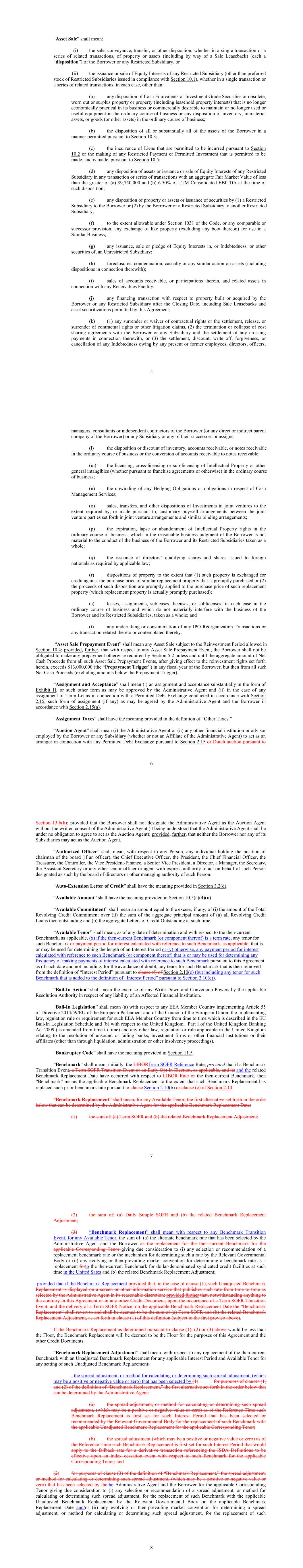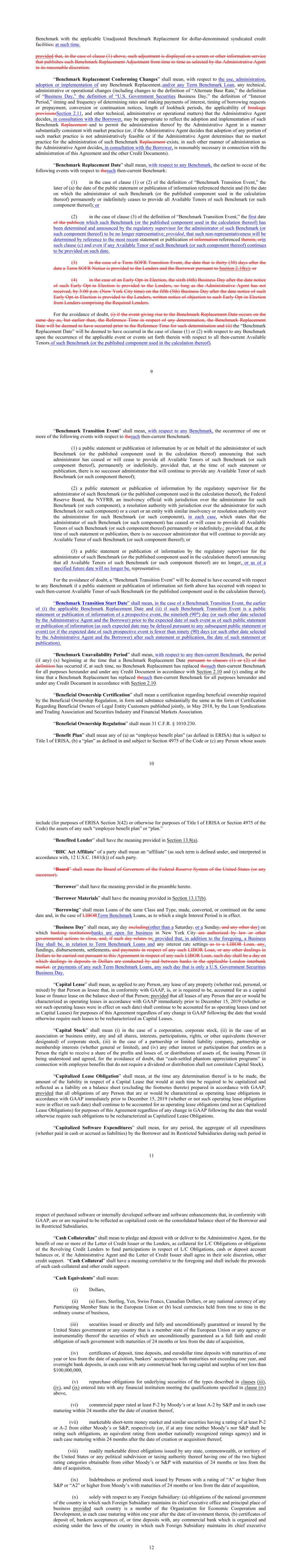 Benchmark with the applicable Unadjusted Benchmark Replacement for dollar-denominated syndicated creditfacilities; at such time.provided that, in the case of clause (1) above, such adjustment is displayed on a screen or other information servicethat publishes such Benchmark Replacement Adjustment from time to time as selected by the Administrative Agentin its reasonable discretion.“Benchmark Replacement Conforming Changes” shall mean, with respect to the use, administration,adoption or implementation of any Benchmark Replacement and/or any Term Benchmark Loan, any technical,administrative or operational changes (including changes to the definition of “Alternate Base Rate,” the definitionof “Business Day,” the definition of “U.S. Government Securities Business Day,” the definition of “InterestPeriod,” timing and frequency of determining rates and making payments of interest, timing of borrowing requestsor prepayment, conversion or continuation notices, length of lookback periods, the applicability of breakageprovisionsSection 2.11, and other technical, administrative or operational matters) that the Administrative Agentdecides, in consultation with the Borrower, may be appropriate to reflect the adoption and implementation of suchBenchmark Replacement and to permit the administration thereof by the Administrative Agent in a mannersubstantially consistent with market practice (or, if the Administrative Agent decides that adoption of any portion ofsuch market practice is not administratively feasible or if the Administrative Agent determines that no marketpractice for the administration of such Benchmark Replacement exists, in such other manner of administration asthe Administrative Agent decides, in consultation with the Borrower, is reasonably necessary in connection with theadministration of this Agreement and the other Credit Documents).“Benchmark Replacement Date” shall mean, with respect to any Benchmark, the earliest to occur of thefollowing events with respect to thesuch then-current Benchmark:(1) in the case of clause (1) or (2) of the definition of “Benchmark Transition Event,” thelater of (a) the date of the public statement or publication of information referenced therein and (b) the dateon which the administrator of such Benchmark (or the published component used in the calculationthereof) permanently or indefinitely ceases to provide all Available Tenors of such Benchmark (or suchcomponent thereof); or(2) in the case of clause (3) of the definition of “Benchmark Transition Event,” the first dateof the publicon which such Benchmark (or the published component used in the calculation thereof) hasbeen determined and announced by the regulatory supervisor for the administrator of such Benchmark (orsuch component thereof) to be no longer representative; provided, that such non-representativeness will bedetermined by reference to the most recent statement or publication of information referenced therein; orinsuch clause (c) and even if any Available Tenor of such Benchmark (or such component thereof) continuesto be provided on such date.(3) in the case of a Term SOFR Transition Event, the date that is thirty (30) days after thedate a Term SOFR Notice is provided to the Lenders and the Borrower pursuant to Section 2.10(c); or(4) in the case of an Early Opt-in Election, the sixth (6th) Business Day after the date noticeof such Early Opt-in Election is provided to the Lenders, so long as the Administrative Agent has notreceived, by 5:00 p.m. (New York City time) on the fifth (5th) Business Day after the date notice of suchEarly Opt-in Election is provided to the Lenders, written notice of objection to such Early Opt-in Electionfrom Lenders comprising the Required Lenders.For the avoidance of doubt, (i) if the event giving rise to the Benchmark Replacement Date occurs on thesame day as, but earlier than, the Reference Time in respect of any determination, the Benchmark ReplacementDate will be deemed to have occurred prior to the Reference Time for such determination and (ii) the “BenchmarkReplacement Date” will be deemed to have occurred in the case of clause (1) or (2) with respect to any Benchmarkupon the occurrence of the applicable event or events set forth therein with respect to all then-current AvailableTenors of such Benchmark (or the published component used in the calculation thereof).9 “Benchmark Transition Event” shall mean, with respect to any Benchmark, the occurrence of one ormore of the following events with respect to thesuch then-current Benchmark:(1) a public statement or publication of information by or on behalf of the administrator of suchBenchmark (or the published component used in the calculation thereof) announcing that suchadministrator has ceased or will cease to provide all Available Tenors of such Benchmark (or suchcomponent thereof), permanently or indefinitely, provided that, at the time of such statement orpublication, there is no successor administrator that will continue to provide any Available Tenor of suchBenchmark (or such component thereof);(2) a public statement or publication of information by the regulatory supervisor for theadministrator of such Benchmark (or the published component used in the calculation thereof), the FederalReserve Board, the NYFRB, an insolvency official with jurisdiction over the administrator for suchBenchmark (or such component), a resolution authority with jurisdiction over the administrator for suchBenchmark (or such component) or a court or an entity with similar insolvency or resolution authority overthe administrator for such Benchmark (or such component), in each case, which states that theadministrator of such Benchmark (or such component) has ceased or will cease to provide all AvailableTenors of such Benchmark (or such component thereof) permanently or indefinitely,; provided that, at thetime of such statement or publication, there is no successor administrator that will 