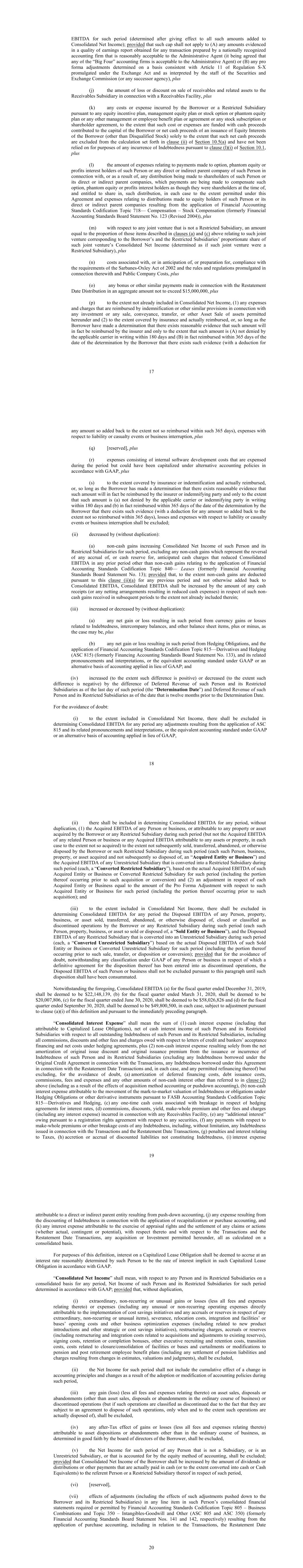EBITDA for such period (determined after giving effect to all such amounts added toConsolidated Net Income); provided that such cap shall not apply to (A) any amounts evidencedin a quality of earnings report obtained for any transaction prepared by a nationally recognizedaccounting firm that is reasonably acceptable to the Administrative Agent (it being agreed thatany of the “Big Four” accounting firms is acceptable to the Administrative Agent) or (B) any proforma adjustments determined on a basis consistent with Article 11 of Regulation S-Xpromulgated under the Exchange Act and as interpreted by the staff of the Securities andExchange Commission (or any successor agency), plus(j) the amount of loss or discount on sale of receivables and related assets to theReceivables Subsidiary in connection with a Receivables Facility, plus(k) any costs or expense incurred by the Borrower or a Restricted Subsidiarypursuant to any equity incentive plan, management equity plan or stock option or phantom equityplan or any other management or employee benefit plan or agreement or any stock subscription orshareholder agreement, to the extent that such cost or expenses are funded with cash proceedscontributed to the capital of the Borrower or net cash proceeds of an issuance of Equity Interestsof the Borrower (other than Disqualified Stock) solely to the extent that such net cash proceedsare excluded from the calculation set forth in clause (ii) of Section 10.5(a) and have not beenrelied on for purposes of any incurrence of Indebtedness pursuant to clause (l)(i) of Section 10.1,plus (l) the amount of expenses relating to payments made to option, phantom equity orprofits interest holders of such Person or any direct or indirect parent company of such Person inconnection with, or as a result of, any distribution being made to shareholders of such Person orits direct or indirect parent companies, which payments are being made to compensate suchoption, phantom equity or profits interest holders as though they were shareholders at the time of,and entitled to share in, such distribution, in each case to the extent permitted under thisAgreement and expenses relating to distributions made to equity holders of such Person or itsdirect or indirect parent companies resulting from the application of Financial AccountingStandards Codification Topic 718— Compensation – Stock Compensation (formerly FinancialAccounting Standards Board Statement No. 123 (Revised 2004)), plus(m) with respect to any joint venture that is not a Restricted Subsidiary, an amountequal to the proportion of those items described in clauses (a) and (c) above relating to such jointventure corresponding to the Borrower’s and the Restricted Subsidiaries’ proportionate share ofsuch joint venture’s Consolidated Net Income (determined as if such joint venture were aRestricted Subsidiary), plus(n) costs associated with, or in anticipation of, or preparation for, compliance withthe requirements of the Sarbanes-Oxley Act of 2002 and the rules and regulations promulgated inconnection therewith and Public Company Costs, plus(o) any bonus or other similar payments made in connection with the RestatementDate Distribution in an aggregate amount not to exceed $15,000,000, plus(p) to the extent not already included in Consolidated Net Income, (1) any expensesand charges that are reimbursed by indemnification or other similar provisions in connection withany investment or any sale, conveyance, transfer, or other Asset Sale of assets permittedhereunder and (2) to the extent covered by insurance and actually reimbursed, or, so long as theBorrower have made a determination that there exists reasonable evidence that such amount willin fact be reimbursed by the insurer and only to the extent that such amount is (A) not denied bythe applicable carrier in writing within 180 days and (B) in fact reimbursed within 365 days of thedate of the determination by the Borrower that there exists such evidence (with a deduction for17 any amount so added back to the extent not so reimbursed within such 365 days), expenses withrespect to liability or casualty events or business interruption, plus(q) [reserved], plus(r) expenses consisting of internal software development costs that are expensedduring the period but could have been capitalized under alternative accounting policies inaccordance with GAAP, plus(s) to the extent covered by insurance or indemnification and actually reimbursed,or, so long as the Borrower has made a determination that there exists reasonable evidence thatsuch amount will in fact be reimbursed by the insurer or indemnifying party and only to the extentthat such amount is (a) not denied by the applicable carrier or indemnifying party in writingwithin 180 days and (b) in fact reimbursed within 365 days of the date of the determination by theBorrower that there exists such evidence (with a deduction for any amount so added back to theextent not so reimbursed within 365 days), losses and expenses with respect to liability or casualtyevents or business interruption shall be excluded;(ii) decreased by (without duplication):(a) non-cash gains increasing Consolidated Net Income of such Person and itsRestricted Subsidiaries for such period, excluding any non-cash gains which represent the reversalof any accrual of, or cash reserve for, anticipated cash charges that reduced ConsolidatedEBITDA in any prior period other than non-cash gains relating to the application of FinancialAccounting Standards Codification Topic 840— Leases (formerly Financial AccountingStandards Board Statement No. 13); provided that, to the extent non-cash gains are deductedpursuant to this clause (ii)(a) for any previous period and not otherwise added back toConsolidated EBITDA, Consolidated EBITDA shall be increased by the amount of any cashreceipts (or any netting arrangements resulting in reduced cash expenses) in respect of such non-cash gains received in subsequent periods t