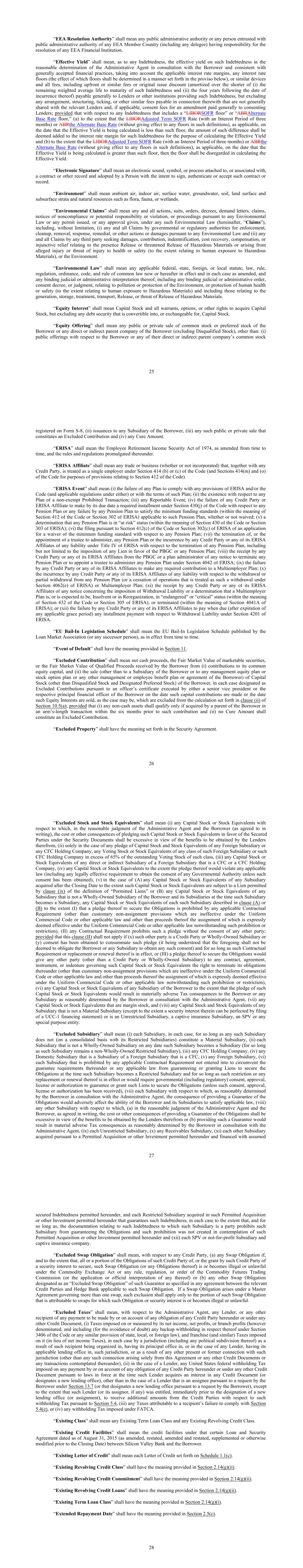 “Extended Revolving Credit Commitments” shall have the meaning provided in Section 2.14(g)(ii).“Extended Revolving Credit Loans” shall have the meaning provided in Section 2.14(g)(ii).“Extended Revolving Loan Maturity Date” shall mean the date on which any tranche of ExtendedRevolving Credit Loans matures.“Extended Term Loan Repayment Amount” shall have the meaning provided in Section 2.5(c).“Extended Term Loans” shall have the meaning provided in Section 2.14(g)(i).“Extending Lender” shall have the meaning provided in Section 2.14(g)(iii).“Extension Amendment” shall have the meaning provided in Section 2.14(g)(iv).“Extension Date” shall have the meaning provided in Section 2.14(g)(v).“Extension Election” shall have the meaning provided in Section 2.14(g)(iii).“Extension Request” shall mean a Term Loan Extension Request.“Extension Series” shall mean all Extended Term Loans and Extended Revolving Credit Commitmentsthat are established pursuant to the same Extension Amendment (or any subsequent Extension Amendment to theextent such Extension Amendment expressly provides that the Extended Term Loans or Extended Revolving CreditCommitments, as applicable, provided for therein are intended to be a part of any previously established ExtensionSeries) and that provide for the same interest margins, extension fees, and amortization schedule.“Fair Market Value” shall mean with respect to any asset or group of assets on any date of determination,the value of the consideration obtainable in a sale of such asset at such date of determination assuming a sale by awilling seller to a willing purchaser dealing at arm’s length and arranged in an orderly manner over a reasonableperiod of time having regard to the nature and characteristics of such asset, as determined in good faith by theBorrower.“FATCA” shall mean Sections 1471 through 1474 of the Code, as of the date of this Agreement (or anyamended or successor version that is substantively comparable and not materially more onerous to comply with),any current or future regulations or official interpretations thereof, any agreements entered into pursuant to Section1471(b)(1) of the Code as of the date of this Agreement (or any amended or successor version described above),and any intergovernmental agreements (or related legislation or official administrative rules or practices)implementing the foregoing.“FCPA” shall have the meaning provided in Section 8.19(b).“Federal Funds Effective Rate” shall mean, for any day, the rate calculated by the NYFRB based on suchday’s federal funds transactions by depositary institutions, as determined in such manner as shall be set forth on theFederal Reserve Bank of New York’sNYFRB’s Website from time to time, and published on the next succeedingBusiness Day by the NYFRB as the effective federal funds rate; provided that if the Federal Funds Effective Rate asso determined would be less than zero, such rate shall be deemed to be zero for the purposes of this Agreement.“Federal Reserve Bank of New York’s Website” shall mean the website of the NYFRB athttp://www.newyorkfed.org, or any successor source.Board” means the Board of Governors of the Federal ReserveSystem of the United States of America.“Fees” shall mean all amounts payable pursuant to, or referred to in, Section 4.1.29 “First-Citizens Bank” shall mean First-Citizens Bank & Trust Company (successor by purchase to theFederal Deposit Insurance Corporation as receiver for Silicon Valley Bridge Bank, N.A. (as successor to SiliconValley Bank)).“Fixed Charge Coverage Ratio” shall mean, as of any date of determination, the ratio of (i) ConsolidatedEBITDA of the Borrower and its Restricted Subsidiaries on a consolidated basis for the Test Period then last endedto (ii) the Fixed Charges of the Borrower and its Restricted Subsidiaries on a consolidated basis for such TestPeriod. In the event that Borrower or any Restricted Subsidiary incurs, assumes, guarantees, redeems, retires, orextinguishes any Indebtedness or issues or redeems Disqualified Stock, preferred stock (including any DesignatedPreferred Stock) or any Refunding Capital Stock subsequent to the commencement of the Test Period but prior to orsimultaneously with the date of determination, then the Fixed Charge Coverage Ratio shall be calculated giving ProForma Effect to such incurrence, assumption, guarantee, redemption, retirement, or extinguishment of Indebtedness,or such issuance or redemption of Disqualified Stock, preferred stock (including any Designated Preferred Stock) orany Refunding Capital Stock (in each case, including a pro forma application of the net proceeds therefrom), as ifthe same had occurred at the beginning of the Test Period.“Fixed Charges” shall mean, with respect to any Person and its Restricted Subsidiaries for any period, thesum of: (i) Consolidated Interest Expense of such Person and its Restricted Subsidiaries for suchperiod, (ii) all cash dividend payments (excluding items eliminated in consolidation) on any series ofpreferred stock (including any Designated Preferred Stock) or any Refunding Capital Stock of such Personmade during such period, and(iii) all cash dividend payments (excluding items eliminated in consolidation) on any series ofDisqualified Stock made during such period.“Flood Insurance Laws” shall mean, collectively, (i) the National Flood Insurance Act of 1968 as now orhereafter in effect or any successor statute thereto, (ii) the Flood Disaster Protection Act of 1973 as now or hereafterin effect or any successor statute thereto, (iii) the National Flood Insurance Reform Act of 1994 as now or hereafterin effect or any successor statute thereto, (iv) the Flood Insurance Reform Act of 2004 as now or hereafter in effector any successor statute thereto and (v) the Biggert-Waters Flood Insurance Reform Act of 2012 as now or hereafterin effect or any successor statute thereto.“Fl