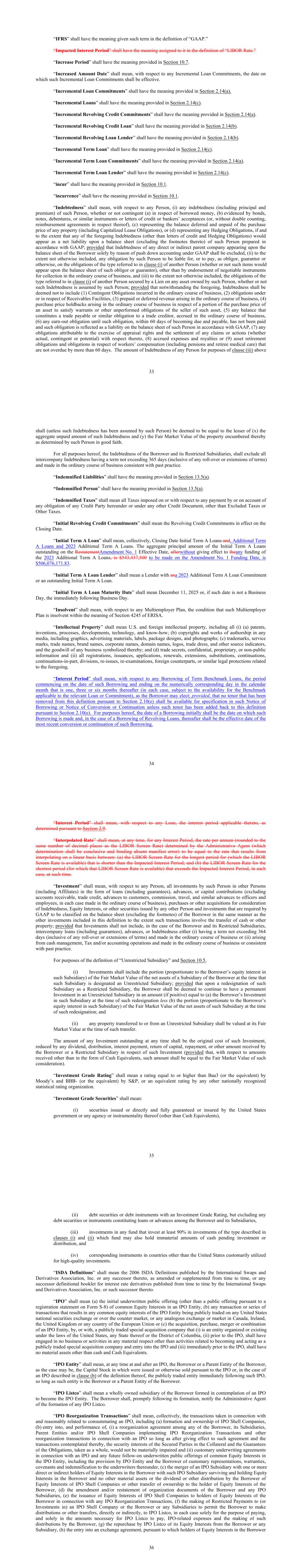 “IFRS” shall have the meaning given such term in the definition of “GAAP.”“Impacted Interest Period” shall have the meaning assigned to it in the definition of “LIBOR Rate.”“Increase Period” shall have the meaning provided in Section 10.7.“Increased Amount Date” shall mean, with respect to any Incremental Loan Commitments, the date onwhich such Incremental Loan Commitments shall be effective.“Incremental Loan Commitments” shall have the meaning provided in Section 2.14(a).“Incremental Loans” shall have the meaning provided in Section 2.14(c).“Incremental Revolving Credit Commitments” shall have the meaning provided in Section 2.14(a).“Incremental Revolving Credit Loan” shall have the meaning provided in Section 2.14(b).“Incremental Revolving Loan Lender” shall have the meaning provided in Section 2.14(b).“Incremental Term Loan” shall have the meaning provided in Section 2.14(c).“Incremental Term Loan Commitments” shall have the meaning provided in Section 2.14(a).“Incremental Term Loan Lender” shall have the meaning provided in Section 2.14(c).“incur” shall have the meaning provided in Section 10.1.“incurrence” shall have the meaning provided in Section 10.1.“Indebtedness” shall mean, with respect to any Person, (i) any indebtedness (including principal andpremium) of such Person, whether or not contingent (a) in respect of borrowed money, (b) evidenced by bonds,notes, debentures, or similar instruments or letters of credit or bankers’ acceptances (or, without double counting,reimbursement agreements in respect thereof), (c) representing the balance deferred and unpaid of the purchaseprice of any property (including Capitalized Lease Obligations), or (d) representing any Hedging Obligations, if andto the extent that any of the foregoing Indebtedness (other than letters of credit and Hedging Obligations) wouldappear as a net liability upon a balance sheet (excluding the footnotes thereto) of such Person prepared inaccordance with GAAP; provided that Indebtedness of any direct or indirect parent company appearing upon thebalance sheet of the Borrower solely by reason of push down accounting under GAAP shall be excluded, (ii) to theextent not otherwise included, any obligation by such Person to be liable for, or to pay, as obligor, guarantor orotherwise, on the obligations of the type referred to in clause (i) of another Person (whether or not such items wouldappear upon the balance sheet of such obligor or guarantor), other than by endorsement of negotiable instrumentsfor collection in the ordinary course of business, and (iii) to the extent not otherwise included, the obligations of thetype referred to in clause (i) of another Person secured by a Lien on any asset owned by such Person, whether or notsuch Indebtedness is assumed by such Person; provided that notwithstanding the foregoing, Indebtedness shall bedeemed not to include (1) Contingent Obligations incurred in the ordinary course of business, (2) obligations underor in respect of Receivables Facilities, (3) prepaid or deferred revenue arising in the ordinary course of business, (4)purchase price holdbacks arising in the ordinary course of business in respect of a portion of the purchase price ofan asset to satisfy warrants or other unperformed obligations of the seller of such asset, (5) any balance thatconstitutes a trade payable or similar obligation to a trade creditor, accrued in the ordinary course of business,(6) any earn-out obligation until such obligation, within 60 days of becoming due and payable, has not been paidand such obligation is reflected as a liability on the balance sheet of such Person in accordance with GAAP, (7) anyobligations attributable to the exercise of appraisal rights and the settlement of any claims or actions (whetheractual, contingent or potential) with respect thereto, (8) accrued expenses and royalties or (9) asset retirementobligations and obligations in respect of workers’ compensation (including pensions and retiree medical care) thatare not overdue by more than 60 days. The amount of Indebtedness of any Person for purposes of clause (iii) above33 shall (unless such Indebtedness has been assumed by such Person) be deemed to be equal to the lesser of (x) theaggregate unpaid amount of such Indebtedness and (y) the Fair Market Value of the property encumbered therebyas determined by such Person in good faith.For all purposes hereof, the Indebtedness of the Borrower and its Restricted Subsidiaries, shall exclude allintercompany Indebtedness having a term not exceeding 365 days (inclusive of any roll-over or extensions of terms)and made in the ordinary course of business consistent with past practice.“Indemnified Liabilities” shall have the meaning provided in Section 13.5(a).“Indemnified Person” shall have the meaning provided in Section 13.5(a).“Indemnified Taxes” shall mean all Taxes imposed on or with respect to any payment by or on account ofany obligation of any Credit Party hereunder or under any other Credit Document, other than Excluded Taxes orOther Taxes.“Initial Revolving Credit Commitments” shall mean the Revolving Credit Commitments in effect on theClosing Date.“Initial Term A Loan” shall mean, collectively, Closing Date Initial Term A Loans and, Additional TermA Loans and 2023 Additional Term A Loans. The aggregate principal amount of the Initial Term A Loansoutstanding on the RestatementAmendment No. 1 Effective Date, afterwithout giving effect to theany funding ofthe 2023 Additional Term A Loans, is $543,437,500 to be made on the Amendment No. 1 Funding Date, is$506,076,171.83.“Initial Term A Loan Lender” shall mean a Lender with ana 2023 Additional Term A Loan Commitmentor an outstanding Initial Term A Loan.“Initial Term A Loan Maturity Date” shall mean December 11, 2025 or, if such date is not a BusinessDay, the immediately following Business Day.“Insolvent” shall mean, with r