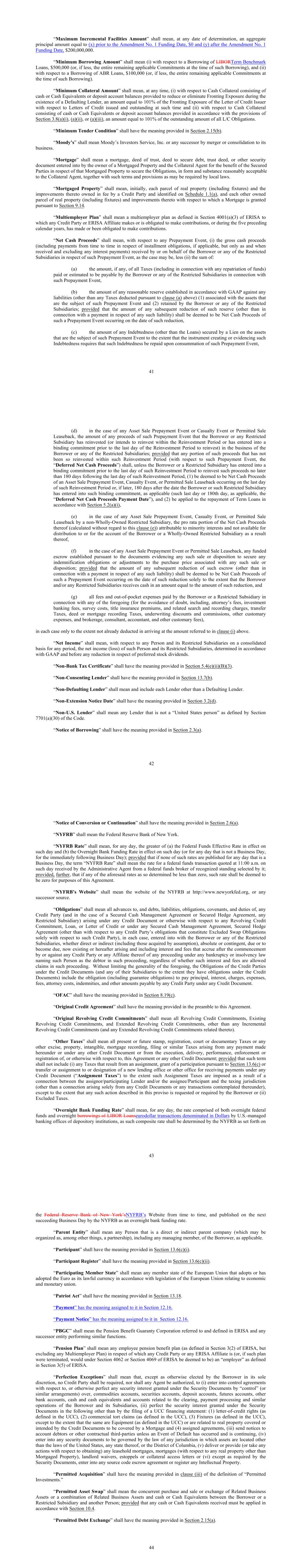 “Maximum Incremental Facilities Amount” shall mean, at any date of determination, an aggregateprincipal amount equal to (x) prior to the Amendment No. 1 Funding Date, $0 and (y) after the Amendment No. 1Funding Date, $200,000,000.“Minimum Borrowing Amount” shall mean (i) with respect to a Borrowing of LIBORTerm BenchmarkLoans, $500,000 (or, if less, the entire remaining applicable Commitments at the time of such Borrowing), and (ii)with respect to a Borrowing of ABR Loans, $100,000 (or, if less, the entire remaining applicable Commitments atthe time of such Borrowing).“Minimum Collateral Amount” shall mean, at any time, (i) with respect to Cash Collateral consisting ofcash or Cash Equivalents or deposit account balances provided to reduce or eliminate Fronting Exposure during theexistence of a Defaulting Lender, an amount equal to 101% of the Fronting Exposure of the Letter of Credit Issuerwith respect to Letters of Credit issued and outstanding at such time and (ii) with respect to Cash Collateralconsisting of cash or Cash Equivalents or deposit account balances provided in accordance with the provisions ofSection 3.8(a)(i), (a)(ii), or (a)(iii), an amount equal to 101% of the outstanding amount of all L/C Obligations.“Minimum Tender Condition” shall have the meaning provided in Section 2.15(b).“Moody’s” shall mean Moody’s Investors Service, Inc. or any successor by merger or consolidation to itsbusiness.“Mortgage” shall mean a mortgage, deed of trust, deed to secure debt, trust deed, or other securitydocument entered into by the owner of a Mortgaged Property and the Collateral Agent for the benefit of the SecuredParties in respect of that Mortgaged Property to secure the Obligations, in form and substance reasonably acceptableto the Collateral Agent, together with such terms and provisions as may be required by local laws.“Mortgaged Property” shall mean, initially, each parcel of real property (including fixtures) and theimprovements thereto owned in fee by a Credit Party and identified on Schedule 1.1(a), and each other ownedparcel of real property (including fixtures) and improvements thereto with respect to which a Mortgage is grantedpursuant to Section 9.14.“Multiemployer Plan” shall mean a multiemployer plan as defined in Section 4001(a)(3) of ERISA towhich any Credit Party or ERISA Affiliate makes or is obligated to make contributions, or during the five precedingcalendar years, has made or been obligated to make contributions.“Net Cash Proceeds” shall mean, with respect to any Prepayment Event, (i) the gross cash proceeds(including payments from time to time in respect of installment obligations, if applicable, but only as and whenreceived and excluding any interest payments) received by or on behalf of the Borrower or any of the RestrictedSubsidiaries in respect of such Prepayment Event, as the case may be, less (ii) the sum of:(a) the amount, if any, of all Taxes (including in connection with any repatriation of funds)paid or estimated to be payable by the Borrower or any of the Restricted Subsidiaries in connection withsuch Prepayment Event,(b) the amount of any reasonable reserve established in accordance with GAAP against anyliabilities (other than any Taxes deducted pursuant to clause (a) above) (1) associated with the assets thatare the subject of such Prepayment Event and (2) retained by the Borrower or any of the RestrictedSubsidiaries; provided that the amount of any subsequent reduction of such reserve (other than inconnection with a payment in respect of any such liability) shall be deemed to be Net Cash Proceeds ofsuch a Prepayment Event occurring on the date of such reduction,(c) the amount of any Indebtedness (other than the Loans) secured by a Lien on the assetsthat are the subject of such Prepayment Event to the extent that the instrument creating or evidencing suchIndebtedness requires that such Indebtedness be repaid upon consummation of such Prepayment Event,41 (d) in the case of any Asset Sale Prepayment Event or Casualty Event or Permitted SaleLeaseback, the amount of any proceeds of such Prepayment Event that the Borrower or any RestrictedSubsidiary has reinvested (or intends to reinvest within the Reinvestment Period or has entered into abinding commitment prior to the last day of the Reinvestment Period to reinvest) in the business of theBorrower or any of the Restricted Subsidiaries; provided that any portion of such proceeds that has notbeen so reinvested within such Reinvestment Period (with respect to such Prepayment Event, the“Deferred Net Cash Proceeds”) shall, unless the Borrower or a Restricted Subsidiary has entered into abinding commitment prior to the last day of such Reinvestment Period to reinvest such proceeds no laterthan 180 days following the last day of such Reinvestment Period, (1) be deemed to be Net Cash Proceedsof an Asset Sale Prepayment Event, Casualty Event, or Permitted Sale Leaseback occurring on the last dayof such Reinvestment Period or, if later, 180 days after the date the Borrower or such Restricted Subsidiaryhas entered into such binding commitment, as applicable (such last day or 180th day, as applicable, the“Deferred Net Cash Proceeds Payment Date”), and (2) be applied to the repayment of Term Loans inaccordance with Section 5.2(a)(i),(e) in the case of any Asset Sale Prepayment Event, Casualty Event, or Permitted SaleLeaseback by a non-Wholly-Owned Restricted Subsidiary, the pro rata portion of the Net Cash Proceedsthereof (calculated without regard to this clause (e)) attributable to minority interests and not available fordistribution to or for the account of the Borrower or a Wholly-Owned Restricted Subsidiary as a resultthereof, (f) in the case of any Asset Sale Prepayment Event or Permitted Sale Leaseback, any fundedescrow established pursuant to the documents evidencing any such sale or disposition to secure anyindemnification obligations or adjustments to the purch