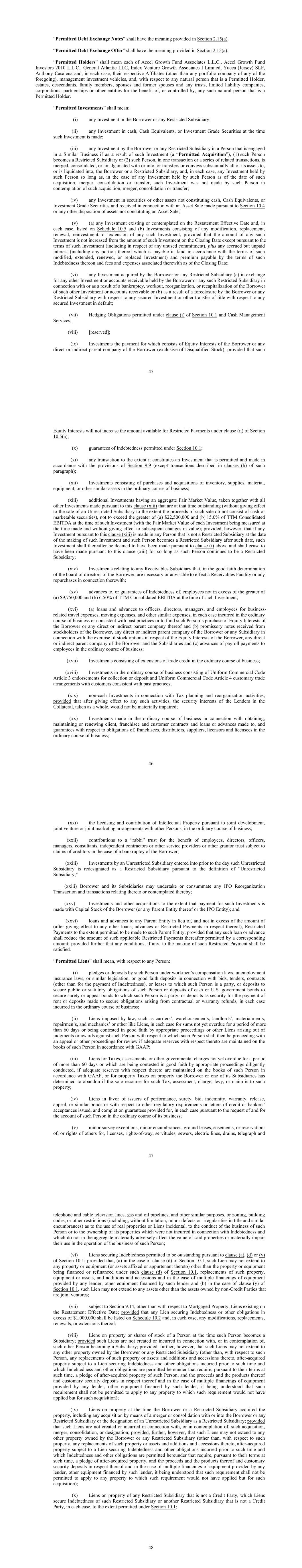 “Permitted Debt Exchange Notes” shall have the meaning provided in Section 2.15(a).“Permitted Debt Exchange Offer” shall have the meaning provided in Section 2.15(a).“Permitted Holders” shall mean each of Accel Growth Fund Associates L.L.C., Accel Growth FundInvestors 2010 L.L.C., General Atlantic LLC, Index Venture Growth Associates I Limited, Yucca (Jersey) SLP,Anthony Casalena and, in each case, their respective Affiliates (other than any portfolio company of any of theforegoing), management investment vehicles, and, with respect to any natural person that is a Permitted Holder,estates, descendants, family members, spouses and former spouses and any trusts, limited liability companies,corporations, partnerships or other entities for the benefit of, or controlled by, any such natural person that is aPermitted Holder.“Permitted Investments” shall mean:(i) any Investment in the Borrower or any Restricted Subsidiary;(ii) any Investment in cash, Cash Equivalents, or Investment Grade Securities at the timesuch Investment is made;(iii) any Investment by the Borrower or any Restricted Subsidiary in a Person that is engagedin a Similar Business if as a result of such Investment (a “Permitted Acquisition”), (1) such Personbecomes a Restricted Subsidiary or (2) such Person, in one transaction or a series of related transactions, ismerged, consolidated, or amalgamated with or into, or transfers or conveys substantially all of its assets to,or is liquidated into, the Borrower or a Restricted Subsidiary, and, in each case, any Investment held bysuch Person so long as, in the case of any Investment held by such Person as of the date of suchacquisition, merger, consolidation or transfer, such Investment was not made by such Person incontemplation of such acquisition, merger, consolidation or transfer;(iv) any Investment in securities or other assets not constituting cash, Cash Equivalents, orInvestment Grade Securities and received in connection with an Asset Sale made pursuant to Section 10.4or any other disposition of assets not constituting an Asset Sale;(v) (a) any Investment existing or contemplated on the Restatement Effective Date and, ineach case, listed on Schedule 10.5 and (b) Investments consisting of any modification, replacement,renewal, reinvestment, or extension of any such Investment; provided that the amount of any suchInvestment is not increased from the amount of such Investment on the Closing Date except pursuant to theterms of such Investment (including in respect of any unused commitment), plus any accrued but unpaidinterest (including any portion thereof which is payable in kind in accordance with the terms of suchmodified, extended, renewed, or replaced Investment) and premium payable by the terms of suchIndebtedness thereon and fees and expenses associated therewith as of the Closing Date;(vi) any Investment acquired by the Borrower or any Restricted Subsidiary (a) in exchangefor any other Investment or accounts receivable held by the Borrower or any such Restricted Subsidiary inconnection with or as a result of a bankruptcy, workout, reorganization, or recapitalization of the Borrowerof such other Investment or accounts receivable or (b) as a result of a foreclosure by the Borrower or anyRestricted Subsidiary with respect to any secured Investment or other transfer of title with respect to anysecured Investment in default;(vii) Hedging Obligations permitted under clause (j) of Section 10.1 and Cash ManagementServices;(viii) [reserved];(ix) Investments the payment for which consists of Equity Interests of the Borrower or anydirect or indirect parent company of the Borrower (exclusive of Disqualified Stock); provided that such45 Equity Interests will not increase the amount available for Restricted Payments under clause (ii) of Section10.5(a); (x) guarantees of Indebtedness permitted under Section 10.1;(xi) any transaction to the extent it constitutes an Investment that is permitted and made inaccordance with the provisions of Section 9.9 (except transactions described in clauses (b) of suchparagraph);(xii) Investments consisting of purchases and acquisitions of inventory, supplies, material,equipment, or other similar assets in the ordinary course of business;(xiii) additional Investments having an aggregate Fair Market Value, taken together with allother Investments made pursuant to this clause (xiii) that are at that time outstanding (without giving effectto the sale of an Unrestricted Subsidiary to the extent the proceeds of such sale do not consist of cash ormarketable securities), not to exceed the greater of (a) $22,500,000 and (b) 15.0% of TTM ConsolidatedEBITDA at the time of such Investment (with the Fair Market Value of each Investment being measured atthe time made and without giving effect to subsequent changes in value); provided, however, that if anyInvestment pursuant to this clause (xiii) is made in any Person that is not a Restricted Subsidiary at the dateof the making of such Investment and such Person becomes a Restricted Subsidiary after such date, suchInvestment shall thereafter be deemed to have been made pursuant to clause (i) above and shall cease tohave been made pursuant to this clause (xiii) for so long as such Person continues to be a RestrictedSubsidiary;(xiv) Investments relating to any Receivables Subsidiary that, in the good faith determinationof the board of directors of the Borrower, are necessary or advisable to effect a Receivables Facility or anyrepurchases in connection therewith;(xv) advances to, or guarantees of Indebtedness of, employees not in excess of the greater of(a) $9,750,000 and (b) 6.50% of TTM Consolidated EBITDA at the time of such Investment;(xvi) (a) loans and advances to officers, directors, managers, and employees for business-related travel expenses, moving expenses, and other similar expenses, in each case incurred in the ordinarycourse of business or consistent with past practices or to fund such P