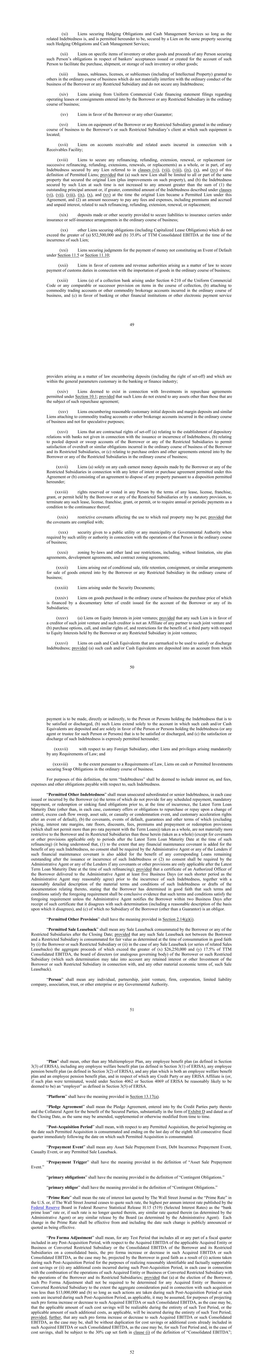 “Asset Sale” shall mean:(i) the sale, conveyance, transfer, or other disposition, whether in a single transaction or aseries of related transactions, of property or assets (including by way of a Sale Leaseback) (each a“disposition”) of the Borrower or any Restricted Subsidiary, or(ii) the issuance or sale of Equity Interests of any Restricted Subsidiary (other than preferredstock of Restricted Subsidiaries issued in compliance with Section 10.1), whether in a single transaction ora series of related transactions, in each case, other than:(a) any disposition of Cash Equivalents or Investment Grade Securities or obsolete,worn out or surplus property or property (including leasehold property interests) that is no longereconomically practical in its business or commercially desirable to maintain or no longer used oruseful equipment in the ordinary course of business or any disposition of inventory, immaterialassets, or goods (or other assets) in the ordinary course of business;(b) the disposition of all or substantially all of the assets of the Borrower in amanner permitted pursuant to Section 10.3;(c) the incurrence of Liens that are permitted to be incurred pursuant to Section10.2 or the making of any Restricted Payment or Permitted Investment that is permitted to bemade, and is made, pursuant to Section 10.5;(d) any disposition of assets or issuance or sale of Equity Interests of any RestrictedSubsidiary in any transaction or series of transactions with an aggregate Fair Market Value of lessthan the greater of (a) $9,750,000 and (b) 6.50% of TTM Consolidated EBITDA at the time ofsuch disposition;(e) any disposition of property or assets or issuance of securities by (1) a RestrictedSubsidiary to the Borrower or (2) by the Borrower or a Restricted Subsidiary to another RestrictedSubsidiary;(f) to the extent allowable under Section 1031 of the Code, or any comparable orsuccessor provision, any exchange of like property (excluding any boot thereon) for use in aSimilar Business;(g) any issuance, sale or pledge of Equity Interests in, or Indebtedness, or othersecurities of, an Unrestricted Subsidiary;(h) foreclosures, condemnation, casualty or any similar action on assets (includingdispositions in connection therewith);(i) sales of accounts receivable, or participations therein, and related assets inconnection with any Receivables Facility;(j) any financing transaction with respect to property built or acquired by theBorrower or any Restricted Subsidiary after the Closing Date, including Sale Leasebacks andasset securitizations permitted by this Agreement;(k) (1) any surrender or waiver of contractual rights or the settlement, release, orsurrender of contractual rights or other litigation claims, (2) the termination or collapse of costsharing agreements with the Borrower or any Subsidiary and the settlement of any crossingpayments in connection therewith, or (3) the settlement, discount, write off, forgiveness, orcancellation of any Indebtedness owing by any present or former employees, directors, officers,5 managers, consultants or independent contractors of the Borrower (or any direct or indirect parentcompany of the Borrower) or any Subsidiary or any of their successors or assigns;(l) the disposition or discount of inventory, accounts receivable, or notes receivablein the ordinary course of business or the conversion of accounts receivable to notes receivable;(m) the licensing, cross-licensing or sub-licensing of Intellectual Property or othergeneral intangibles (whether pursuant to franchise agreements or otherwise) in the ordinary courseof business;(n) the unwinding of any Hedging Obligations or obligations in respect of CashManagement Services;(o) sales, transfers, and other dispositions of Investments in joint ventures to theextent required by, or made pursuant to, customary buy/sell arrangements between the jointventure parties set forth in joint venture arrangements and similar binding arrangements;(p) the expiration, lapse or abandonment of Intellectual Property rights in theordinary course of business, which in the reasonable business judgment of the Borrower is notmaterial to the conduct of the business of the Borrower and its Restricted Subsidiaries taken as awhole; (q) the issuance of directors’ qualifying shares and shares issued to foreignnationals as required by applicable law;(r) dispositions of property to the extent that (1) such property is exchanged forcredit against the purchase price of similar replacement property that is promptly purchased or (2)the proceeds of such disposition are promptly applied to the purchase price of such replacementproperty (which replacement property is actually promptly purchased);(s) leases, assignments, subleases, licenses, or sublicenses, in each case in theordinary course of business and which do not materially interfere with the business of theBorrower and its Restricted Subsidiaries, taken as a whole; and(t) any undertaking or consummation of any IPO Reorganization Transactions orany transaction related thereto or contemplated thereby. “Asset Sale Prepayment Event” shall mean any Asset Sale subject to the Reinvestment Period allowed inSection 10.4; provided, further, that with respect to any Asset Sale Prepayment Event, the Borrower shall not beobligated to make any prepayment otherwise required by Section 5.2 unless and until the aggregate amount of NetCash Proceeds from all such Asset Sale Prepayment Events, after giving effect to the reinvestment rights set forthherein, exceeds $13,000,000 (the “Prepayment Trigger”) in any fiscal year of the Borrower, but then from all suchNet Cash Proceeds (excluding amounts below the Prepayment Trigger).“Assignment and Acceptance” shall mean (i) an assignment and acceptance substantially in the form ofExhibit H, or such other form as may be approved by the Administrative Agent and (ii) in the case of anyassignment of Term Loans in connection with a Permitted Debt Exchange condu