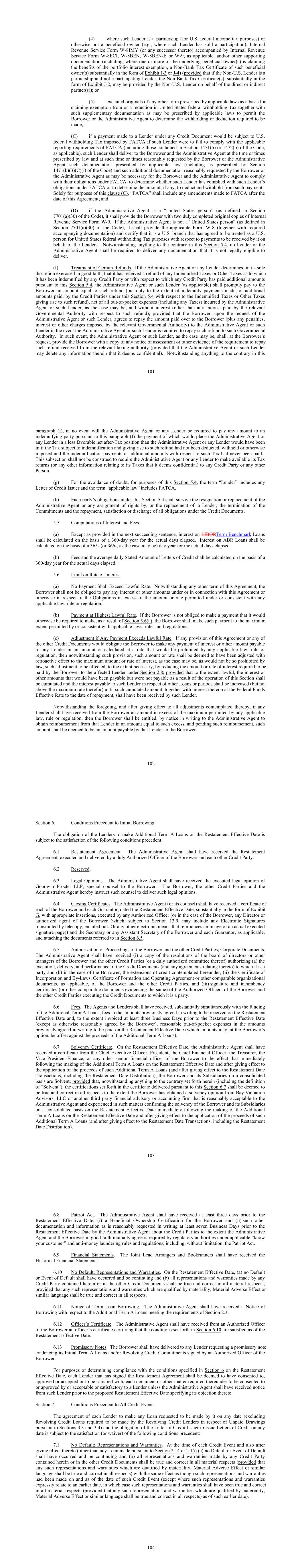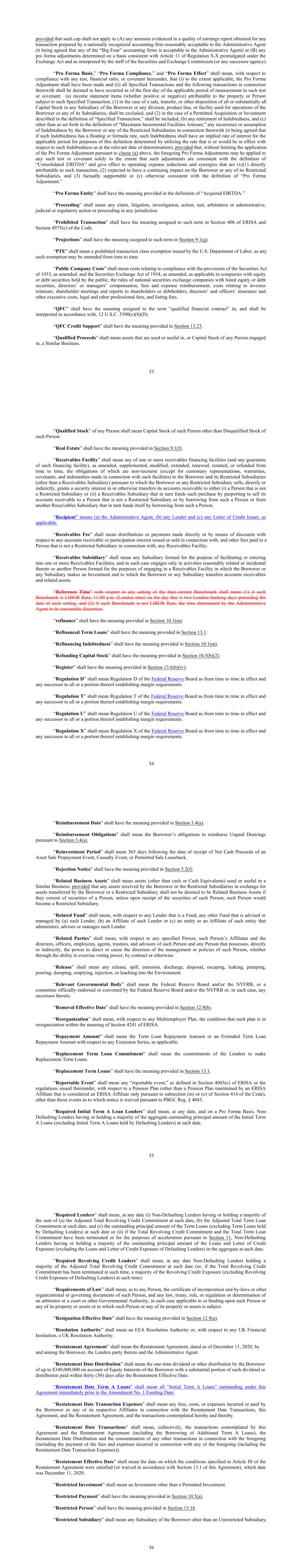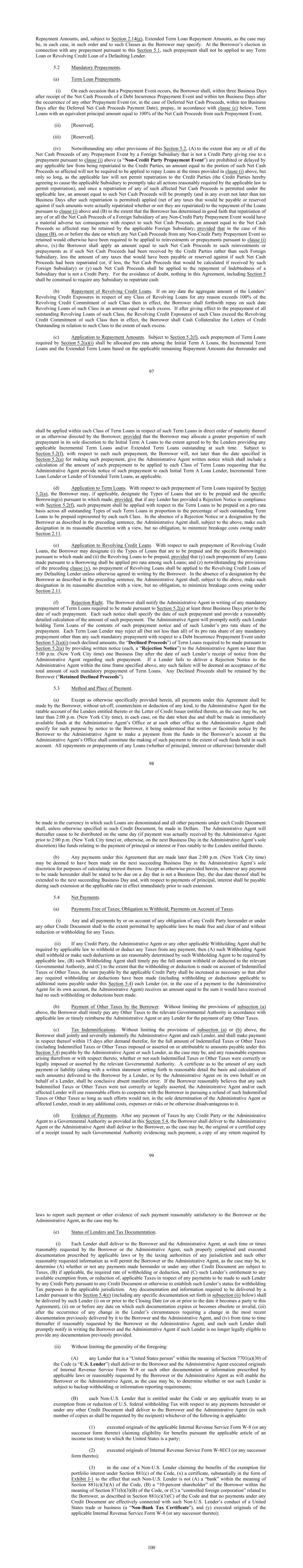 Section 4. Fees 86884.1 Fees 86884.2 Voluntary Reduction of Revolving Credit Commitments 87894.3 Mandatory Termination of Commitments 8889Section 5. Payments 88895.1 Voluntary Prepayments 88895.2 Mandatory Prepayments 88905.3 Method and Place of Payment 90915.4 Net Payments 91925.5 Computations of Interest and Fees 94955.6 Limit on Rate of Interest 9495Section 6. Conditions Precedent to Initial Borrowing 94956.1 Credit Documents 94Restatement Agreement 966.2 CollateralReserved 95966.3 Legal Opinions 95966.4 Closing Certificates 95966.5 Authorization of Proceedings of the Borrower and the other Credit Parties; CorporateDocuments 95966.6 Fees 95966.7 Solvency Certificate 966.8 Patriot Act 966.9 Financial Statements 96976.10 No Default; Representations and Warranties 96976.11 Notice of Term Loan Borrowing 96976.12 Officer’s Certificate 96976.13 Existing Credit Facilities 96Promissory Notes 97Section 7. Conditions Precedent to All Credit Events 96977.1 No Default; Representations and Warranties 977.2 Notice of Borrowing; Letter of Credit Request 97Section 8. Representations and Warranties 97988.1 Corporate Status 97988.2 Corporate Power and Authority 97988.3 No Violation 988.4 Litigation 988.5 Margin Regulations 988.6 Governmental Approvals 98998.7 Investment Company Act 98998.8 True and Complete Disclosure 98998.9 Financial Condition; Financial Statements 998.10 Compliance with Laws; No Default 998.11 Tax Matters 991008.12 Compliance with ERISA 991008.13 Subsidiaries 991008.14 Intellectual Property 991008.15 Environmental Laws 100ii 8.16 Properties 1008.17 Solvency 1001018.18 Patriot Act 1001018.19 OFAC and FCPA 100101Section 9. Affirmative Covenants. 1019.1 Information Covenants 1011029.2 Books, Records, and Inspections 1031049.3 Maintenance of Insurance 1049.4 Payment of Taxes 1041059.5 Preservation of Existence; Consolidated Corporate Franchises 1059.6 Compliance with Statutes, Regulations, Etc. 1059.7 ERISA 1051069.8 Maintenance of Properties 1051069.9 Transactions with Affiliates 1051069.10 End of Fiscal Years 1061079.11 Additional Guarantors and Grantors 1061079.12 Pledge of Additional Stock and Evidence of Indebtedness 1061079.13 Use of Proceeds 1079.14 Further Assurances 1071089.15 Lines of Business 108109Section 10. Negative Covenants 10810910.1 Limitation on Indebtedness 10810910.2 Limitation on Liens 11310.3 Limitation on Fundamental Changes 11311410.4 Limitation on Sale of Assets 11411510.5 Limitation on Restricted Payments 11611710.6 Limitation on Subsidiary Distributions 12112310.7 Consolidated Total Debt to Consolidated EBITDA Ratio 122124Section 11. Events of Default 12312511.1 Payments 12312511.2 Representations, Etc. 12312511.3 Covenants 12312511.4 Default Under Other Agreements 12312611.5 Bankruptcy, Etc. 12412611.6 ERISA 12412611.7 Credit Documents; Guarantee 12412711.8 Pledge Agreement 12412711.9 Security Agreement 12412711.10 Judgments 12512711.11 Change of Control 12512711.12 Remedies Upon Event of Default 12512711.13 Application of Proceeds 12512811.14 Equity Cure 126128Section 12. The Agents 12612912.1 Appointment 12612912.2 Delegation of Duties 12712912.3 Exculpatory Provisions 127130iii 12.4 Reliance by Agents 12713012.5 Notice of Default 12813012.6 Non-Reliance on Administrative Agent, Collateral Agent, and Other Lenders 12813012.7 Indemnification 12813112.8 Agents in Their Individual Capacities 12913212.9 Successor Agents 12913212.10 Withholding Tax 13013312.11 Agents Under Security Documents and Guarantee 13113312.12 Right to Realize on Collateral and Enforce Guarantee 13113412.13 [Reserved] 13213412.14 The Administrative Agent May File Proofs of Claim 13213412.15 ERISA Representation of the Lenders 13213512.16 Erroneous Payments. 136Section 13. Miscellaneous 13313713.1 Amendments, Waivers, and Releases 13313713.2 Notices 13614013.3 No Waiver; Cumulative Remedies 13714013.4 Survival of Representations and Warranties 13714013.5 Payment of Expenses; Indemnification, Limitation of Liability; Indemnification 13714013.6 Successors and Assigns; Participations and Assignments 13814213.7 Replacements of Lenders Under Certain Circumstances 14214513.8 Adjustments; Set-off 14314613.9 Counterparts 14314613.10 Severability 14414713.11 Integration 14414713.12 GOVERNING LAW 14414713.13 Submission to Jurisdiction; Waivers 14414713.14 Acknowledgments 14514813.15 WAIVERS OF JURY TRIAL 14614913.16 Confidentiality 14614913.17 Direct Website Communications 14715013.18 USA PATRIOT Act 14815113.19 [Reserved] 14815113.20 Payments Set Aside 14815213.21 No Fiduciary Duty 14915213.22 [Reserved] 14915213.23 Acknowledgement Regarding Any Supported QFCs 149152Section 14.13.24 Acknowledgement and Consent to Bail-In of Affected Financial Institutions 149153iv SCHEDULESSchedule 1.1(a) Mortgaged PropertiesSchedule 1.1(b) Commitments of Lenders and Letter of Credit IssuersSchedule 1.1(c) Existing Letters of CreditSchedule 8.13 SubsidiariesSchedule 10.1 Restatement Effective Date IndebtednessSchedule 10.2 Restatement Effective Date LiensSchedule 10.5 Restatement Effective Date InvestmentsSchedule 13.2 Notice AddressesEXHIBITSExhibit A Form of Joinder AgreementExhibit B Form of GuaranteeExhibit C Form of Perfection CertificateExhibit D Form of Pledge AgreementExhibit E Form of Security AgreementExhibit F Form of Letter of Credit RequestExhibit G Form of Credit Party Closing CertificateExhibit H Form of Assignment and AcceptanceExhibit I-1 Form of Promissory Note (Initial Term A Loans)Exhibit I-2 Form of Promissory Note (Revolving Credit Loans)Exhibit J-1 Form of Non-Bank Tax Certificate (For Non-U.S. Lenders That Are Not Partnerships For U.S.Federal Income Tax Purposes)Exhibit J-2 Form of Non-Bank Tax Certificate (For Non-U.S. Lenders That Are Partnerships For U.S.Federal Income Tax Purposes)Exhibit J-3 Form of Non-Bank Tax Certificate (For Non-U.S. Participants That Are Not Partnerships ForU.S. Federal Income Tax Purposes)Exhibit J-4 Form of Non-Bank Tax Certificate (For Foreign Participants Th