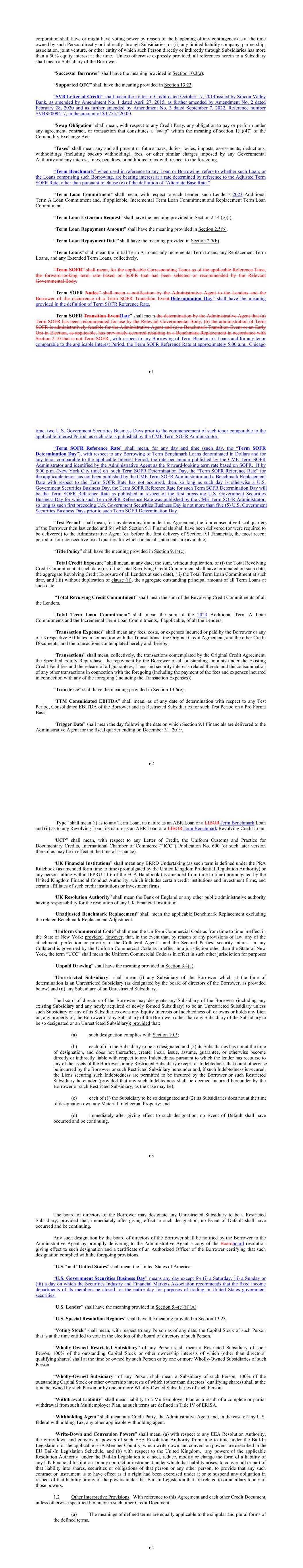 corporation shall have or might have voting power by reason of the happening of any contingency) is at the timeowned by such Person directly or indirectly through Subsidiaries, or (ii) any limited liability company, partnership,association, joint venture, or other entity of which such Person directly or indirectly through Subsidiaries has morethan a 50% equity interest at the time. Unless otherwise expressly provided, all references herein to a Subsidiaryshall mean a Subsidiary of the Borrower.“Successor Borrower” shall have the meaning provided in Section 10.3(a).“Supported QFC” shall have the meaning provided in Section 13.23.“SVB Letter of Credit” shall mean the Letter of Credit dated October 17, 2014 issued by Silicon ValleyBank, as amended by Amendment No. 1 dated April 27, 2015, as further amended by Amendment No. 2 datedFebruary 28, 2020 and as further amended by Amendment No. 3 dated September 7, 2022, Reference numberSVBSF009417, in the amount of $4,755,220.00.“Swap Obligation” shall mean, with respect to any Credit Party, any obligation to pay or perform underany agreement, contract, or transaction that constitutes a “swap” within the meaning of section 1(a)(47) of theCommodity Exchange Act.“Taxes” shall mean any and all present or future taxes, duties, levies, imposts, assessments, deductions,withholdings (including backup withholding), fees, or other similar charges imposed by any GovernmentalAuthority and any interest, fines, penalties, or additions to tax with respect to the foregoing.“Term Benchmark” when used in reference to any Loan or Borrowing, refers to whether such Loan, orthe Loans comprising such Borrowing, are bearing interest at a rate determined by reference to the Adjusted TermSOFR Rate, other than pursuant to clause (c) of the definition of “Alternate Base Rate.”“Term Loan Commitment” shall mean, with respect to each Lender, such Lender’s 2023 AdditionalTerm A Loan Commitment and, if applicable, Incremental Term Loan Commitment and Replacement Term LoanCommitment.“Term Loan Extension Request” shall have the meaning provided in Section 2.14 (g)(i).“Term Loan Repayment Amount” shall have the meaning provided in Section 2.5(b).“Term Loan Repayment Date” shall have the meaning provided in Section 2.5(b).“Term Loans” shall mean the Initial Term A Loans, any Incremental Term Loans, any Replacement TermLoans, and any Extended Term Loans, collectively.“Term SOFR” shall mean, for the applicable Corresponding Tenor as of the applicable Reference Time,the forward-looking term rate based on SOFR that has been selected or recommended by the RelevantGovernmental Body.“Term SOFR Notice” shall mean a notification by the Administrative Agent to the Lenders and theBorrower of the occurrence of a Term SOFR Transition Event.Determination Day” shall have the meaningprovided in the definition of Term SOFR Reference Rate.“Term SOFR Transition EventRate” shall mean the determination by the Administrative Agent that (a)Term SOFR has been recommended for use by the Relevant Governmental Body, (b) the administration of TermSOFR is administratively feasible for the Administrative Agent and (c) a Benchmark Transition Event or an EarlyOpt-in Election, as applicable, has previously occurred resulting in a Benchmark Replacement in accordance withSection 2.10 that is not Term SOFR., with respect to any Borrowing of Term Benchmark Loans and for any tenorcomparable to the applicable Interest Period, the Term SOFR Reference Rate at approximately 5:00 a.m., Chicago61 time, two U.S. Government Securities Business Days prior to the commencement of such tenor comparable to theapplicable Interest Period, as such rate is published by the CME Term SOFR Administrator.“Term SOFR Reference Rate” shall mean, for any day and time (such day, the “Term SOFRDetermination Day”), with respect to any Borrowing of Term Benchmark Loans denominated in Dollars and forany tenor comparable to the applicable Interest Period, the rate per annum published by the CME Term SOFRAdministrator and identified by the Administrative Agent as the forward-looking term rate based on SOFR. If by5:00 p.m. (New York City time) on such Term SOFR Determination Day, the “Term SOFR Reference Rate” forthe applicable tenor has not been published by the CME Term SOFR Administrator and a Benchmark ReplacementDate with respect to the Term SOFR Rate has not occurred, then, so long as such day is otherwise a U.S.Government Securities Business Day, the Term SOFR Reference Rate for such Term SOFR Determination Day willbe the Term SOFR Reference Rate as published in respect of the first preceding U.S. Government SecuritiesBusiness Day for which such Term SOFR Reference Rate was published by the CME Term SOFR Administrator,so long as such first preceding U.S. Government Securities Business Day is not more than five (5) U.S. GovernmentSecurities Business Days prior to such Term SOFR Determination Day.“Test Period” shall mean, for any determination under this Agreement, the four consecutive fiscal quartersof the Borrower then last ended and for which Section 9.1 Financials shall have been delivered (or were required tobe delivered) to the Administrative Agent (or, before the first delivery of Section 9.1 Financials, the most recentperiod of four consecutive fiscal quarters for which financial statements are available).“Title Policy” shall have the meaning provided in Section 9.14(c).“Total Credit Exposure” shall mean, at any date, the sum, without duplication, of (i) the Total RevolvingCredit Commitment at such date (or, if the Total Revolving Credit Commitment shall have terminated on such date,the aggregate Revolving Credit Exposure of all Lenders at such date), (ii) the Total Term Loan Commitment at suchdate, and (iii) without duplication of clause (ii), the aggregate outstanding principal amount of all Term Loans atsuch date. “Total Revolving Credit Commit
