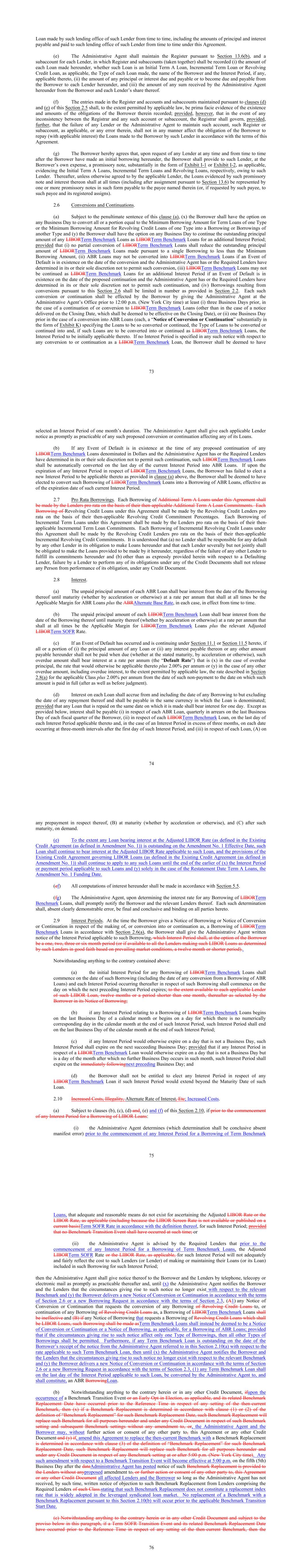 applicable Benchmark Replacement will replace the then-current Benchmark for all purposes hereunder or underany Credit Document in respect of such Benchmark setting and subsequent Benchmark settings, without anyamendment to, or further action or consent of any other party to, this Agreement or any other Credit Document;provided that, this clause (c) shall not be effective unless the Administrative Agent has delivered to the Lenders andthe Borrower a Term SOFR Notice. For the avoidance of doubt, the Administrative Agent shall not be required todeliver a Term SOFR Notice after a Term SOFR Transition Event and may do so in its sole discretion.(c) (d) InNotwithstanding anything to the contrary herein or in any other Credit Document, inconnection with the use, administration, adoption or implementation of a Benchmark Replacement and/or any TermBenchmark Loan, the Administrative Agent will have the right to make Benchmark Replacement ConformingChanges, in consultation with the Borrower, from time to time and, notwithstanding anything to the contrary hereinor in any other Credit Document, any amendments implementing such Benchmark Replacement ConformingChanges will become effective without any further action or consent of any other party to this Agreement or anyother Credit Document.(d) (e) The Administrative Agent will promptly notify the Borrower and the Lenders of (i) anyoccurrence of a Benchmark Transition Event, a Term SOFR Transition Event or an Early Opt-in Election, asapplicable, and its related Benchmark Replacement Date, (ii) the implementation of any Benchmark Replacement,(iiiii) the effectiveness of any Benchmark Replacement Conforming Changes, (iviii) the removal or reinstatement ofany tenor of a Benchmark pursuant to clauseSection 2.10(fe) below and (viv) the commencement or conclusion ofany Benchmark Unavailability Period. Any determination, decision or election that may be made by theAdministrative Agent or, if applicable, any Lender (or group of Lenders) pursuant to this the Borrower as expresslyset forth in Section 2.10(b) through (f) and the defined terms used therein, including any determination with respectto a tenor, rate or adjustment or of the occurrence or non-occurrence of an event, circumstance or date and anydecision to take or refrain from taking any action or any selection, will be conclusive and binding absent manifesterror and may be made in its or their sole discretion and without consent from any other party to this Agreement orany other Credit Document, except, in each case, as expressly required pursuant to this Section 2.10(b) through (f)or any defined terms used therein.(e) (f) Notwithstanding anything to the contrary herein or in any other Credit Document, at any time(including in connection with the implementation of a Benchmark Replacement), (i) if the then-current Benchmarkis a term rate (including the Term SOFR or LIBORReference Rate) and either (A) any tenor for such Benchmark isnot displayed on a screen or other information service that publishes such rate from time to time as selected by theAdministrative Agent in its reasonable discretion and in consultation with the Borrower or (B) the regulatorysupervisor for the administrator of such Benchmark has provided a public statement or publication of informationannouncing that any tenor for such Benchmark is not or will be no longernot be representative, then theAdministrative Agent may, in consultation with the Borrower, modify the definition of “Interest Period” (or anysimilar or analogous definition) for any Benchmark settings at or after such time to remove such unavailable or non-representative tenor and, (ii) if a tenor that was removed pursuant to clause (i) above either (A) is subsequentlydisplayed on a screen or information service for a Benchmark (including a Benchmark Replacement) or (B) is not,or is no longer, subject to an announcement that it is not or will no longernot be representative for a Benchmark(including a Benchmark Replacement), then the Administrative Agent may, in consultation with the Borrower,modify the definition of “Interest Period” (or any similar or analogous definition) for all Benchmark settings at orafter such time to reinstate such previously removed tenor. and (iii) if a new tenor for such Benchmark is displayedon a screen or other information service selected by the Administrative Agent in its reasonable discretion and inconsultation with the Borrower, then the Administrative Agent may, in consultation with the Borrower, modify thedefinition of “Interest Period” (or any similar or analogous definition) for all Benchmark settings at or after suchtime to add such new tenor.(f) (g) Upon the Borrower’s receipt of notice of the commencement of a Benchmark UnavailabilityPeriod, (i) the Borrower may revoke any request for a Eurodollar Borrowing of, conversion to or continuation ofEurodollarTerm Benchmark Loans to be made, converted or continued during any Benchmark UnavailabilityPeriod and, failing that, the Borrower will be deemed to have converted any such request into a request for aBorrowing of or conversion to ABR Loans and (ii) during the continuance of any Benchmark Unavailability Period,any outstanding affected Term Benchmark Loans will be deemed to have been converted to ABR Loans at the endof the applicable Interest Period. During any Benchmark Unavailability Period or at any time that a tenor for the77 then-current Benchmark is not an Available Tenor, the component of ABRthe Alternate Base Rate based upon thethen-current Benchmark or such tenor for such Benchmark, as applicable, will not be used in any determination ofABRthe Alternate Base Rate.(g) (h) If, after the Closing Date, any Change in Law relating to capital adequacy or liquidity of anyLender or compliance by any Lender or its parent with any Change in Law relating to capital adequacy or liquidityoccurring after the Closing Date, has or would have the effect of reducing the actual rate of 