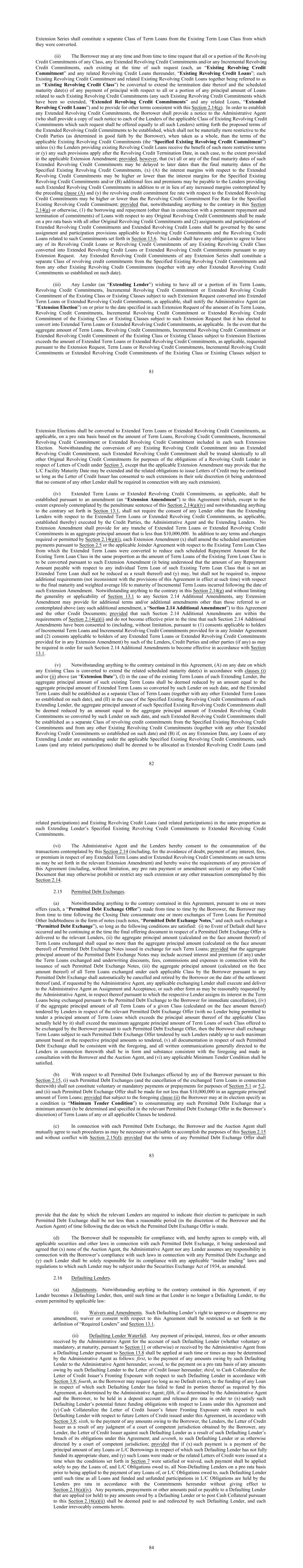 Extension Series shall constitute a separate Class of Term Loans from the Existing Term Loan Class from whichthey were converted.(ii) The Borrower may at any time and from time to time request that all or a portion of the RevolvingCredit Commitments of any Class, any Extended Revolving Credit Commitments and/or any Incremental RevolvingCredit Commitments, each existing at the time of such request (each, an “Existing Revolving CreditCommitment” and any related Revolving Credit Loans thereunder, “Existing Revolving Credit Loans”; eachExisting Revolving Credit Commitment and related Existing Revolving Credit Loans together being referred to asan “Existing Revolving Credit Class”) be converted to extend the termination date thereof and the scheduledmaturity date(s) of any payment of principal with respect to all or a portion of any principal amount of Loansrelated to such Existing Revolving Credit Commitments (any such Existing Revolving Credit Commitments whichhave been so extended, “Extended Revolving Credit Commitments” and any related Loans, “ExtendedRevolving Credit Loans”) and to provide for other terms consistent with this Section 2.14(g). In order to establishany Extended Revolving Credit Commitments, the Borrower shall provide a notice to the Administrative Agent(who shall provide a copy of such notice to each of the Lenders of the applicable Class of Existing Revolving CreditCommitments which such request shall be offered equally to all such Lenders) setting forth the proposed terms ofthe Extended Revolving Credit Commitments to be established, which shall not be materially more restrictive to theCredit Parties (as determined in good faith by the Borrower), when taken as a whole, than the terms of theapplicable Existing Revolving Credit Commitments (the “Specified Existing Revolving Credit Commitment”)unless (x) the Lenders providing existing Revolving Credit Loans receive the benefit of such more restrictive termsor (y) any such provisions apply after the Revolving Credit Termination Date, in each case, to the extent providedin the applicable Extension Amendment; provided, however, that (w) all or any of the final maturity dates of suchExtended Revolving Credit Commitments may be delayed to later dates than the final maturity dates of theSpecified Existing Revolving Credit Commitments, (x) (A) the interest margins with respect to the ExtendedRevolving Credit Commitments may be higher or lower than the interest margins for the Specified ExistingRevolving Credit Commitments and/or (B) additional fees and premiums may be payable to the Lenders providingsuch Extended Revolving Credit Commitments in addition to or in lieu of any increased margins contemplated bythe preceding clause (A) and (y) the revolving credit commitment fee rate with respect to the Extended RevolvingCredit Commitments may be higher or lower than the Revolving Credit Commitment Fee Rate for the SpecifiedExisting Revolving Credit Commitment; provided that, notwithstanding anything to the contrary in this Section2.14(g) or otherwise, (1) the borrowing and repayment (other than in connection with a permanent repayment andtermination of commitments) of Loans with respect to any Original Revolving Credit Commitments shall be madeon a pro rata basis with all other Original Revolving Credit Commitments and (2) assignments and participations ofExtended Revolving Credit Commitments and Extended Revolving Credit Loans shall be governed by the sameassignment and participation provisions applicable to Revolving Credit Commitments and the Revolving CreditLoans related to such Commitments set forth in Section 13.6. No Lender shall have any obligation to agree to haveany of its Revolving Credit Loans or Revolving Credit Commitments of any Existing Revolving Credit Classconverted into Extended Revolving Credit Loans or Extended Revolving Credit Commitments pursuant to anyExtension Request. Any Extended Revolving Credit Commitments of any Extension Series shall constitute aseparate Class of revolving credit commitments from the Specified Existing Revolving Credit Commitments andfrom any other Existing Revolving Credit Commitments (together with any other Extended Revolving CreditCommitments so established on such date).(iii) Any Lender (an “Extending Lender”) wishing to have all or a portion of its Term Loans,Revolving Credit Commitments, Incremental Revolving Credit Commitment or Extended Revolving CreditCommitment of the Existing Class or Existing Classes subject to such Extension Request converted into ExtendedTerm Loans or Extended Revolving Credit Commitments, as applicable, shall notify the Administrative Agent (an“Extension Election”) on or prior to the date specified in such Extension Request of the amount of its Term Loans,Revolving Credit Commitments, Incremental Revolving Credit Commitment or Extended Revolving CreditCommitment of the Existing Class or Existing Classes subject to such Extension Request that it has elected toconvert into Extended Term Loans or Extended Revolving Credit Commitments, as applicable. In the event that theaggregate amount of Term Loans, Revolving Credit Commitments, Incremental Revolving Credit Commitment orExtended Revolving Credit Commitment of the Existing Class or Existing Classes subject to Extension Electionsexceeds the amount of Extended Term Loans or Extended Revolving Credit Commitments, as applicable, requestedpursuant to the Extension Request, Term Loans or Revolving Credit Commitments, Incremental Revolving CreditCommitments or Extended Revolving Credit Commitments of the Existing Class or Existing Classes subject to81 Extension Elections shall be converted to Extended Term Loans or Extended Revolving Credit Commitments, asapplicable, on a pro rata basis based on the amount of Term Loans, Revolving Credit Commitments, IncrementalRevolving Credit Commitment or Extended Revolving Credit Commitment included in each such ExtensionElection. Notwithstandin