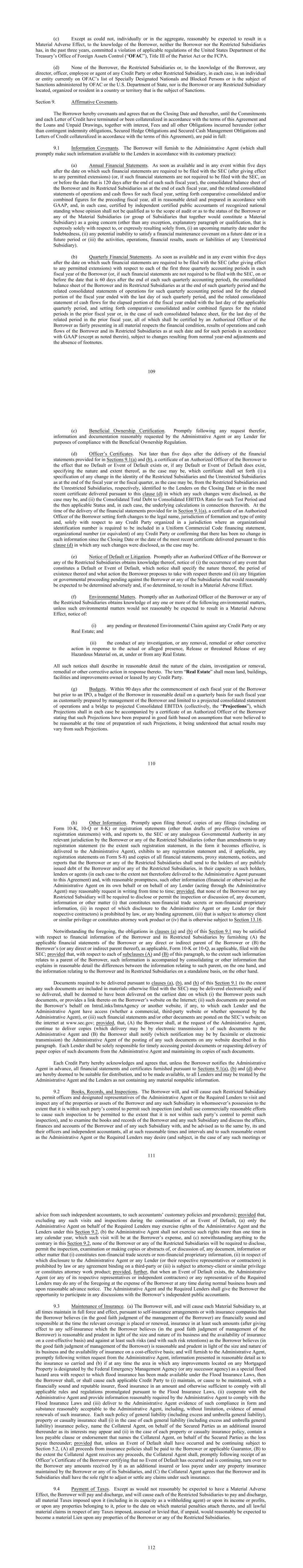(c) Except as could not, individually or in the aggregate, reasonably be expected to result in aMaterial Adverse Effect, to the knowledge of the Borrower, neither the Borrower nor the Restricted Subsidiarieshas, in the past three years, committed a violation of applicable regulations of the United States Department of theTreasury’s Office of Foreign Assets Control (“OFAC”), Title III of the Patriot Act or the FCPA.(d) None of the Borrower, the Restricted Subsidiaries or, to the knowledge of the Borrower, anydirector, officer, employee or agent of any Credit Party or other Restricted Subsidiary, in each case, is an individualor entity currently on OFAC’s list of Specially Designated Nationals and Blocked Persons or is the subject ofSanctions administered by OFAC or the U.S. Department of State, nor is the Borrower or any Restricted Subsidiarylocated, organized or resident in a country or territory that is the subject of Sanctions.Section 9. Affirmative Covenants.The Borrower hereby covenants and agrees that on the Closing Date and thereafter, until the Commitmentsand each Letter of Credit have terminated or been collateralized in accordance with the terms of this Agreement andthe Loans and Unpaid Drawings, together with interest, Fees and all other Obligations incurred hereunder (otherthan contingent indemnity obligations, Secured Hedge Obligations and Secured Cash Management Obligations andLetters of Credit collateralized in accordance with the terms of this Agreement), are paid in full:9.1 Information Covenants. The Borrower will furnish to the Administrative Agent (which shallpromptly make such information available to the Lenders in accordance with its customary practice):(a) Annual Financial Statements. As soon as available and in any event within five daysafter the date on which such financial statements are required to be filed with the SEC (after giving effectto any permitted extensions) (or, if such financial statements are not required to be filed with the SEC, onor before the date that is 120 days after the end of each such fiscal year), the consolidated balance sheet ofthe Borrower and its Restricted Subsidiaries as at the end of each fiscal year, and the related consolidatedstatements of operations and cash flows for such fiscal year, setting forth comparative consolidated and/orcombined figures for the preceding fiscal year, all in reasonable detail and prepared in accordance withGAAP, and, in each case, certified by independent certified public accountants of recognized nationalstanding whose opinion shall not be qualified as to the scope of audit or as to the status of the Borrower orany of the Material Subsidiaries (or group of Subsidiaries that together would constitute a MaterialSubsidiary) as a going concern (other than any exception, explanatory paragraph or qualification, that isexpressly solely with respect to, or expressly resulting solely from, (i) an upcoming maturity date under theIndebtedness, (ii) any potential inability to satisfy a financial maintenance covenant on a future date or in afuture period or (iii) the activities, operations, financial results, assets or liabilities of any UnrestrictedSubsidiary).(b) Quarterly Financial Statements. As soon as available and in any event within five daysafter the date on which such financial statements are required to be filed with the SEC (after giving effectto any permitted extensions) with respect to each of the first three quarterly accounting periods in eachfiscal year of the Borrower (or, if such financial statements are not required to be filed with the SEC, on orbefore the date that is 60 days after the end of each such quarterly accounting period), the consolidatedbalance sheet of the Borrower and its Restricted Subsidiaries as at the end of such quarterly period and therelated consolidated statements of operations for such quarterly accounting period and for the elapsedportion of the fiscal year ended with the last day of such quarterly period, and the related consolidatedstatement of cash flows for the elapsed portion of the fiscal year ended with the last day of the applicablequarterly period, and setting forth comparative consolidated and/or combined figures for the relatedperiods in the prior fiscal year or, in the case of such consolidated balance sheet, for the last day of therelated period in the prior fiscal year, all of which shall be certified by an Authorized Officer of theBorrower as fairly presenting in all material respects the financial condition, results of operations and cashflows of the Borrower and its Restricted Subsidiaries as at such date and for such periods in accordancewith GAAP (except as noted therein), subject to changes resulting from normal year-end adjustments andthe absence of footnotes. 109 (c) Beneficial Ownership Certification. Promptly following any request therefor,information and documentation reasonably requested by the Administrative Agent or any Lender forpurposes of compliance with the Beneficial Ownership Regulation.(d) Officer’s Certificates. Not later than five days after the delivery of the financialstatements provided for in Sections 9.1(a) and (b), a certificate of an Authorized Officer of the Borrower tothe effect that no Default or Event of Default exists or, if any Default or Event of Default does exist,specifying the nature and extent thereof, as the case may be, which certificate shall set forth (i) aspecification of any change in the identity of the Restricted Subsidiaries and the Unrestricted Subsidiariesas at the end of the fiscal year or the fiscal quarter, as the case may be, from the Restricted Subsidiaries andthe Unrestricted Subsidiaries, respectively, identified to the Lenders on the Closing Date or in the mostrecent certificate delivered pursuant to this clause (d) in which any such changes were disclosed, as thecase may be, and (ii) the Consolidated Total Debt to Consolidated EBITDA Ratio for such Test Period andthe then applicable St