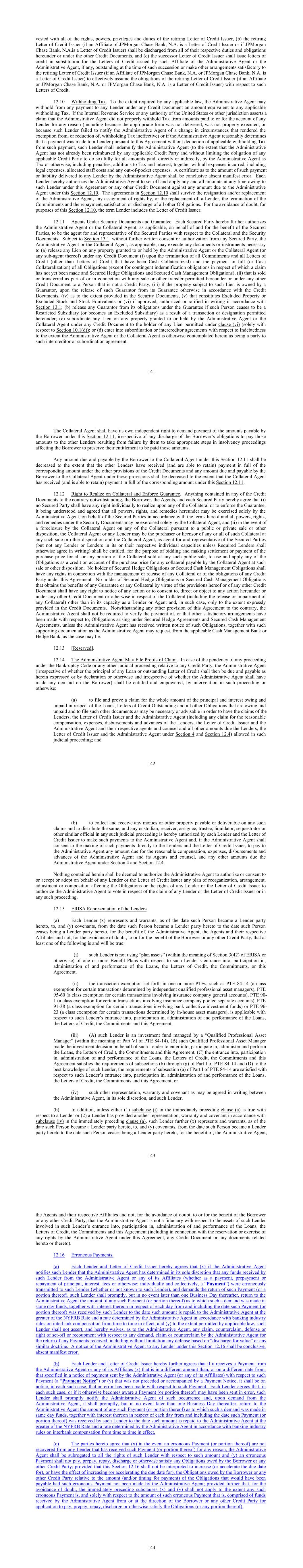 vested with all of the rights, powers, privileges and duties of the retiring Letter of Credit Issuer, (b) the retiringLetter of Credit Issuer (if an Affiliate of JPMorgan Chase Bank, N.A. is a Letter of Credit Issuer or if JPMorganChase Bank, N.A.is a Letter of Credit Issuer) shall be discharged from all of their respective duties and obligationshereunder or under the other Credit Documents, and (c) the successor Letter of Credit Issuer shall issue letters ofcredit in substitution for the Letters of Credit issued by such Affiliate of the Administrative Agent or theAdministrative Agent, if any, outstanding at the time of such succession or make other arrangements satisfactory tothe retiring Letter of Credit Issuer (if an Affiliate of JPMorgan Chase Bank, N.A. or JPMorgan Chase Bank, N.A. isa Letter of Credit Issuer) to effectively assume the obligations of the retiring Letter of Credit Issuer (if an Affiliateor JPMorgan Chase Bank, N.A. or JPMorgan Chase Bank, N.A. is a Letter of Credit Issuer) with respect to suchLetters of Credit.12.10 Withholding Tax. To the extent required by any applicable law, the Administrative Agent maywithhold from any payment to any Lender under any Credit Document an amount equivalent to any applicablewithholding Tax. If the Internal Revenue Service or any authority of the United States or other jurisdiction asserts aclaim that the Administrative Agent did not properly withhold Tax from amounts paid to or for the account of anyLender for any reason (including because the appropriate form was not delivered, was not properly executed, orbecause such Lender failed to notify the Administrative Agent of a change in circumstances that rendered theexemption from, or reduction of, withholding Tax ineffective) or if the Administrative Agent reasonably determinesthat a payment was made to a Lender pursuant to this Agreement without deduction of applicable withholding Taxfrom such payment, such Lender shall indemnify the Administrative Agent (to the extent that the AdministrativeAgent has not already been reimbursed by any applicable Credit Party and without limiting the obligation of anyapplicable Credit Party to do so) fully for all amounts paid, directly or indirectly, by the Administrative Agent asTax or otherwise, including penalties, additions to Tax and interest, together with all expenses incurred, includinglegal expenses, allocated staff costs and any out-of-pocket expenses. A certificate as to the amount of such paymentor liability delivered to any Lender by the Administrative Agent shall be conclusive absent manifest error. EachLender hereby authorizes the Administrative Agent to set off and apply any and all amounts at any time owing tosuch Lender under this Agreement or any other Credit Document against any amount due to the AdministrativeAgent under this Section 12.10. The agreements in Section 12.10 shall survive the resignation and/or replacementof the Administrative Agent, any assignment of rights by, or the replacement of, a Lender, the termination of theCommitments and the repayment, satisfaction or discharge of all other Obligations. For the avoidance of doubt, forpurposes of this Section 12.10, the term Lender includes the Letter of Credit Issuer.12.11 Agents Under Security Documents and Guarantee. Each Secured Party hereby further authorizesthe Administrative Agent or the Collateral Agent, as applicable, on behalf of and for the benefit of the SecuredParties, to be the agent for and representative of the Secured Parties with respect to the Collateral and the SecurityDocuments. Subject to Section 13.1, without further written consent or authorization from any Secured Party, theAdministrative Agent or the Collateral Agent, as applicable, may execute any documents or instruments necessaryto (a) release any Lien on any property granted to or held by the Administrative Agent or the Collateral Agent (orany sub-agent thereof) under any Credit Document (i) upon the termination of all Commitments and all Letters ofCredit (other than Letters of Credit that have been Cash Collateralized) and the payment in full (or CashCollateralization) of all Obligations (except for contingent indemnification obligations in respect of which a claimhas not yet been made and Secured Hedge Obligations and Secured Cash Management Obligations), (ii) that is soldor transferred as part of or in connection with any sale or other transfer permitted hereunder or under any otherCredit Document to a Person that is not a Credit Party, (iii) if the property subject to such Lien is owned by aGuarantor, upon the release of such Guarantor from its Guarantee otherwise in accordance with the CreditDocuments, (iv) as to the extent provided in the Security Documents, (v) that constitutes Excluded Property orExcluded Stock and Stock Equivalents or (vi) if approved, authorized or ratified in writing in accordance withSection 13.1; (b) release any Guarantor from its obligations under the Guarantee if such Person ceases to be aRestricted Subsidiary (or becomes an Excluded Subsidiary) as a result of a transaction or designation permittedhereunder; (c) subordinate any Lien on any property granted to or held by the Administrative Agent or theCollateral Agent under any Credit Document to the holder of any Lien permitted under clause (vi) (solely withrespect to Section 10.1(d)); or (d) enter into subordination or intercreditor agreements with respect to Indebtednessto the extent the Administrative Agent or the Collateral Agent is otherwise contemplated herein as being a party tosuch intercreditor or subordination agreement. 141 The Collateral Agent shall have its own independent right to demand payment of the amounts payable bythe Borrower under this Section 12.11, irrespective of any discharge of the Borrower’s obligations to pay thoseamounts to the other Lenders resulting from failure by them to take appropriate steps in insolvency proceedingsaffecting the Borrower to preserve their entitlement to be 