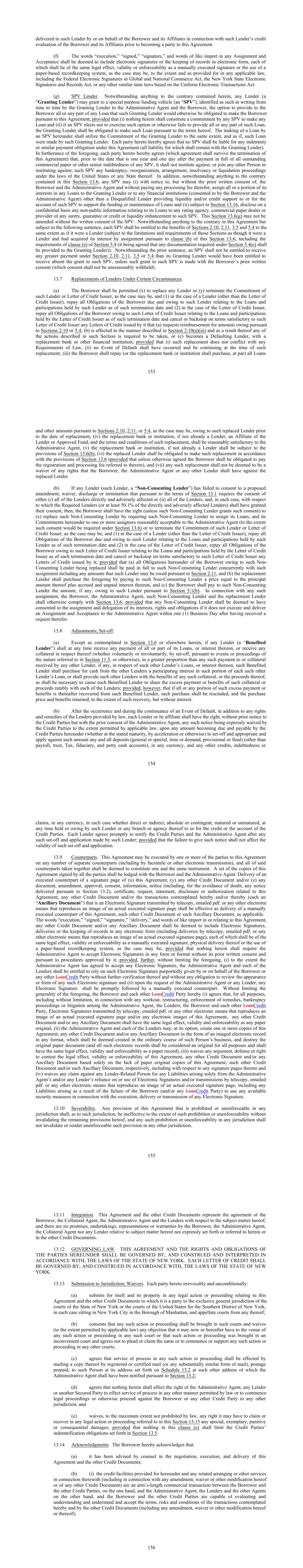 delivered to such Lender by or on behalf of the Borrower and its Affiliates in connection with such Lender’s creditevaluation of the Borrower and its Affiliates prior to becoming a party to this Agreement.(f) The words “execution,” “signed,” “signature,” and words of like import in any Assignment andAcceptance shall be deemed to include electronic signatures or the keeping of records in electronic form, each ofwhich shall be of the same legal effect, validity or enforceability as a manually executed signature or the use of apaper-based recordkeeping system, as the case may be, to the extent and as provided for in any applicable law,including the Federal Electronic Signatures in Global and National Commerce Act, the New York State ElectronicSignatures and Records Act, or any other similar state laws based on the Uniform Electronic Transactions Act.(g) SPV Lender. Notwithstanding anything to the contrary contained herein, any Lender (a“Granting Lender”) may grant to a special purpose funding vehicle (an “SPV”), identified as such in writing fromtime to time by the Granting Lender to the Administrative Agent and the Borrower, the option to provide to theBorrower all or any part of any Loan that such Granting Lender would otherwise be obligated to make the Borrowerpursuant to this Agreement; provided that (i) nothing herein shall constitute a commitment by any SPV to make anyLoan and (ii) if an SPV elects not to exercise such option or otherwise fails to provide all or any part of such Loan,the Granting Lender shall be obligated to make such Loan pursuant to the terms hereof. The making of a Loan byan SPV hereunder shall utilize the Commitment of the Granting Lender to the same extent, and as if, such Loanwere made by such Granting Lender. Each party hereto hereby agrees that no SPV shall be liable for any indemnityor similar payment obligation under this Agreement (all liability for which shall remain with the Granting Lender).In furtherance of the foregoing, each party hereto hereby agrees (which agreement shall survive the termination ofthis Agreement) that, prior to the date that is one year and one day after the payment in full of all outstandingcommercial paper or other senior indebtedness of any SPV, it shall not institute against, or join any other Person ininstituting against, such SPV any bankruptcy, reorganization, arrangement, insolvency or liquidation proceedingsunder the laws of the United States or any State thereof. In addition, notwithstanding anything to the contrarycontained in this Section 13.6, any SPV may (i) with notice to, but without the prior written consent of, theBorrower and the Administrative Agent and without paying any processing fee therefor, assign all or a portion of itsinterests in any Loans to the Granting Lender or to any financial institutions (consented to by the Borrower and theAdministrative Agent) other than a Disqualified Lender providing liquidity and/or credit support to or for theaccount of such SPV to support the funding or maintenance of Loans and (ii) subject to Section 13.16, disclose on aconfidential basis any non-public information relating to its Loans to any rating agency, commercial paper dealer orprovider of any surety, guarantee or credit or liquidity enhancement to such SPV. This Section 13.6(g) may not beamended without the written consent of the SPV. Notwithstanding anything to the contrary in this Agreement butsubject to the following sentence, each SPV shall be entitled to the benefits of Sections 2.10, 2.11, 3.5 and 5.4 to thesame extent as if it were a Lender (subject to the limitations and requirements of those Sections as though it were aLender and had acquired its interest by assignment pursuant to clause (b) of this Section 13.6, including therequirements of clause (e) of Section 5.4 (it being agreed that any documentation required under Section 5.4(e) shallbe provided to the Granting Lender)). Notwithstanding the prior sentence, an SPV shall not be entitled to receiveany greater payment under Section 2.10, 2.11, 3.5 or 5.4 than its Granting Lender would have been entitled toreceive absent the grant to such SPV, unless such grant to such SPV is made with the Borrower’s prior writtenconsent (which consent shall not be unreasonably withheld).13.7 Replacements of Lenders Under Certain Circumstances.(a) The Borrower shall be permitted (x) to replace any Lender or (y) terminate the Commitment ofsuch Lender or Letter of Credit Issuer, as the case may be, and (1) in the case of a Lender (other than the Letter ofCredit Issuer), repay all Obligations of the Borrower due and owing to such Lender relating to the Loans andparticipations held by such Lender as of such termination date and (2) in the case of the Letter of Credit Issuer,repay all Obligations of the Borrower owing to such Letter of Credit Issuer relating to the Loans and participationsheld by the Letter of Credit Issuer as of such termination date and cancel or backstop on terms satisfactory to suchLetter of Credit Issuer any Letters of Credit issued by it that (a) requests reimbursement for amounts owing pursuantto Sections 2.10 or 5.4, (b) is affected in the manner described in Section 2.10(a)(iii) and as a result thereof any ofthe actions described in such Section is required to be taken, or (c) becomes a Defaulting Lender, with areplacement bank or other financial institution; provided that (i) such replacement does not conflict with anyRequirements of Law, (ii) no Event of Default shall have occurred and be continuing at the time of suchreplacement, (iii) the Borrower shall repay (or the replacement bank or institution shall purchase, at par) all Loans153 and other amounts pursuant to Sections 2.10, 2.11, or 5.4, as the case may be, owing to such replaced Lender priorto the date of replacement, (iv) the replacement bank or institution, if not already a Lender, an Affiliate of theLender or Approved Fund, and the terms and conditions of such repl