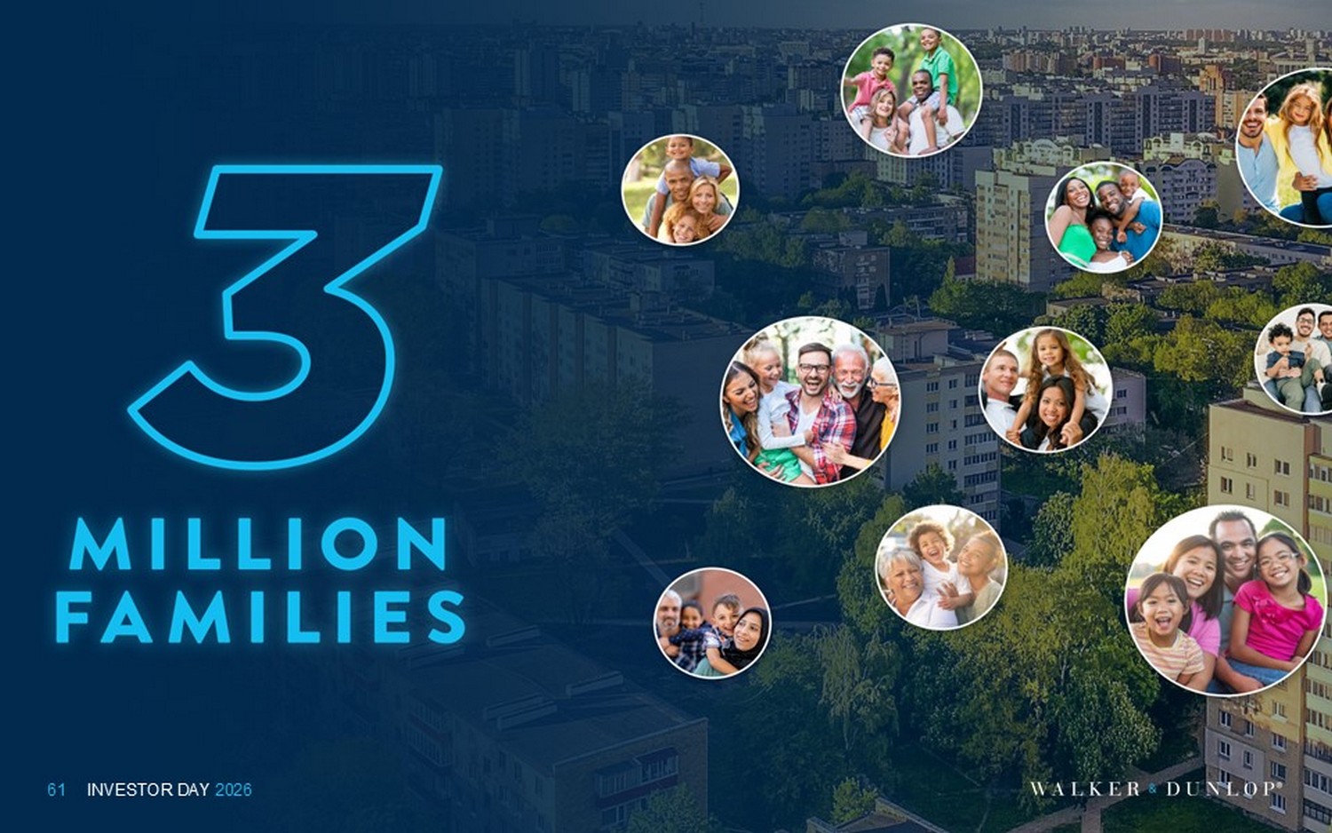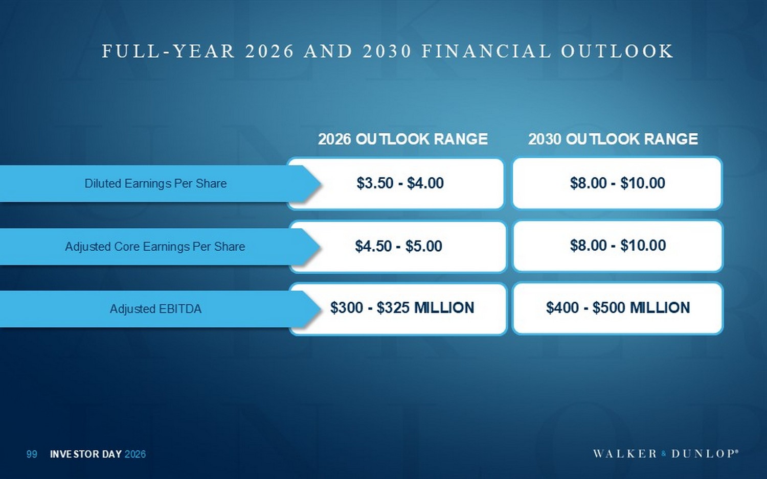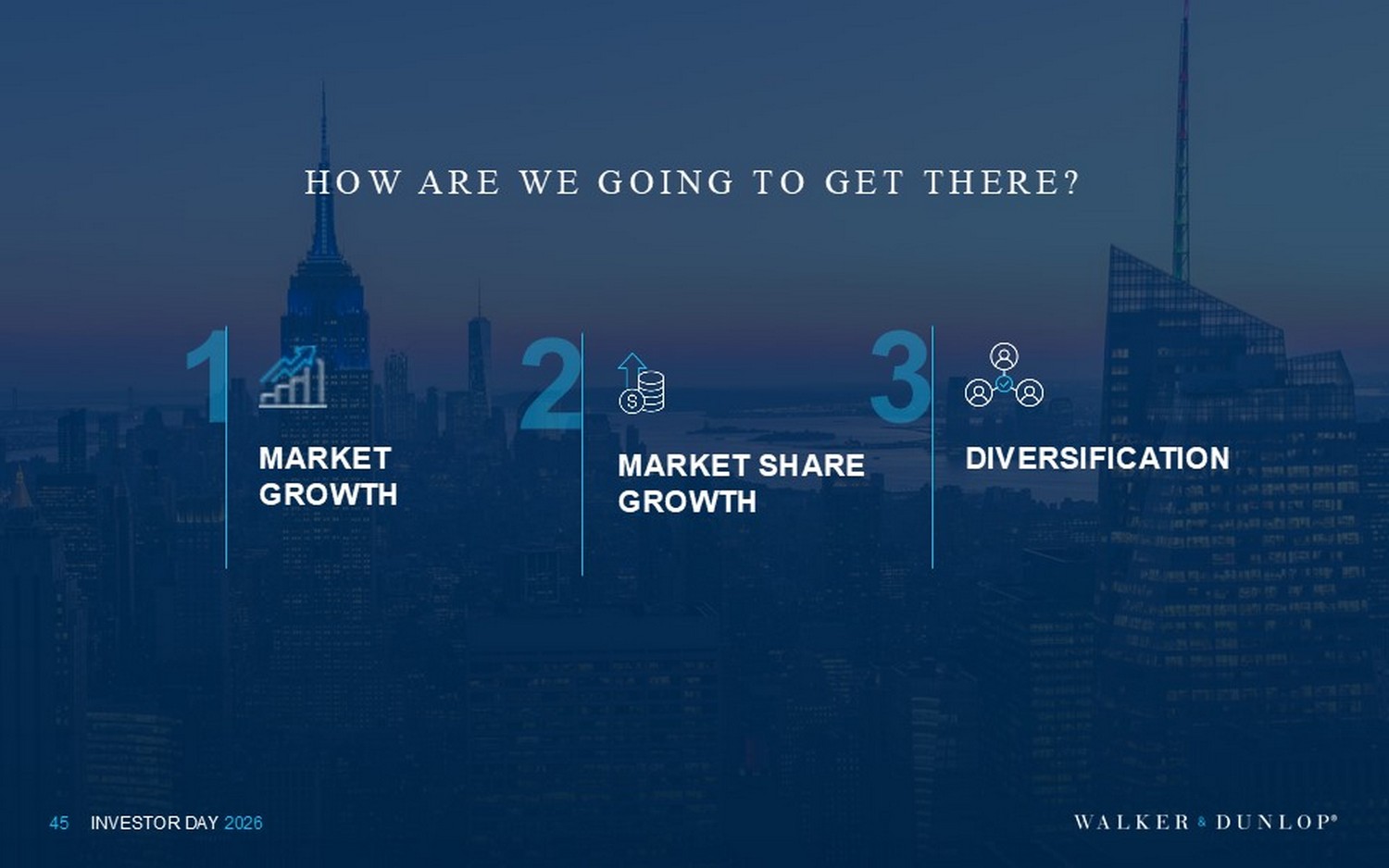 2 INVESTOR DAY 2026 Forward - Looking Statements Some of the statements contained in this presentation may constitute forward - looking statements within the meaning of the federal securities laws. Forward - looking statements relate to expectations, projections, plans and strategies, anticipated events or trends and similar expressions concerning matters that are not historical facts. In some cases, you can identify forward - looking statements by the use of forward - looking terminology such as ''may,'' ''will,'' ''should,'' ''expects,'' ''intends,'' ''plans,'' ''anticipates,'' ''believes,'' ''estimates,'' ''predicts,'' or ''potential'' or the negative of these words and phrases or similar words or phrases that are predictions of or indicate future events or trends and which do not relate solely to historical matters. You can also identify forward - looking statements by discussions of strategy, plans or intentions. The forward - looking statements contained in this presentation reflect our current views about future events and are subject to numerous known and unknown risks, uncertainties, assumptions and changes in circumstances that may cause actual results to differ significantly from those expressed or contemplated in any forward - looking statement. While forward - looking statements reflect our good faith projections, assumptions and expectations, they are not guarantees of fu ture results. Furthermore, we disclaim any obligation to publicly update or revise any forward - looking statement to reflect changes in underlying assumptions or factors, new information, data or methods, future events or other changes, except as req uir ed by applicable law. Factors that could cause our results to differ materially include, but are not limited to: (1) general economic conditions and multifamily and commercial real estate market conditions, (2) changes in interest rates, (3) regulatory and/or legislative changes to Freddie Mac, Fannie Mae or HUD, (4) our ability to retain and attract loan originators and other professionals, (5) success of our various investments funded with corporate capital, (6) changes in federal government fis cal and monetary policies, including any constraints or cuts in federal funds allocated to HUD for loan originations, and (7) our obligations to repurchase or indemnify the GSEs for loans we originate under their programs, including additional charges or losses related to loans we have already repurchased or indemnified and new repurchase requests we may receive from the GSEs related to the previously identified instances of borrower fraud, additional instances of borrower fraud, or other r eas ons. For a further discussion of these and other factors that could cause future results to differ materially from those expressed or contemplated in any forward - looking statements, see the section titled ''Risk Factors" in our most recent Annual Report on Form 10 - K, as it may be updated or supplemented by our subsequent Quarterly Reports on Form 10 - Q and other SEC filings. Such filings are available publicly on our Investor Relations web page at www.walkerdunlop.com . Non - GAAP Financial Measures To supplement our financial statements presented in accordance with United States generally accepted accounting principles (“ GAA P”), the Company uses adjusted EBITDA, adjusted core net income, adjusted core EPS, net income excluding charges, diluted EPS excluding charges, and adjusted EBITDA excluding charges, which are non - GAAP financial measures. The presen tation of these non - GAAP financial measures is not intended to be considered in isolation or as a substitute for, or superior to, the financial information prepared and presented in accordance with GAAP. When analyzing our operating performan ce, readers should use adjusted EBITDA, adjusted core net income, adjusted core EPS, diluted EPS excluding charges, and adjusted EBITDA excluding charges, in addition to, and not as an alternative for, net income and diluted EPS. Adjusted EBITDA represents net income before income taxes, interest expense on our corporate debt, and amortization and depre cia tion, adjusted for provision (benefit) for credit losses, net write - offs based on the final resolution of the defaulted loans or collateral, loan repurchase losses, stock - based compensation, the fair value of expected net cash flows from servicing, net, the write - off of the unamortized balance of deferred issuance costs associated with the repayment of a portion of our corporate debt, goodwill impairment, and contingent consideration liability fair value adjustments when the fair value adjust men t is a triggering event for a goodwill impairment assessment. Adjusted core net income and adjusted core EPS represent net income adjusted for amortization and depreciation, provision (be nef it) for credit losses, net write - offs based on the final resolution of the defaulted loans or collateral, the fair value of expected net cash flows from servicing, net, the income statement impact from periodic revaluation and accretion associated w ith contingent consideration liabilities related to acquired companies, goodwill impairment, and other adjustments. Net income excluding charges and diluted EPS excluding charges represent net income excluding indemnified and repurchased loa n e xpenses and asset impairments and other expenses. Adjusted EBITDA excluding charges represents net income before income taxes, interest expense on our corporate debt, and amor tiz ation and depreciation, adjusted for provision (benefit) for credit losses, net write - offs based on the final resolution of the defaulted loans or collateral, loan repurchase losses, stock - based compensation, the fair value of expected net cash flows f rom servicing, net, goodwill impairment, contingent consideration liability fair value adjustments when the fair value adjustment is a triggering event for a goodwill impairment assessment, indemnified and repurc