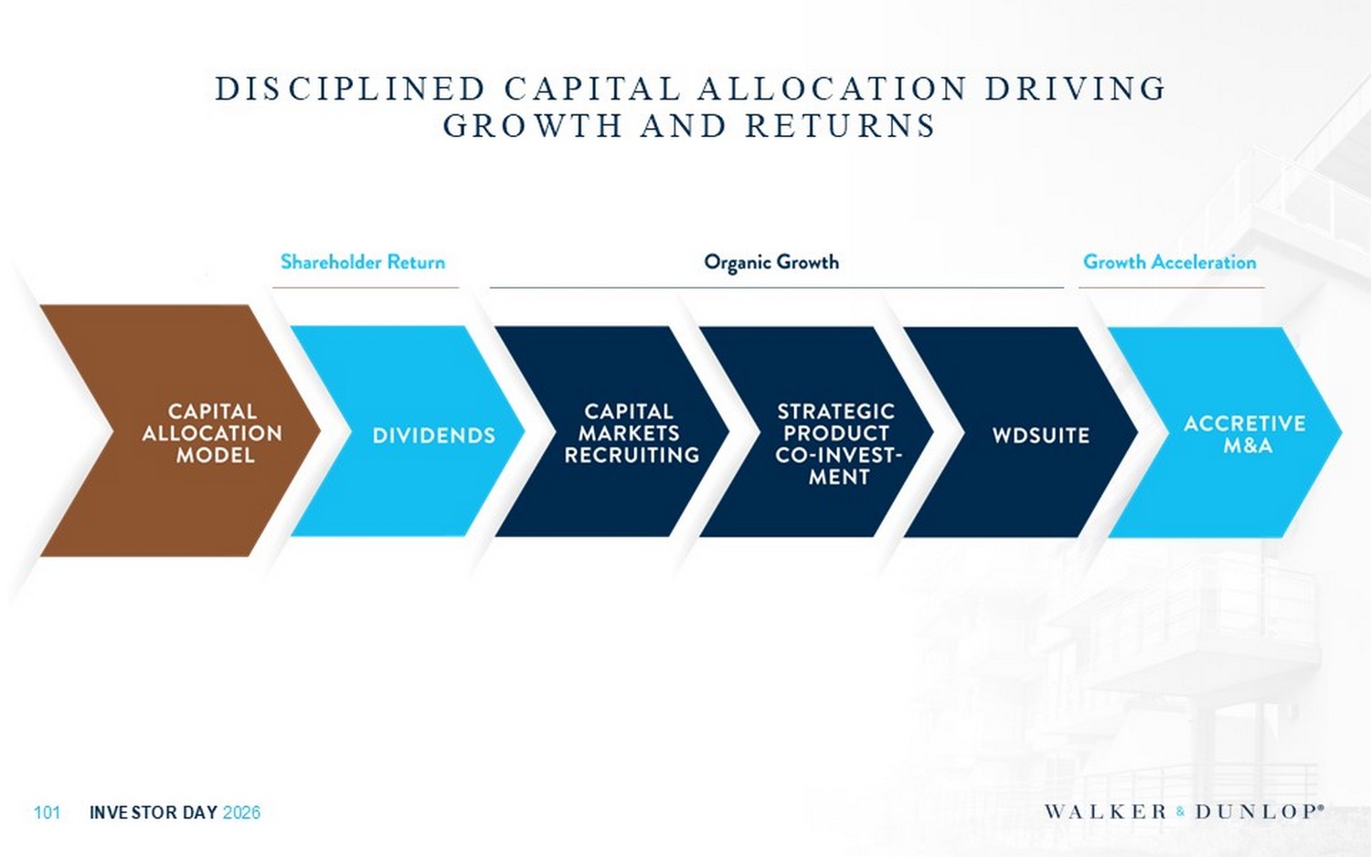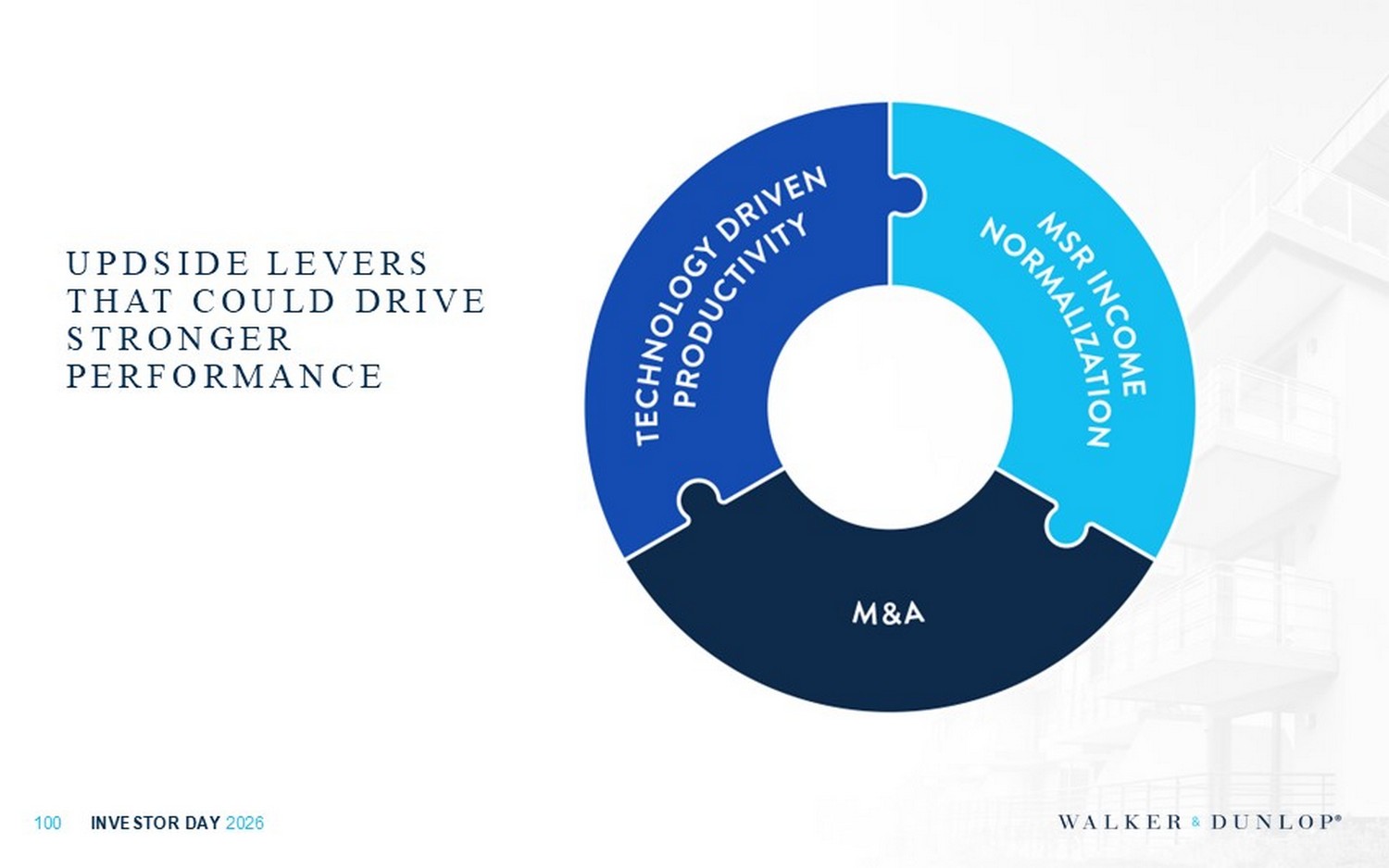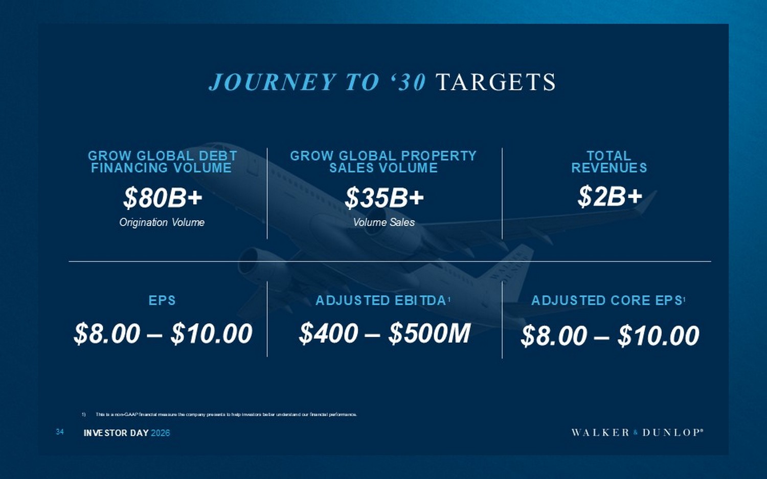2 INVESTOR DAY 2026 Forward - Looking Statements Some of the statements contained in this presentation may constitute forward - looking statements within the meaning of the federal securities laws. Forward - looking statements relate to expectations, projections, plans and strategies, anticipated events or trends and similar expressions concerning matters that are not historical facts. In some cases, you can identify forward - looking statements by the use of forward - looking terminology such as ''may,'' ''will,'' ''should,'' ''expects,'' ''intends,'' ''plans,'' ''anticipates,'' ''believes,'' ''estimates,'' ''predicts,'' or ''potential'' or the negative of these words and phrases or similar words or phrases that are predictions of or indicate future events or trends and which do not relate solely to historical matters. You can also identify forward - looking statements by discussions of strategy, plans or intentions. The forward - looking statements contained in this presentation reflect our current views about future events and are subject to numerous known and unknown risks, uncertainties, assumptions and changes in circumstances that may cause actual results to differ significantly from those expressed or contemplated in any forward - looking statement. While forward - looking statements reflect our good faith projections, assumptions and expectations, they are not guarantees of fu ture results. Furthermore, we disclaim any obligation to publicly update or revise any forward - looking statement to reflect changes in underlying assumptions or factors, new information, data or methods, future events or other changes, except as req uir ed by applicable law. Factors that could cause our results to differ materially include, but are not limited to: (1) general economic conditions and multifamily and commercial real estate market conditions, (2) changes in interest rates, (3) regulatory and/or legislative changes to Freddie Mac, Fannie Mae or HUD, (4) our ability to retain and attract loan originators and other professionals, (5) success of our various investments funded with corporate capital, (6) changes in federal government fis cal and monetary policies, including any constraints or cuts in federal funds allocated to HUD for loan originations, and (7) our obligations to repurchase or indemnify the GSEs for loans we originate under their programs, including additional charges or losses related to loans we have already repurchased or indemnified and new repurchase requests we may receive from the GSEs related to the previously identified instances of borrower fraud, additional instances of borrower fraud, or other r eas ons. For a further discussion of these and other factors that could cause future results to differ materially from those expressed or contemplated in any forward - looking statements, see the section titled ''Risk Factors" in our most recent Annual Report on Form 10 - K, as it may be updated or supplemented by our subsequent Quarterly Reports on Form 10 - Q and other SEC filings. Such filings are available publicly on our Investor Relations web page at www.walkerdunlop.com . Non - GAAP Financial Measures To supplement our financial statements presented in accordance with United States generally accepted accounting principles (“ GAA P”), the Company uses adjusted EBITDA, adjusted core net income, adjusted core EPS, net income excluding charges, diluted EPS excluding charges, and adjusted EBITDA excluding charges, which are non - GAAP financial measures. The presen tation of these non - GAAP financial measures is not intended to be considered in isolation or as a substitute for, or superior to, the financial information prepared and presented in accordance with GAAP. When analyzing our operating performan ce, readers should use adjusted EBITDA, adjusted core net income, adjusted core EPS, diluted EPS excluding charges, and adjusted EBITDA excluding charges, in addition to, and not as an alternative for, net income and diluted EPS. Adjusted EBITDA represents net income before income taxes, interest expense on our corporate debt, and amortization and depre cia tion, adjusted for provision (benefit) for credit losses, net write - offs based on the final resolution of the defaulted loans or collateral, loan repurchase losses, stock - based compensation, the fair value of expected net cash flows from servicing, net, the write - off of the unamortized balance of deferred issuance costs associated with the repayment of a portion of our corporate debt, goodwill impairment, and contingent consideration liability fair value adjustments when the fair value adjust men t is a triggering event for a goodwill impairment assessment. Adjusted core net income and adjusted core EPS represent net income adjusted for amortization and depreciation, provision (be nef it) for credit losses, net write - offs based on the final resolution of the defaulted loans or collateral, the fair value of expected net cash flows from servicing, net, the income statement impact from periodic revaluation and accretion associated w ith contingent consideration liabilities related to acquired companies, goodwill impairment, and other adjustments. Net income excluding charges and diluted EPS excluding charges represent net income excluding indemnified and repurchased loa n e xpenses and asset impairments and other expenses. Adjusted EBITDA excluding charges represents net income before income taxes, interest expense on our corporate debt, and amor tiz ation and depreciation, adjusted for provision (benefit) for credit losses, net write - offs based on the final resolution of the defaulted loans or collateral, loan repurchase losses, stock - based compensation, the fair value of expected net cash flows f rom servicing, net, goodwill impairment, contingent consideration liability fair value adjustments when the fair value adjustment is a triggering event for a goodwill impairment assessment, indemnified and repurc